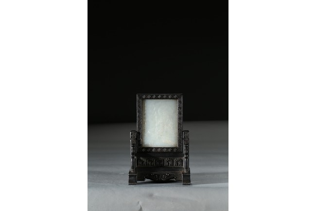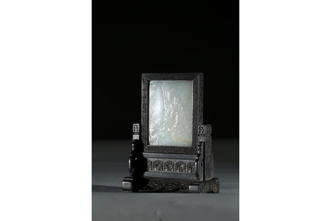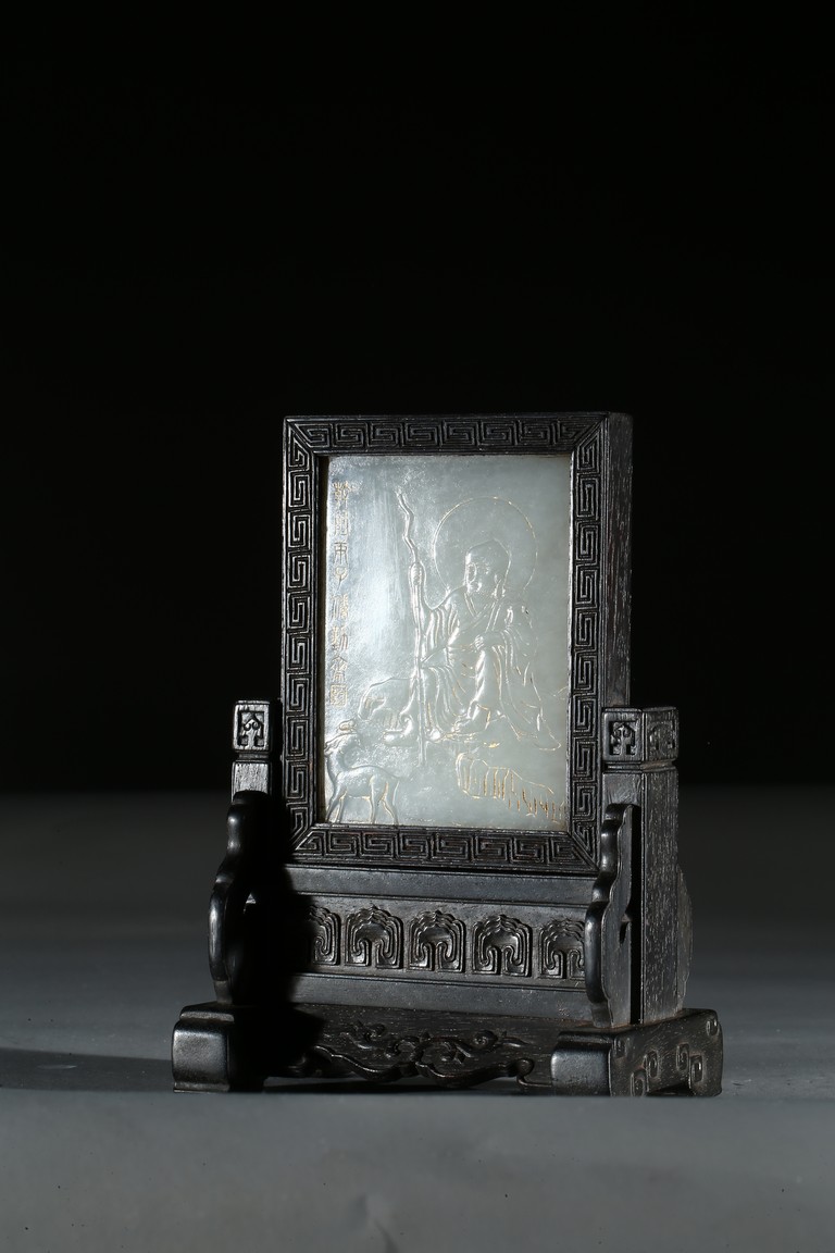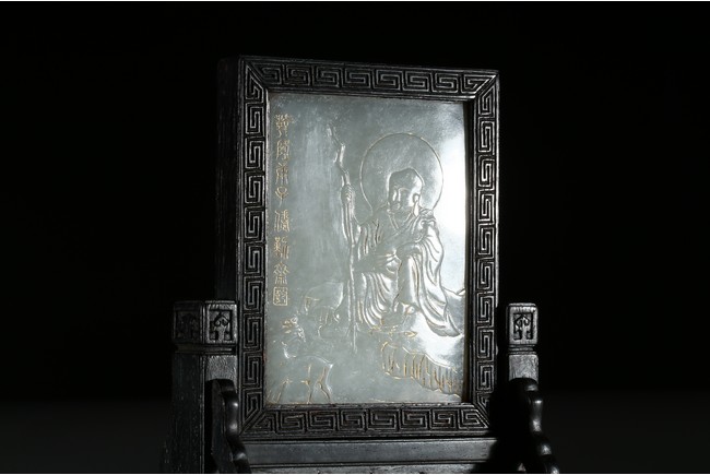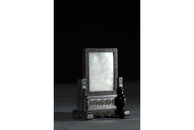 Of upright rectangular form, finely incised and carved in gilt with arhat and inscriptions, framed with zitan screen and stand. Qing Dynasty period.