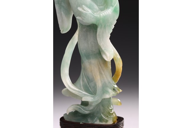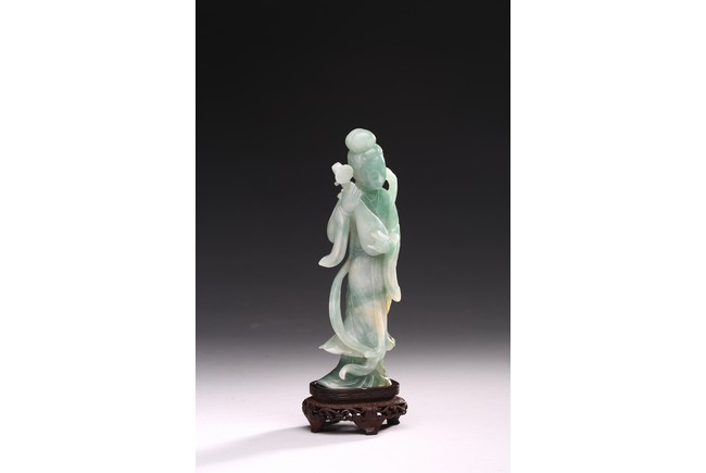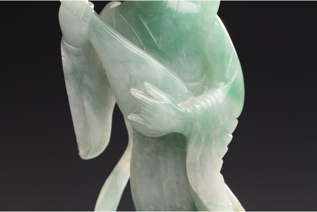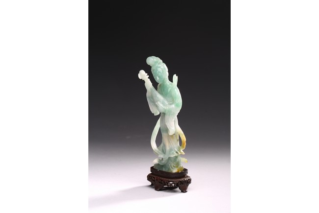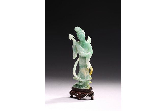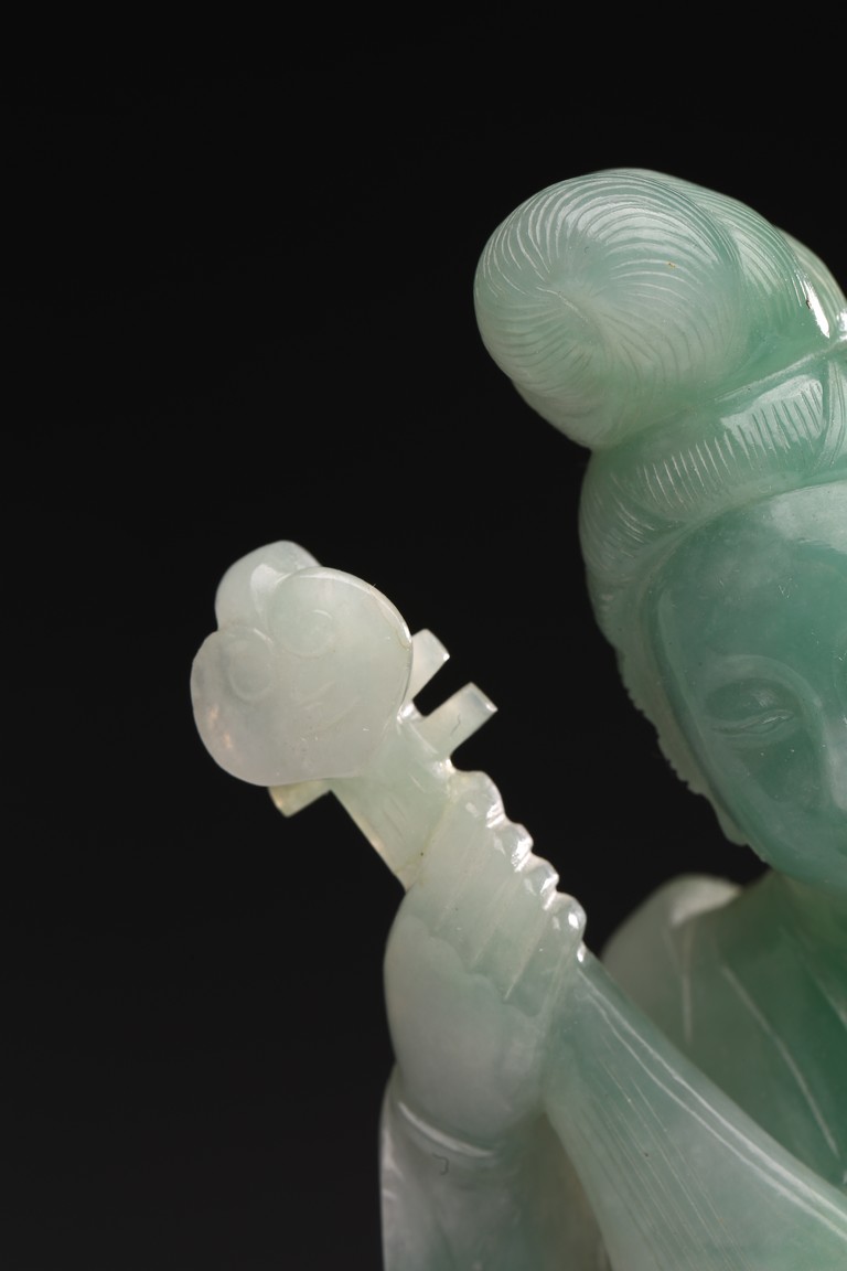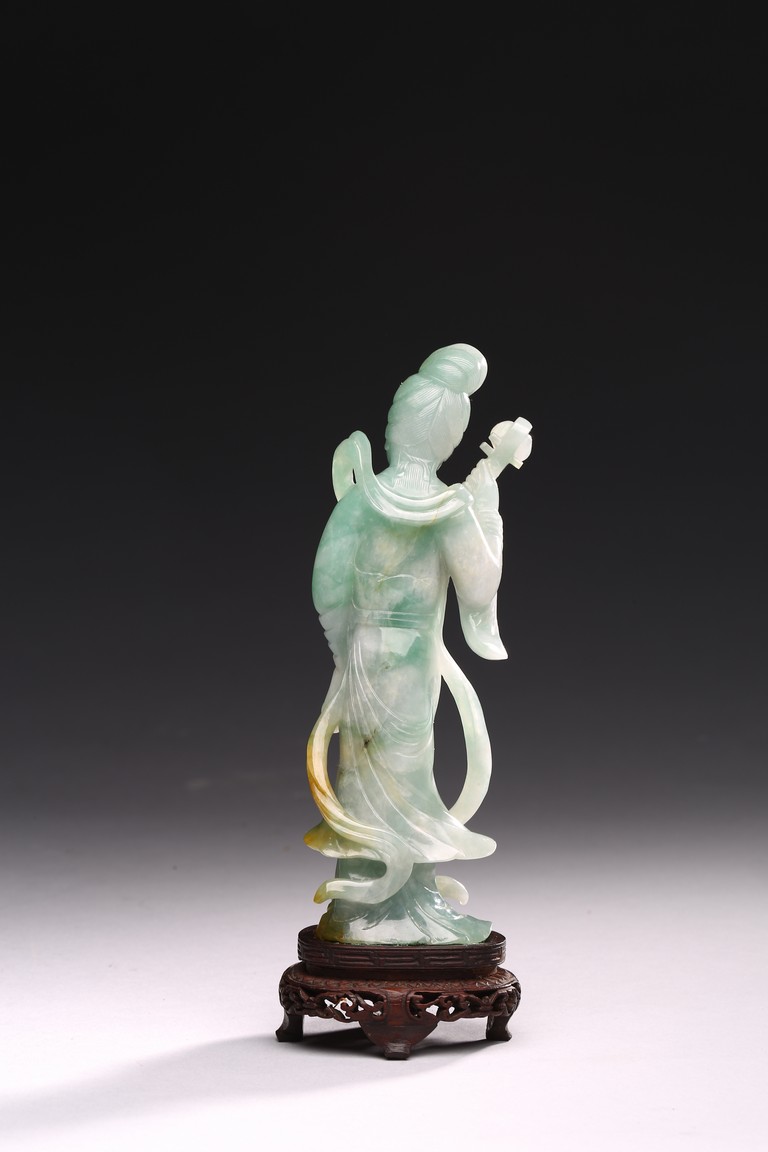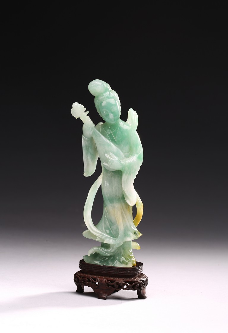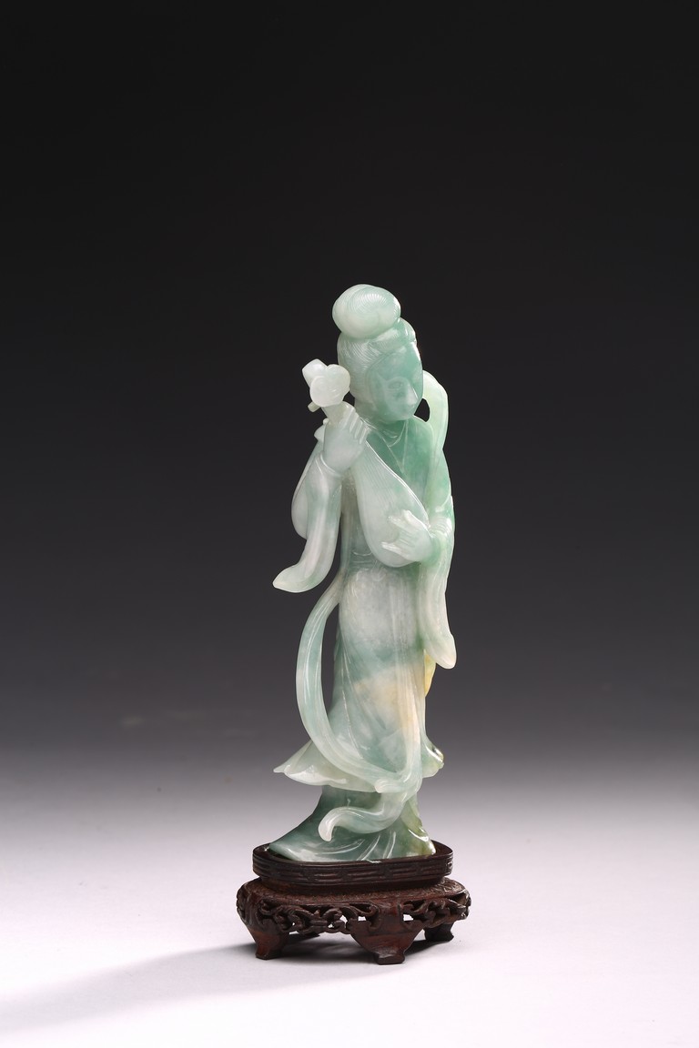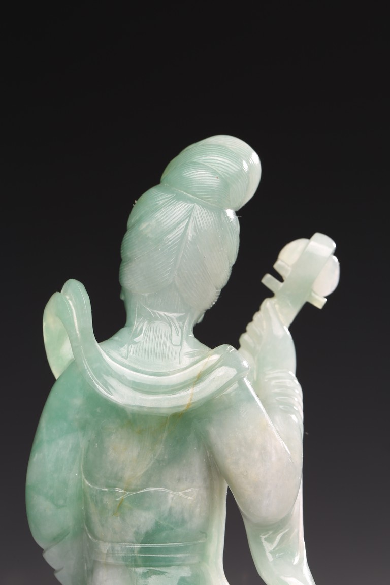 A JADEITE CARVED FIGURE OF GUANYIN WITH INSTRUMENT    清 翡翠雕琵琶仙女立像