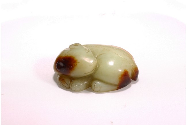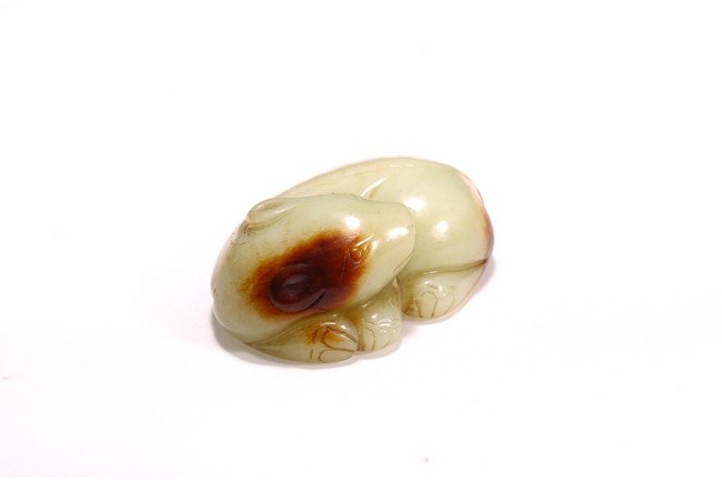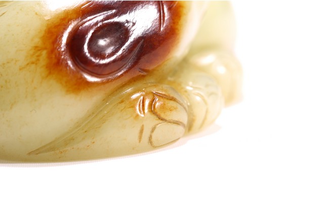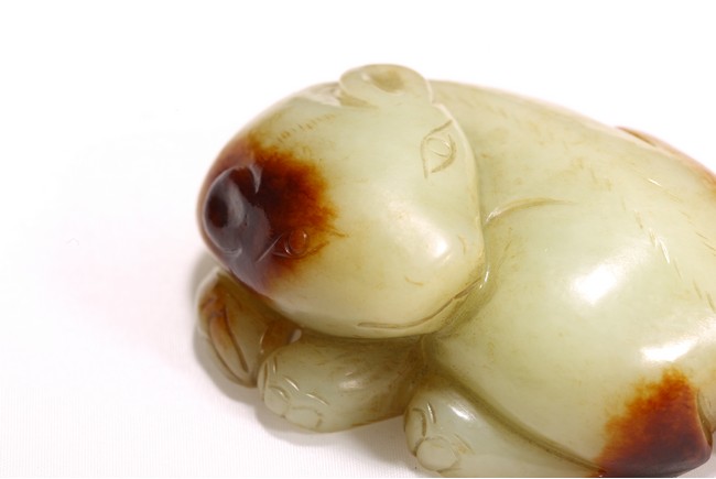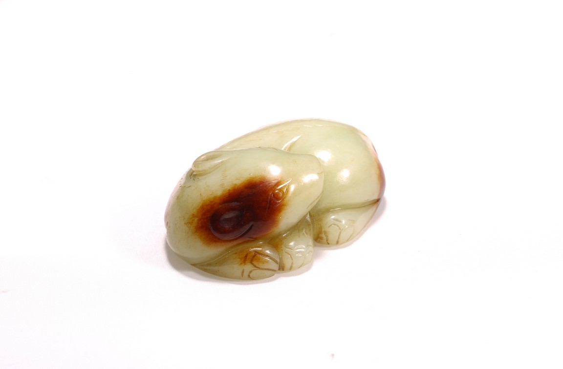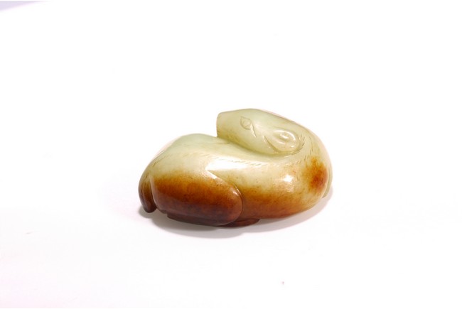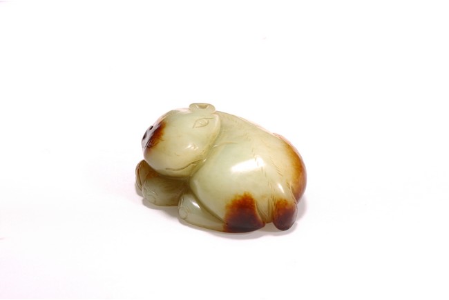The recumbent mythical beast shown with head turned to the side, the stone is light yellow with dark russet inclusions to the eye and tail. Qing Dynasty period.