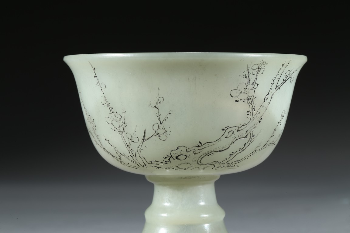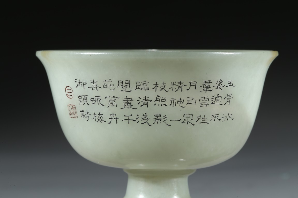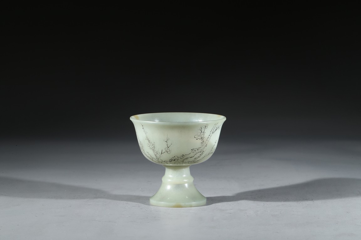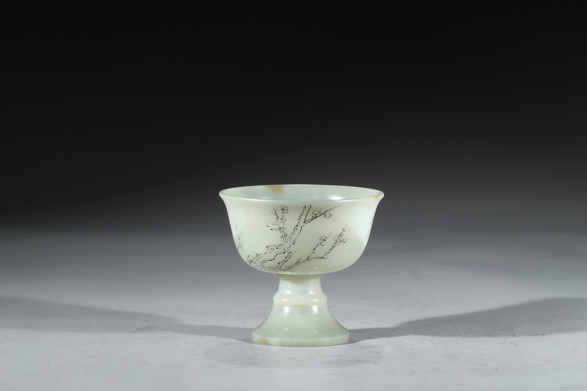 The cup finely incised with imperial poem to the exterior on one side, the other side with plum blossom, the base interior with four painted character Qianlong mark. Qing Dynasty period.