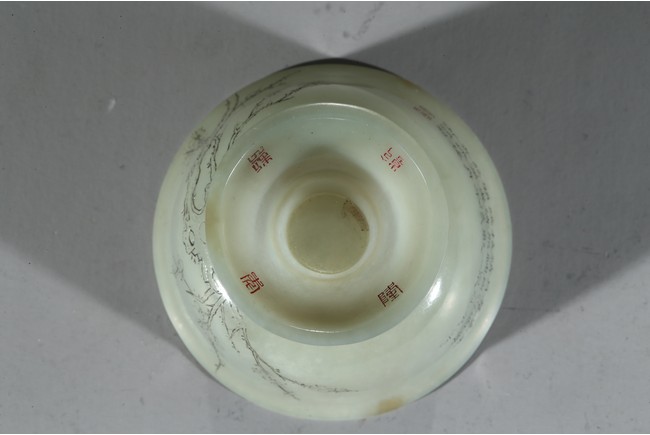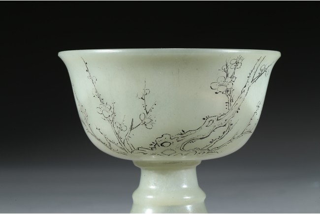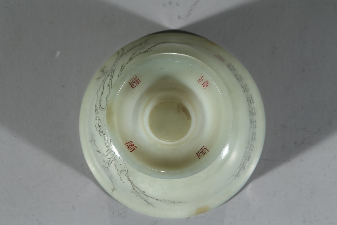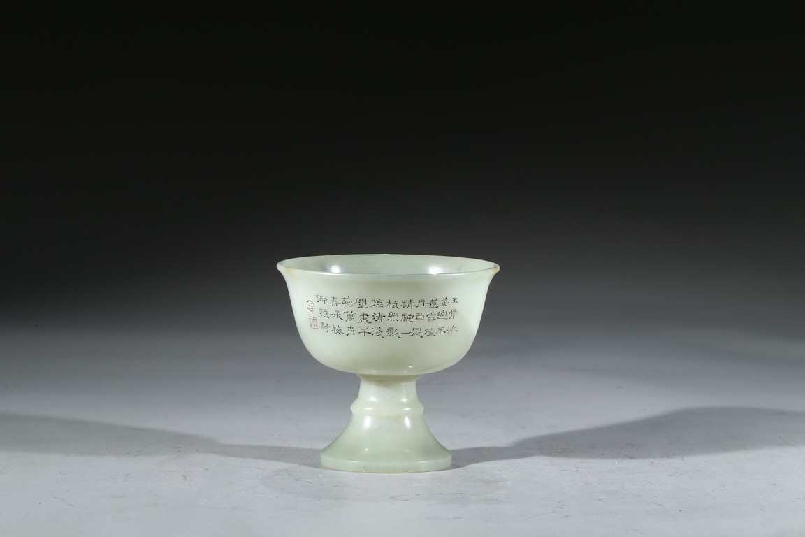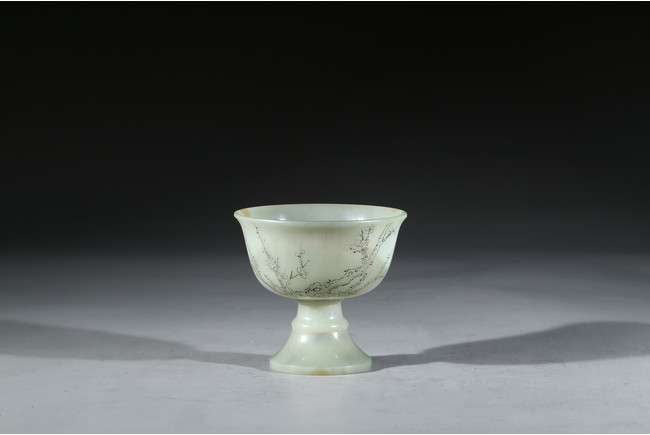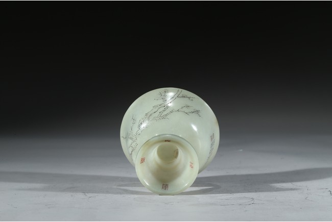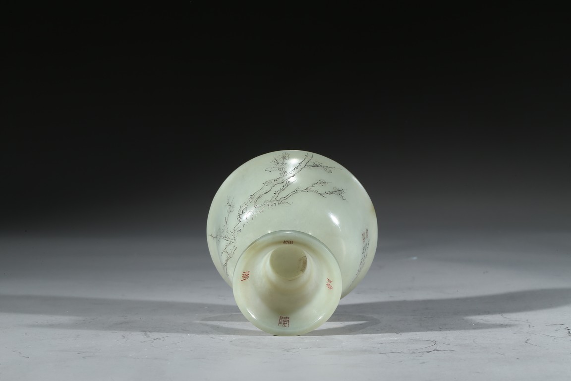 The cup finely incised with imperial poem to the exterior on one side, the other side with plum blossom, the base interior with four painted character Qianlong mark. Qing Dynasty period.