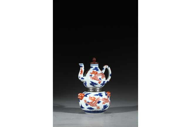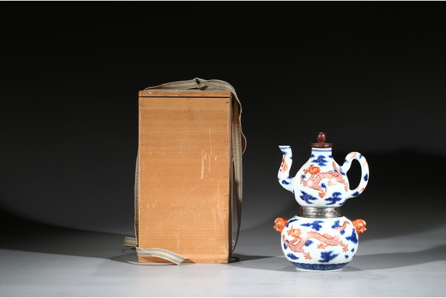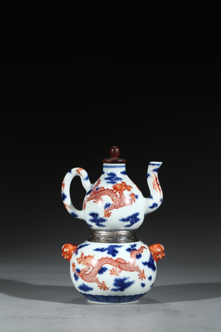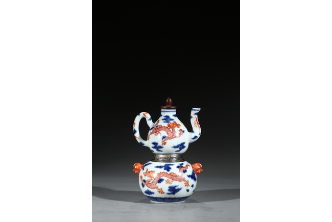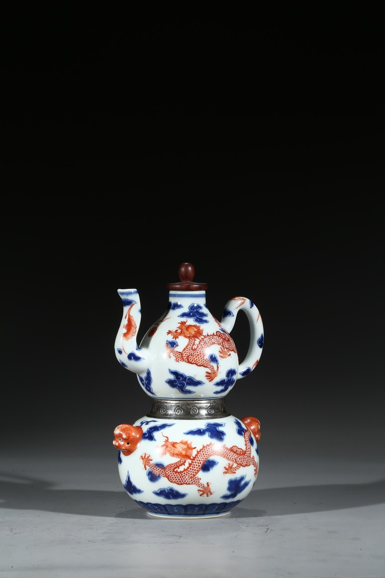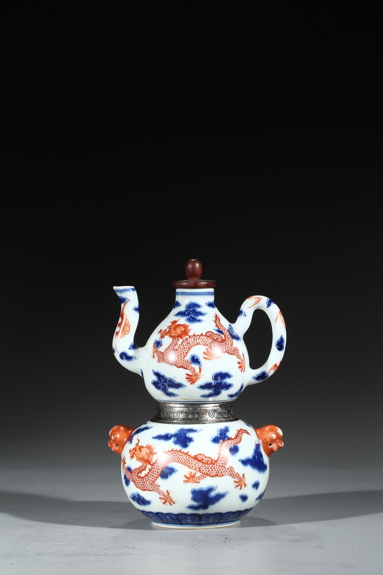 本品為瓷質酒壺當中別具心裁之作。整體造型呈葫蘆形,有兩部分組成,上部盛酒,下部注入熱水溫酒,用以長酌。通體上下皆飾青花礬紅雙龍戲珠紋,以青花繪祥雲,以礬紅飾瑞龍。柄、流及溫器皆見礬紅彩繪就的蝙蝠翱翔於祥雲之間。溫器敦實可愛,飾以礬紅獸首,別緻精巧,近足處繪青花蓮瓣紋。本品底落’養和堂制’墨彩楷書款,端莊規矩,一如雍乾琺瑯彩瓷之寫款。其青花髮色清雅明快,礬紅妍麗奪目,與瑩潤如玉的胎釉相互輝映。其設計奇妙,工藝精絶,上下渾然一體,既得實用之效,又獲觀賞之美,誠為佳器。