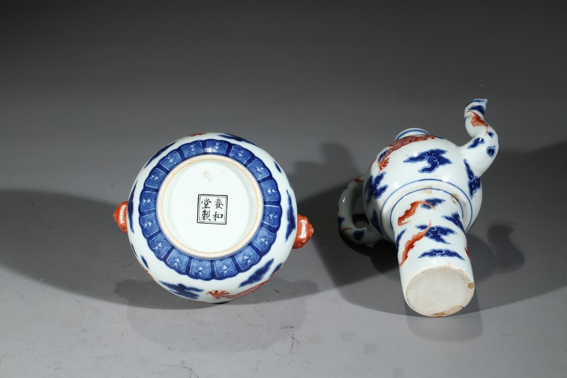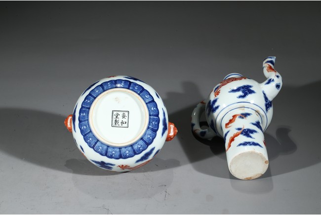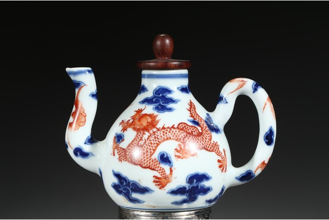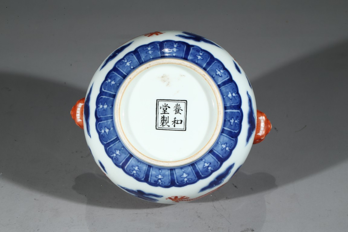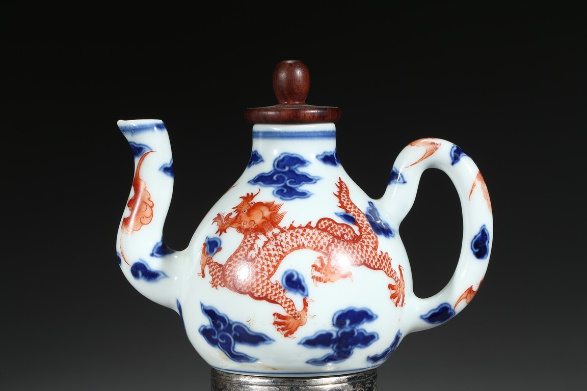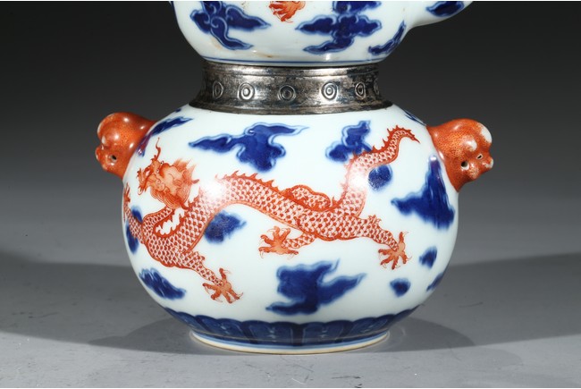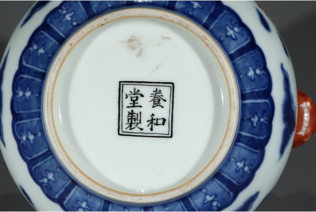 本品為瓷質酒壺當中別具心裁之作。整體造型呈葫蘆形,有兩部分組成,上部盛酒,下部注入熱水溫酒,用以長酌。通體上下皆飾青花礬紅雙龍戲珠紋,以青花繪祥雲,以礬紅飾瑞龍。柄、流及溫器皆見礬紅彩繪就的蝙蝠翱翔於祥雲之間。溫器敦實可愛,飾以礬紅獸首,別緻精巧,近足處繪青花蓮瓣紋。本品底落’養和堂制’墨彩楷書款,端莊規矩,一如雍乾琺瑯彩瓷之寫款。其青花髮色清雅明快,礬紅妍麗奪目,與瑩潤如玉的胎釉相互輝映。其設計奇妙,工藝精絶,上下渾然一體,既得實用之效,又獲觀賞之美,誠為佳器。