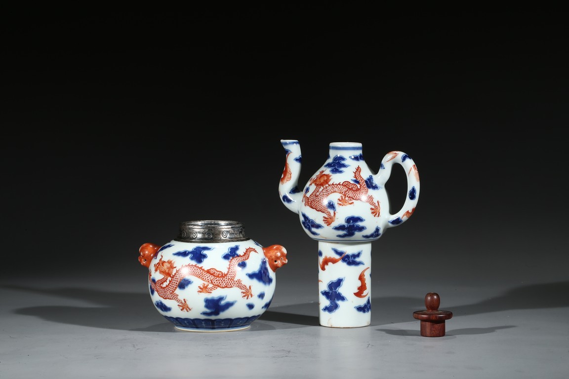 The double gourd shaped ewer set to one side with a curved spout and to the other with a loop handle, with a deep cylindrical container and extending from the base, surmounted by a slightly domed cover with a bud finial, all supported on a globular warmer set with a pair of lion-mask handles, the vessels painted in underglaze with flying five clawed dragon amidst clouds, the base of the warmer with a four-character hallmark reading Qingyi Tang zhi (Hall of Blessings and Correctness) within a double square in underglaze blue. Qing Dynasty period.
