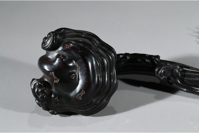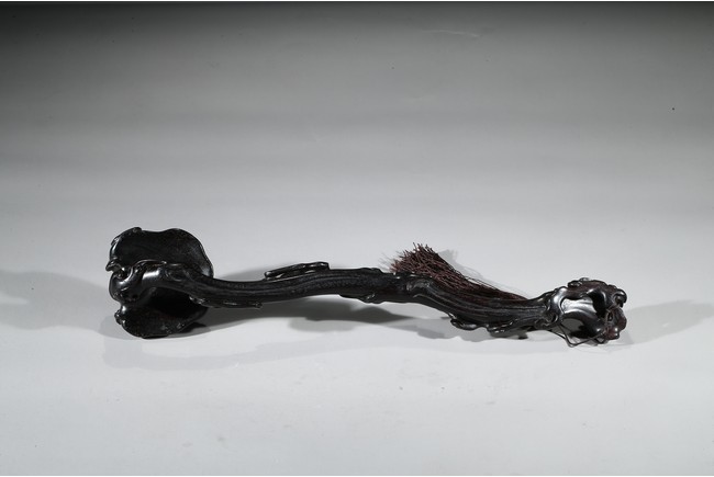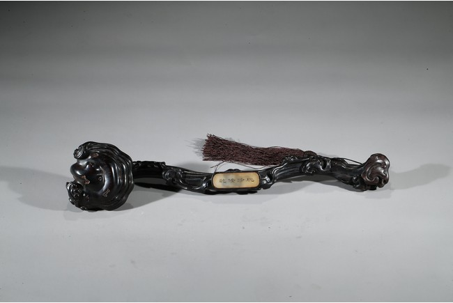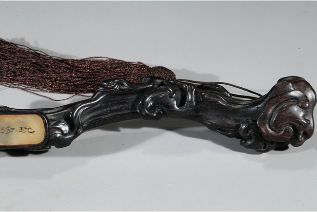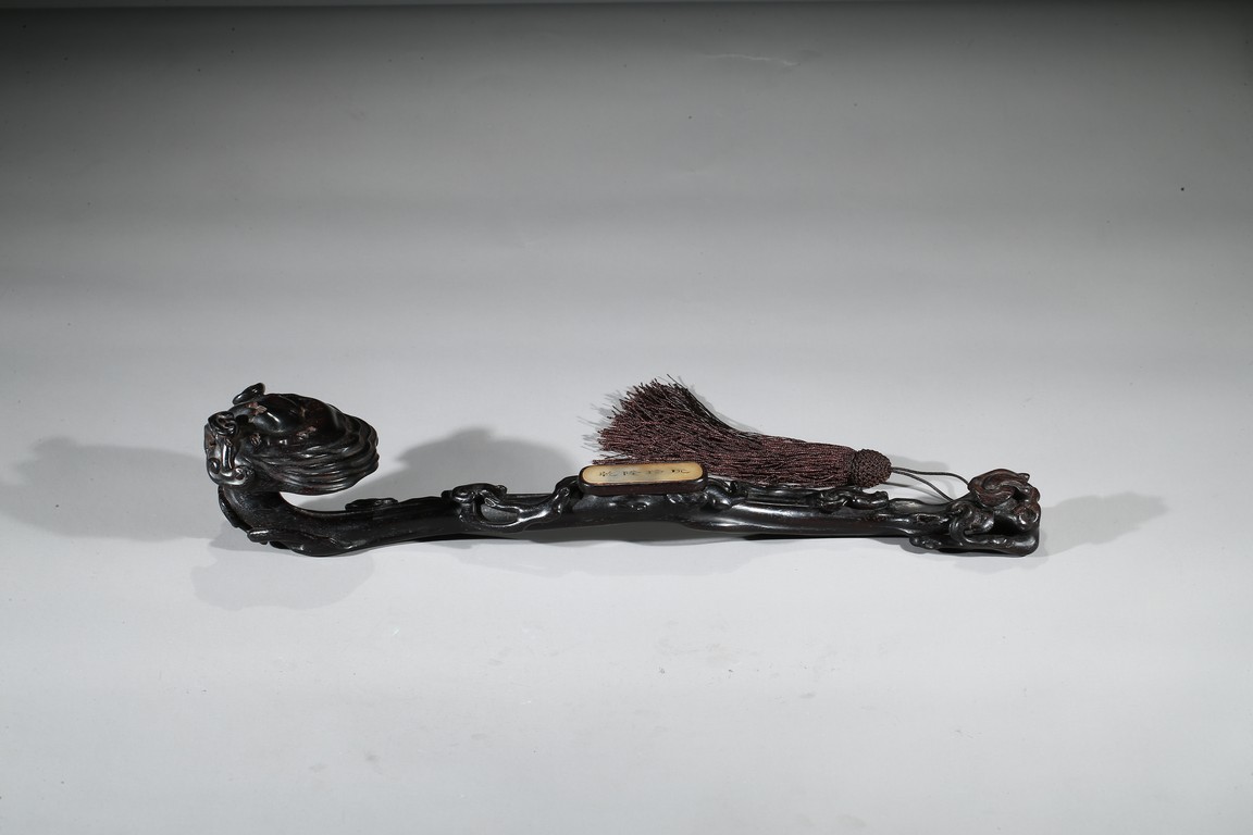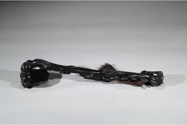 Provenance: Private New York collection 如意與佛教有關,常見被執於諸菩薩手上、遂成祥瑞之征,多塑作靈芝狀、以取其長壽之瑞意。明代以來,文人階層出於好古的心態,將如意逐步納入書房文玩的系列。如意在清宮中得以盛行,無疑是因為皇帝的推崇,但若論對如意之鍾愛程度及收藏數量、乾隆絶對令其父瞠乎其後,乾隆三十年後,歷次進貢中無不有如意。台北國立故宮博物院《吉祥如意》展覽目錄(台北,1995 年)內有頗詳論述和作品羅列供參考,現北京故宮博物院珍藏各式如意近三千柄,但凡屬清宮皇家御用物品,以銘刻御題詩文者為最高。本件器物精選縝密堅實、紋理含蘊的上等紫檀木料雕制。器身一木連作,造型雍容端莊,體呈“S”形,起線優美。鑲嵌瑪瑙,雕“乾隆珍玩”四字。首部雕作如意靈芝,包漿亮麗緻密,平滑如鏡,光可鑒人。“S”形曲線婉轉流暢,工藝嫻熟精湛,彰顯出至尊無上的皇家氣息。