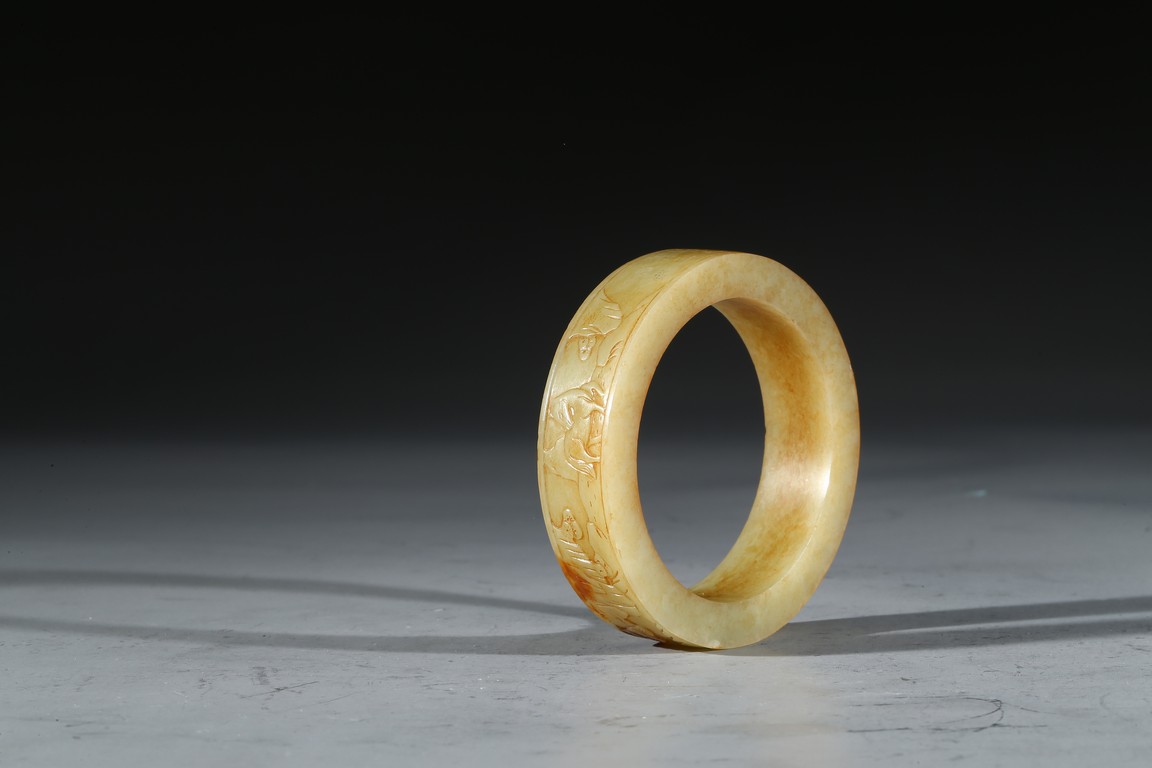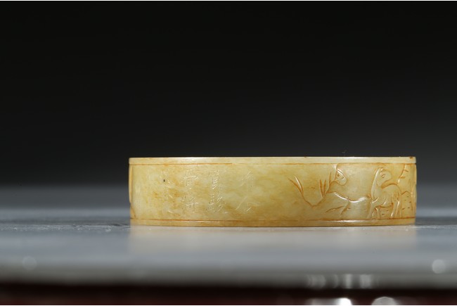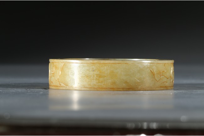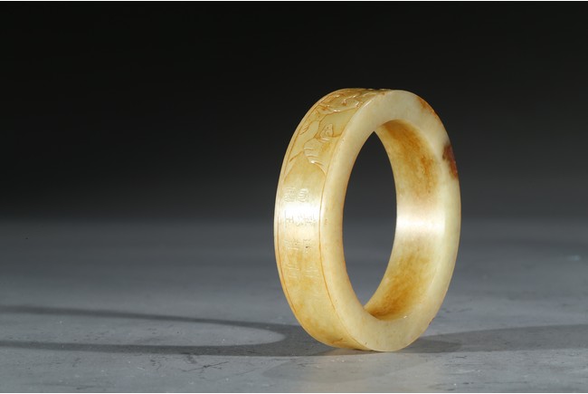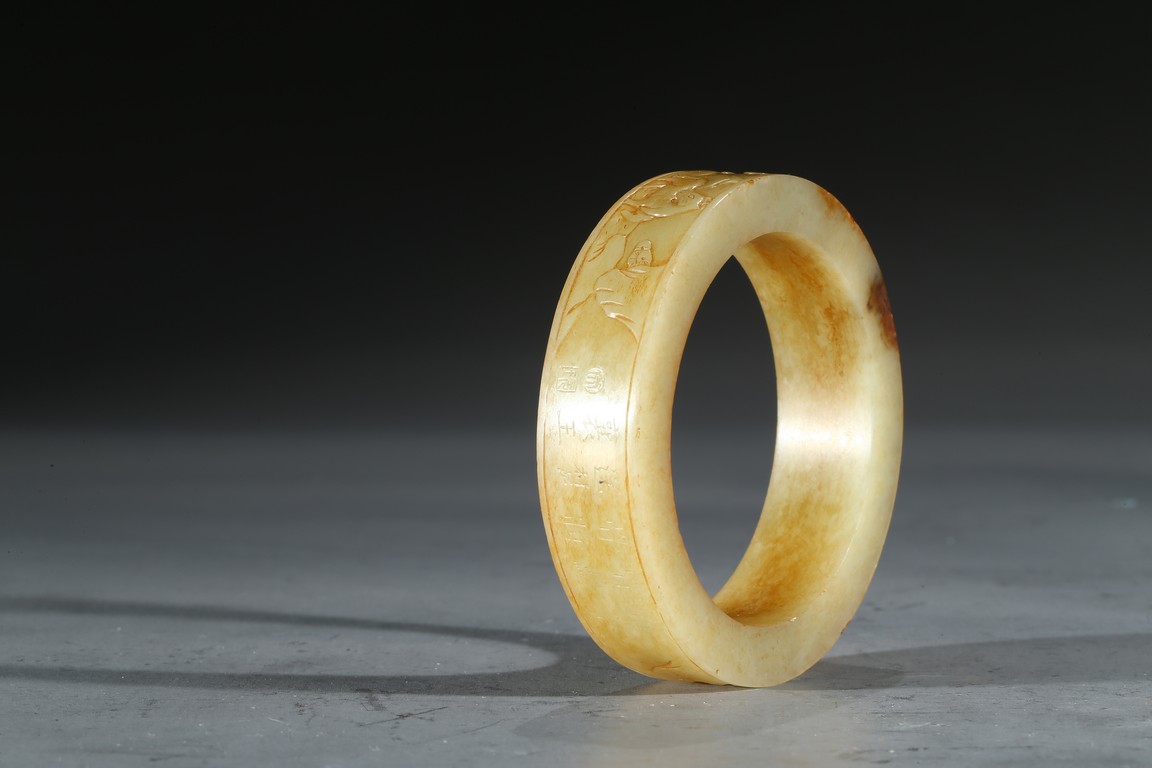 The jade ring carved to the exterior with mountain landscape and inscribed with imperial inscription. Qing Dynasty period.