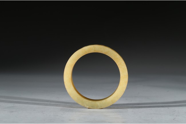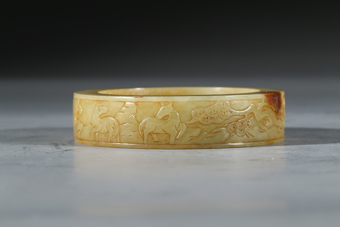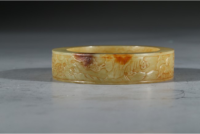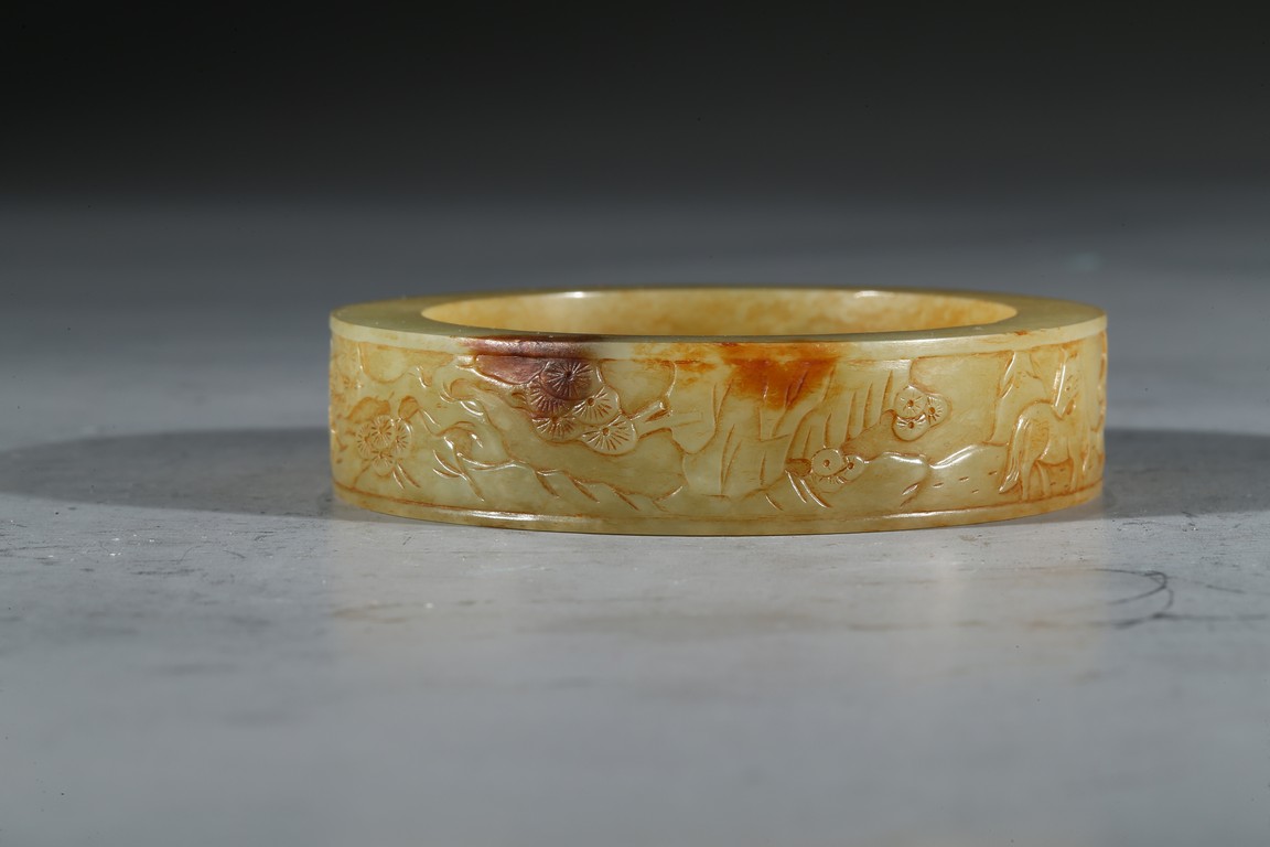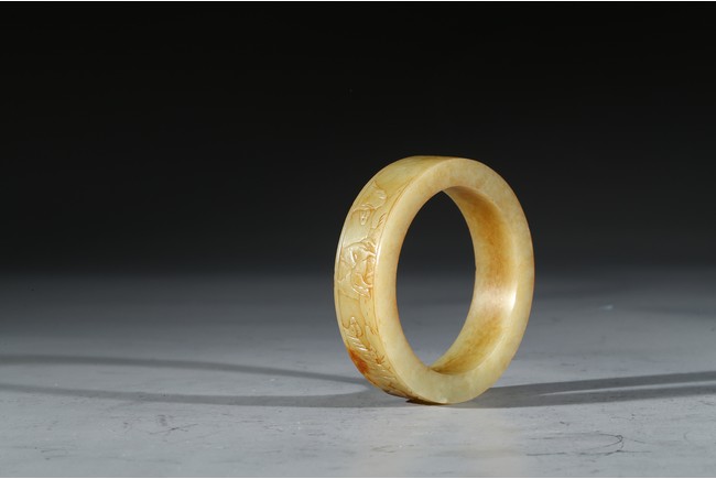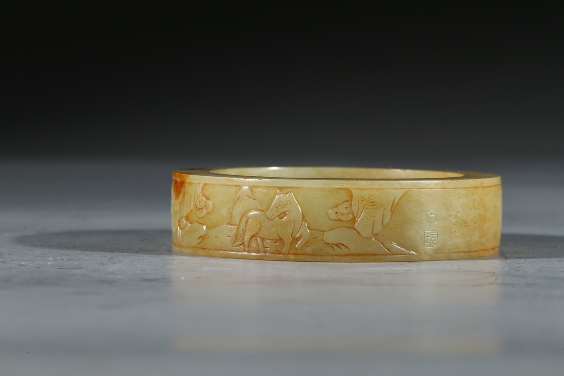 The jade ring carved to the exterior with mountain landscape and inscribed with imperial inscription. Qing Dynasty period.