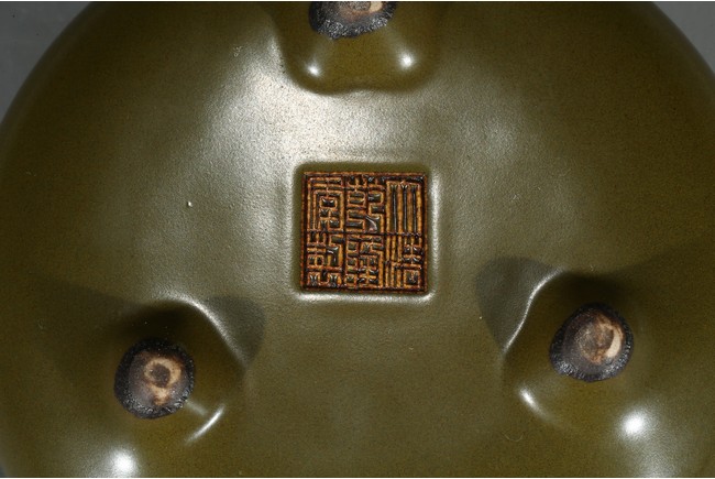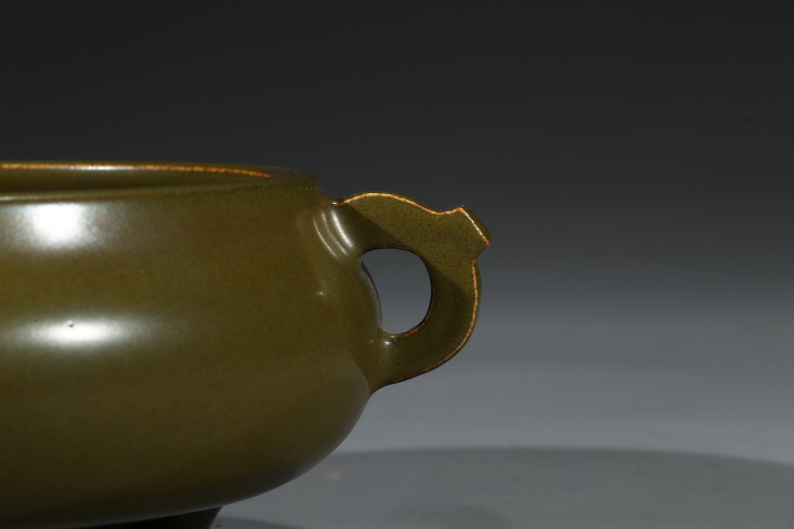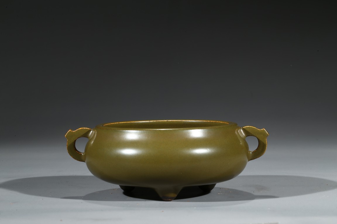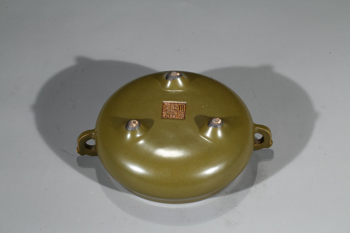 The compressed globular body rising from three short tapering feet to a flared rim, flanked by a pair of loop handles, overall suffused with even olive green glaze, the base impressed with a six character QIANLONG mark. Qing Dynasty period.