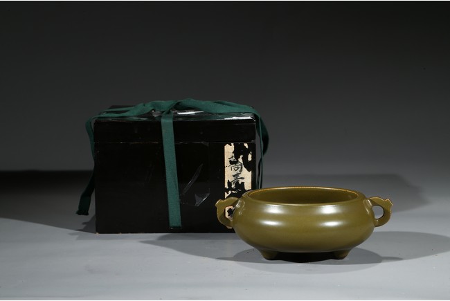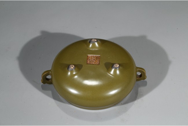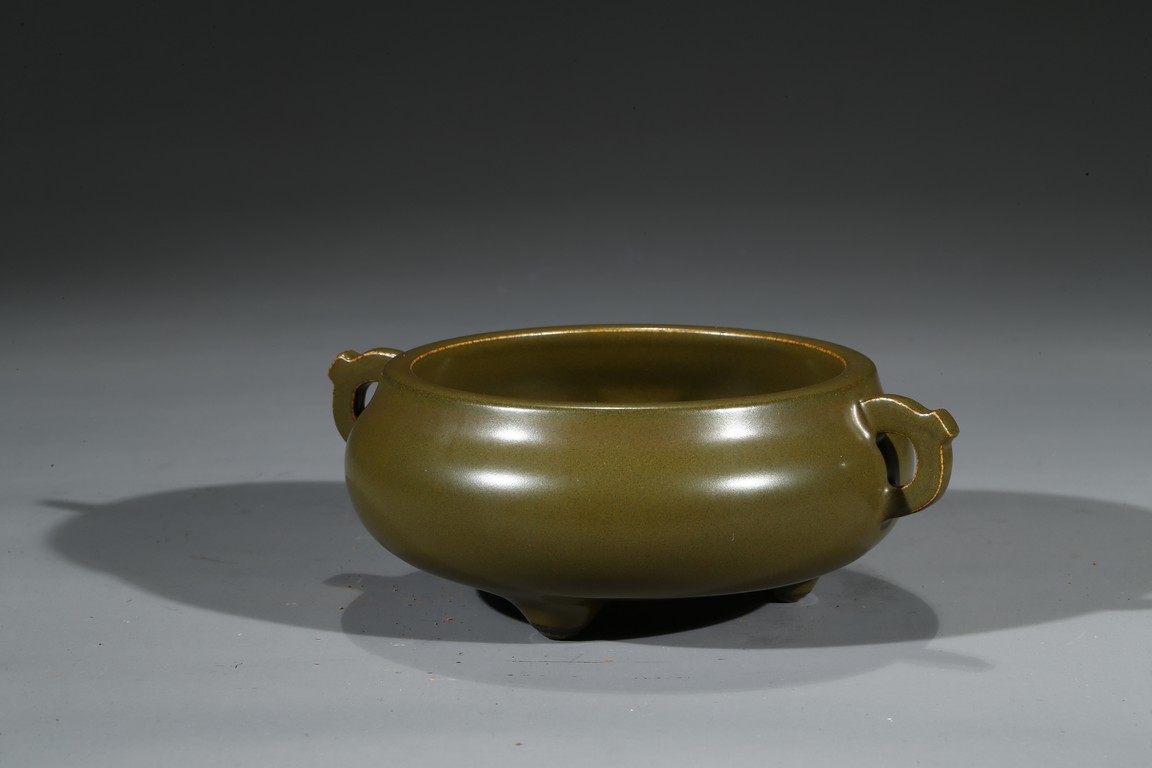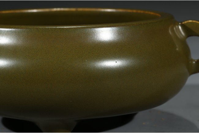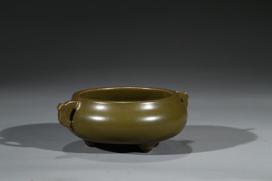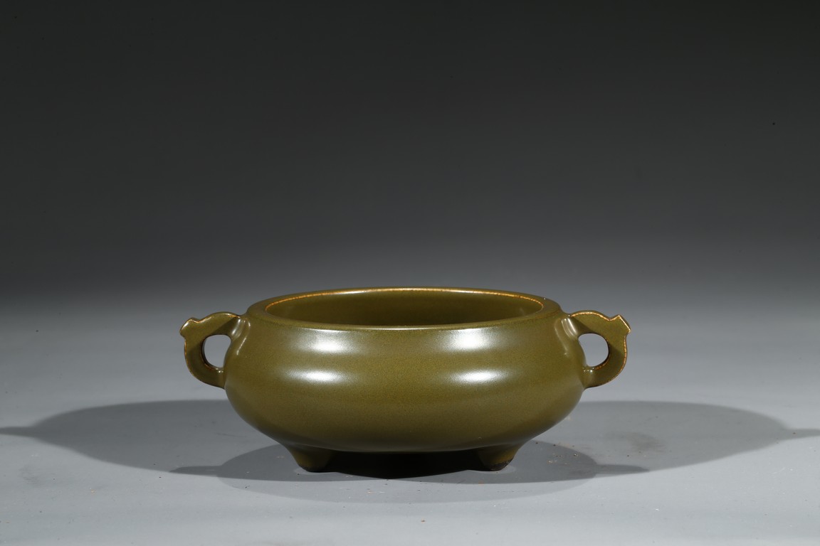 The compressed globular body rising from three short tapering feet to a flared rim, flanked by a pair of loop handles, overall suffused with even olive green glaze, the base impressed with a six character QIANLONG mark. Qing Dynasty period.
