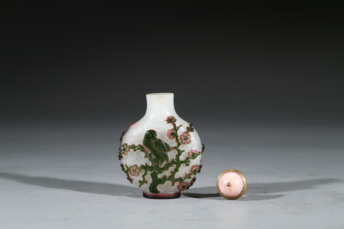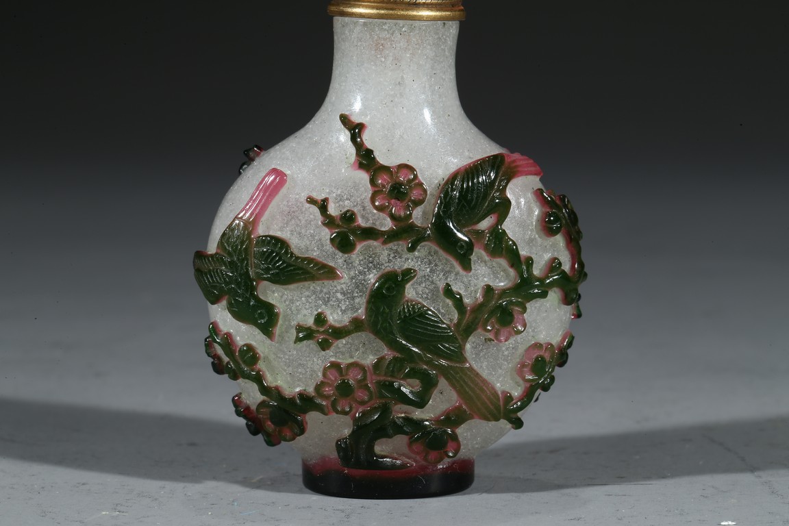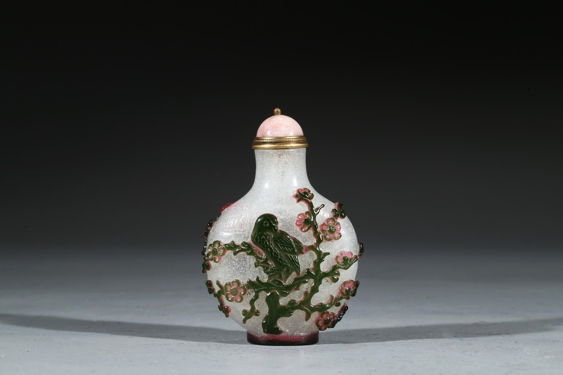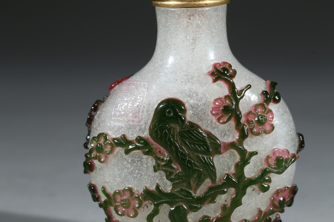 The translucent three color overlay is carved through to the translucent, slightly milky and bubble-suffused ground on either side with a design of bird perching on plum blossom, with impressed mark. Qing Dynasty period.
