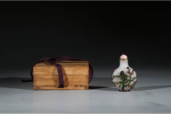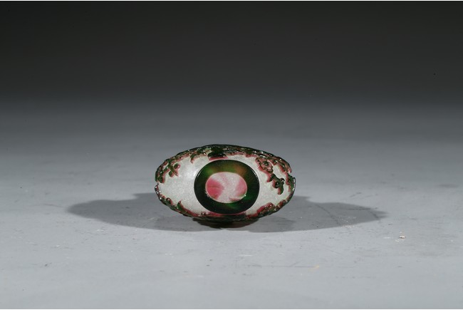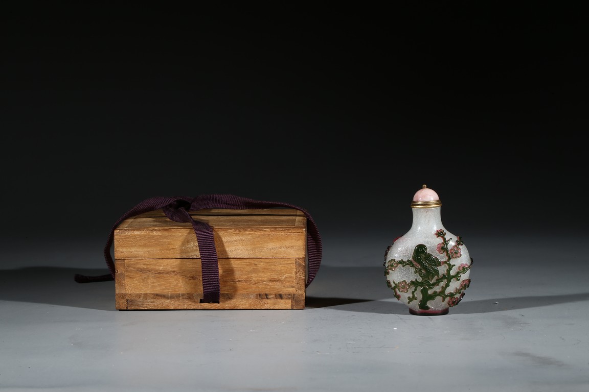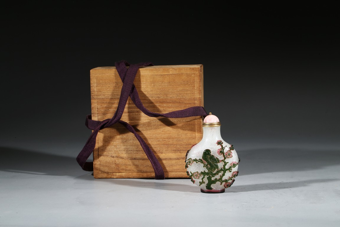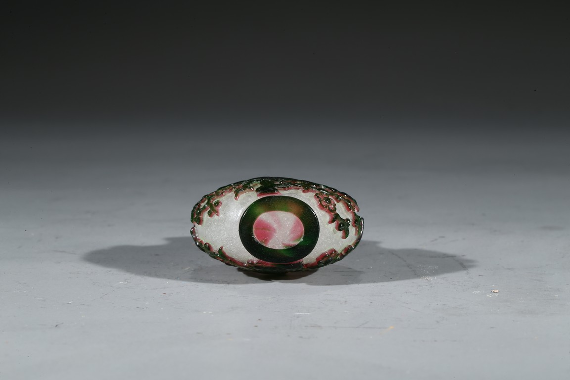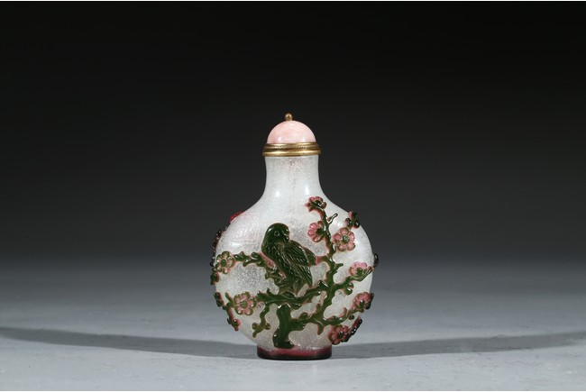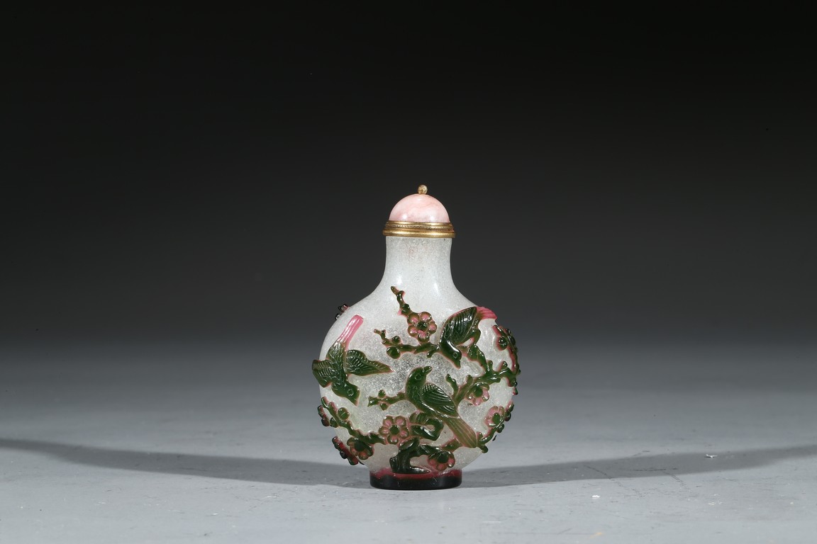 The translucent three color overlay is carved through to the translucent, slightly milky and bubble-suffused ground on either side with a design of bird perching on plum blossom, with impressed mark. Qing Dynasty period.