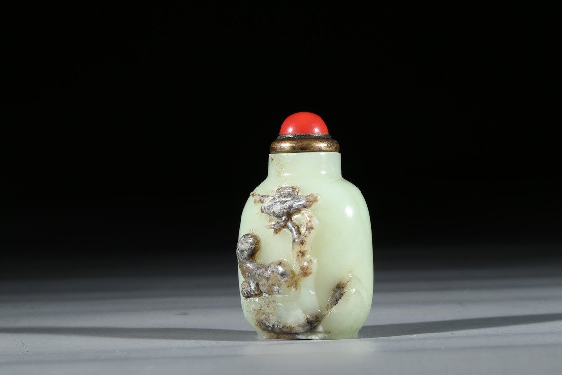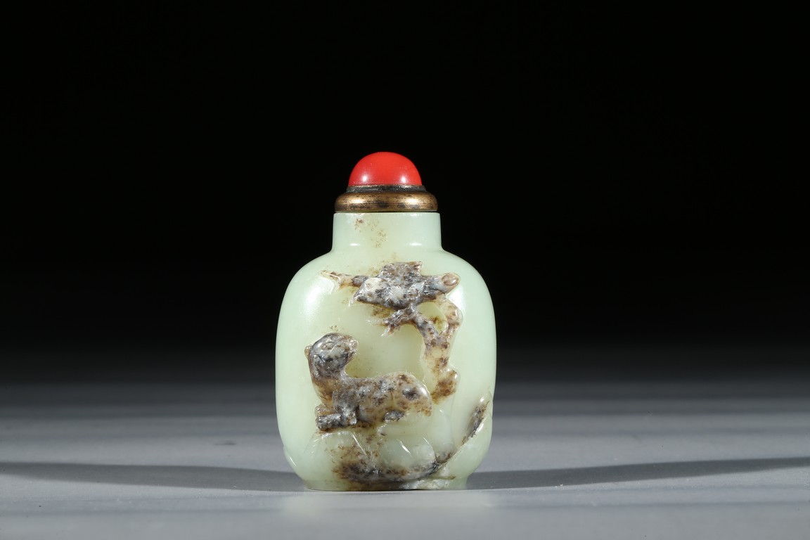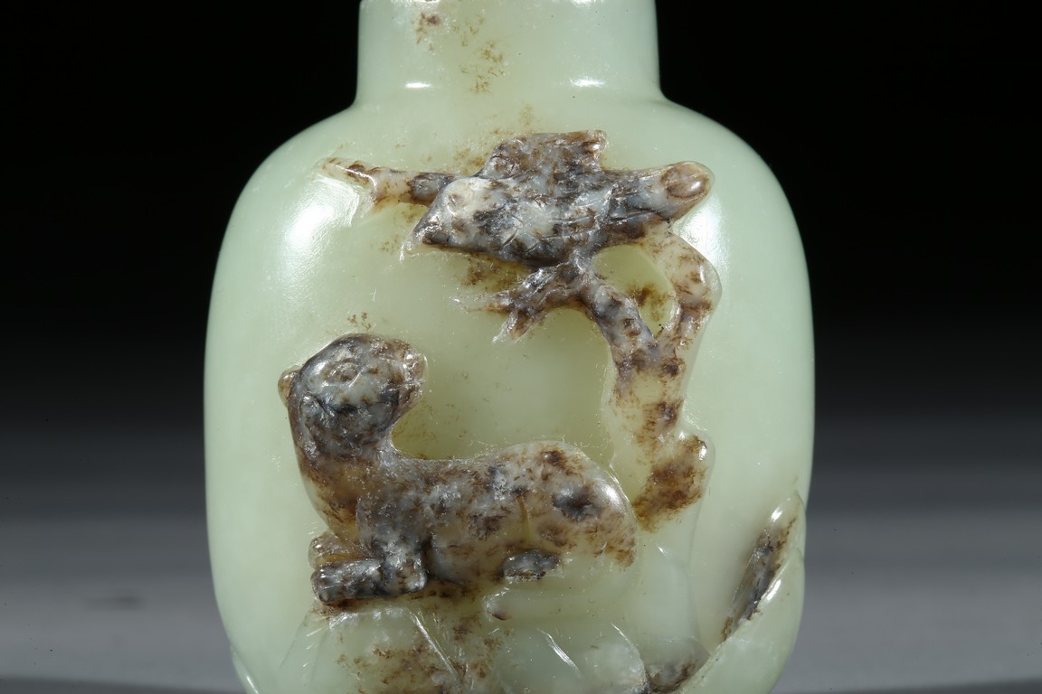 A CELADON JADE SNUFF BOTTLE 雕獸鳥鼻煙壺