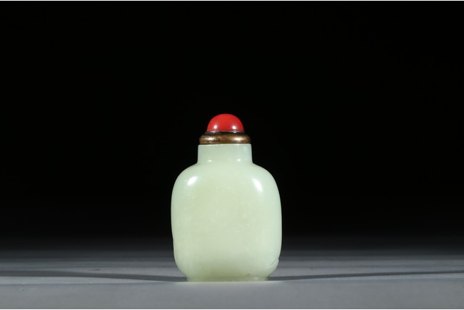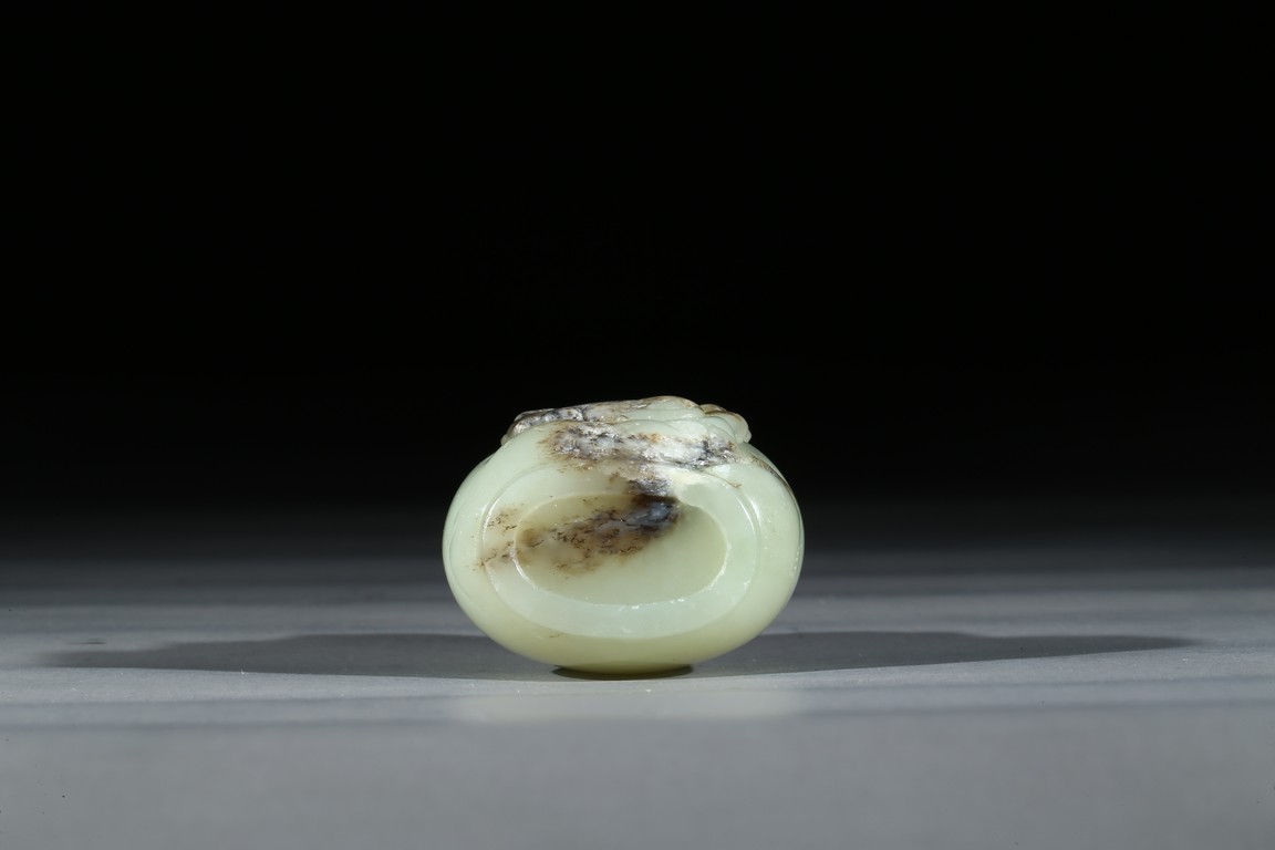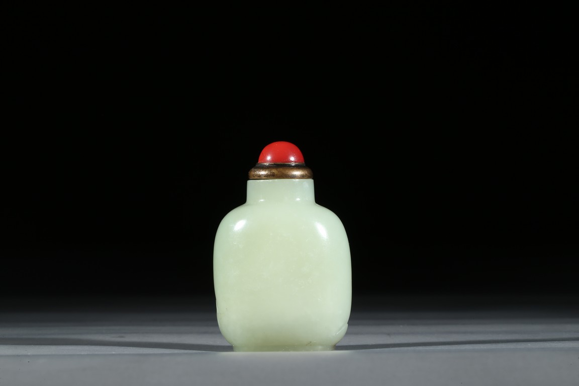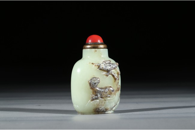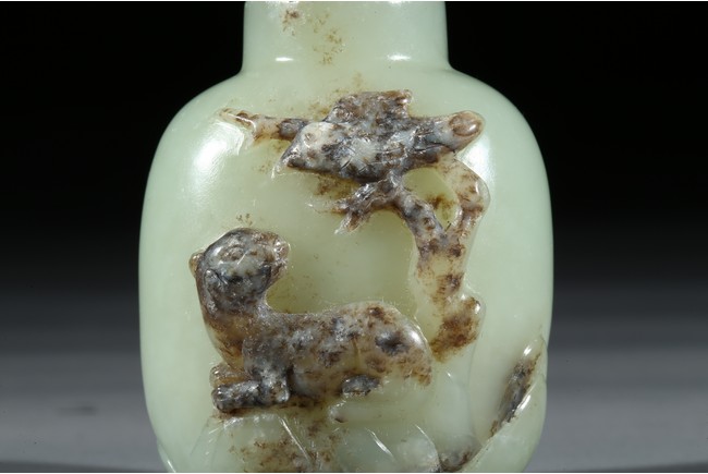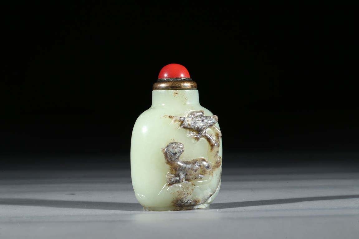 A CELADON JADE SNUFF BOTTLE 雕獸鳥鼻煙壺