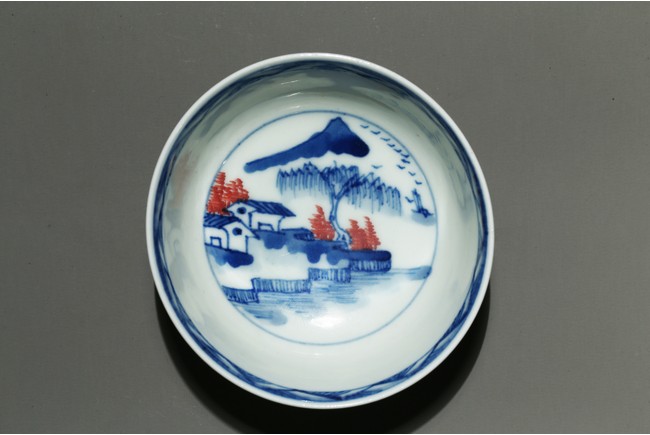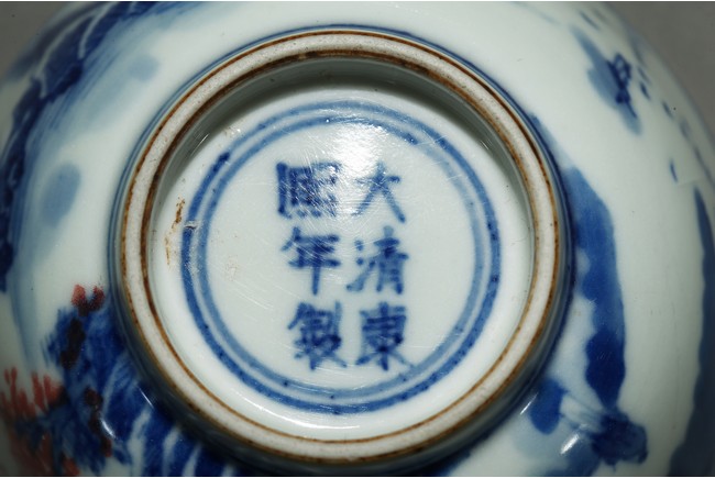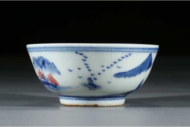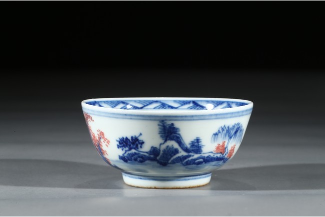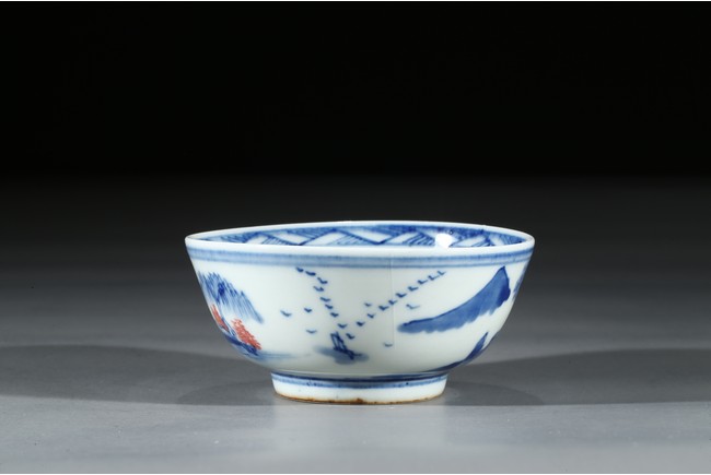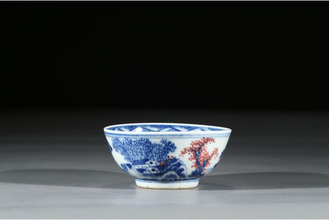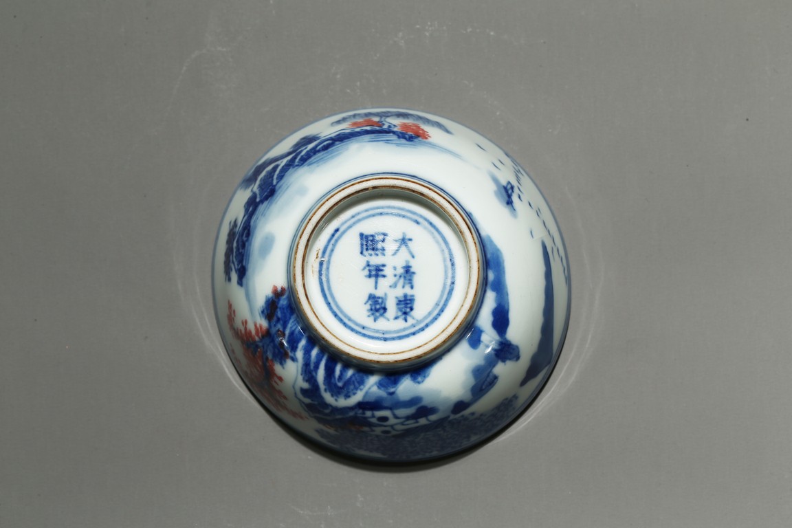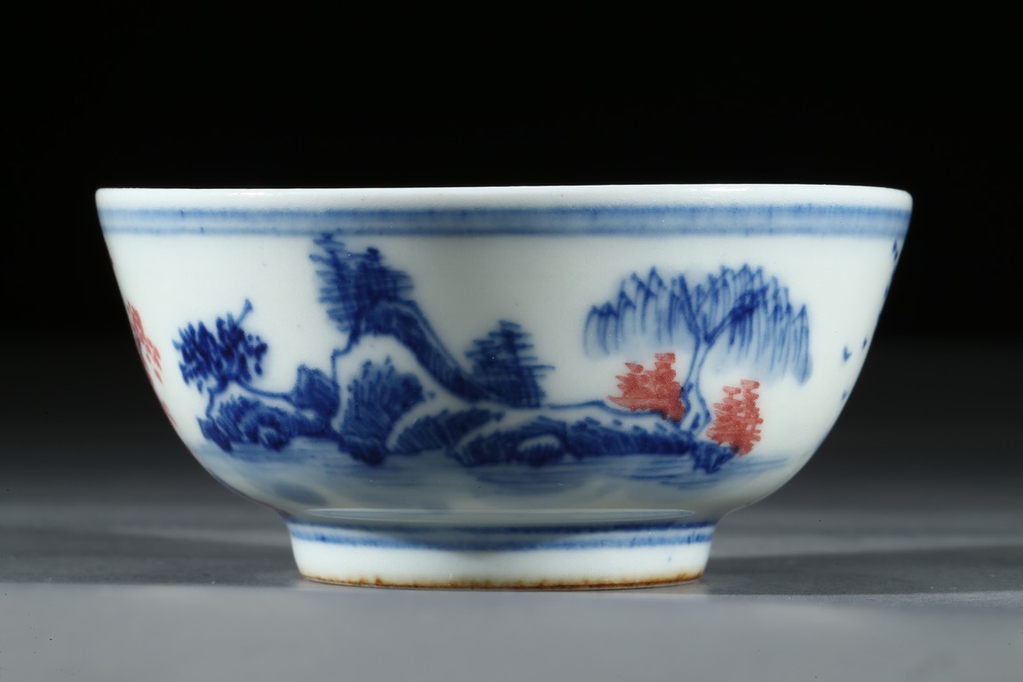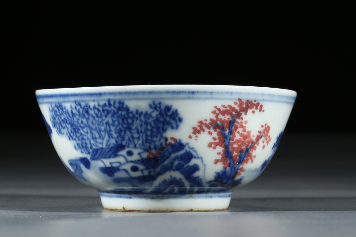 Raised by a short ring foot. Modelled in circular form, with exerted rim. On the exterior, painted a landscape painting, mainly used blue tone on the white ground, and interspersed some red tree leaves. On the interior, painted a circular medallion with a landscape scene glaze blue and red tone on the centre. Qing Dynasty Period