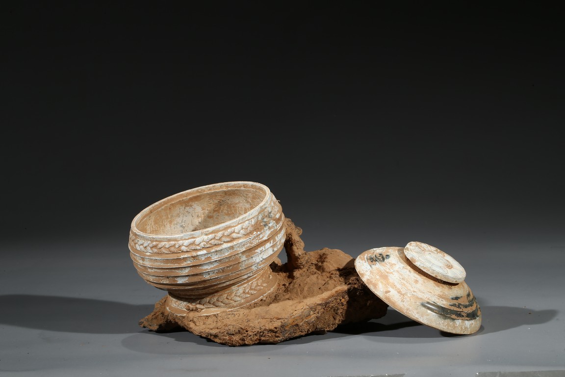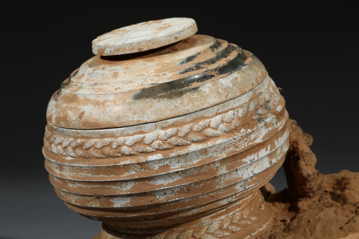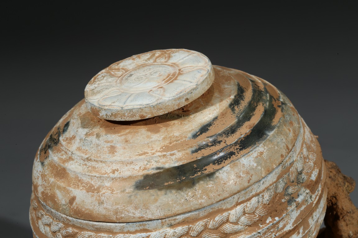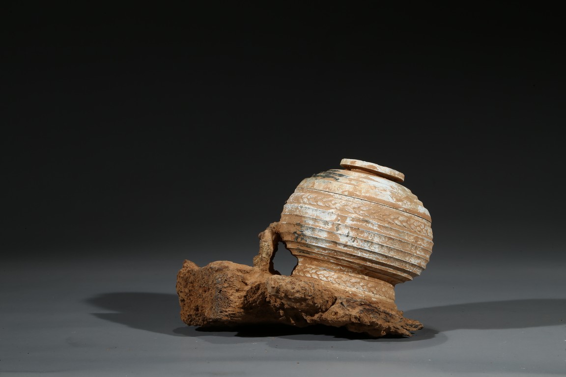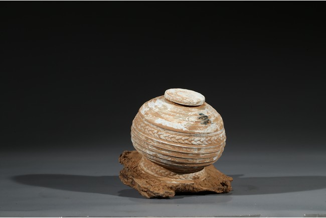 The compressed globular body rising from spreading feet, the exterior with raised bands, fitted with cover with similar design and circular finial. Possibly Han Dynasty period.