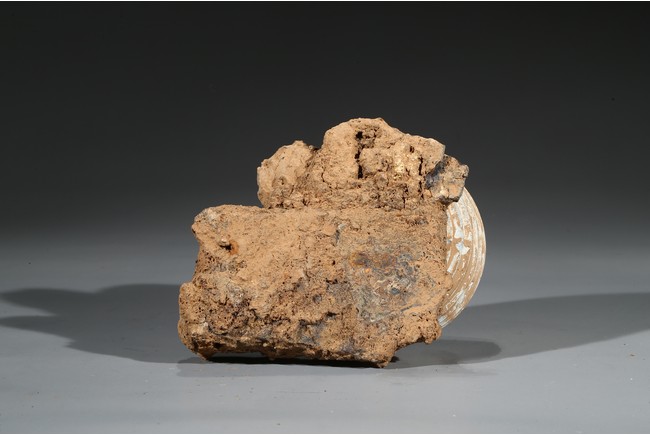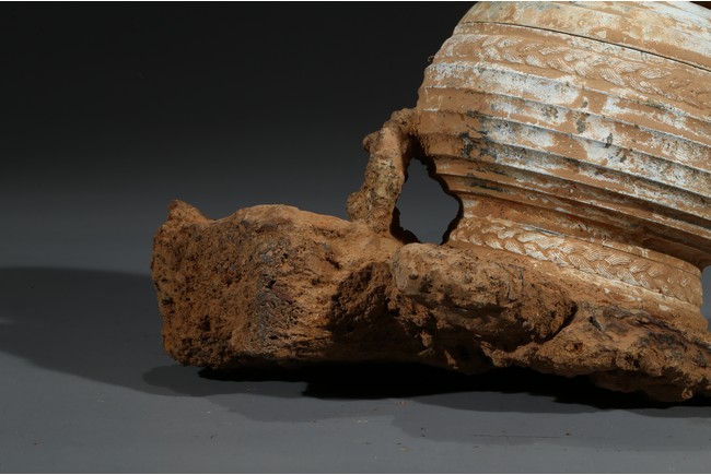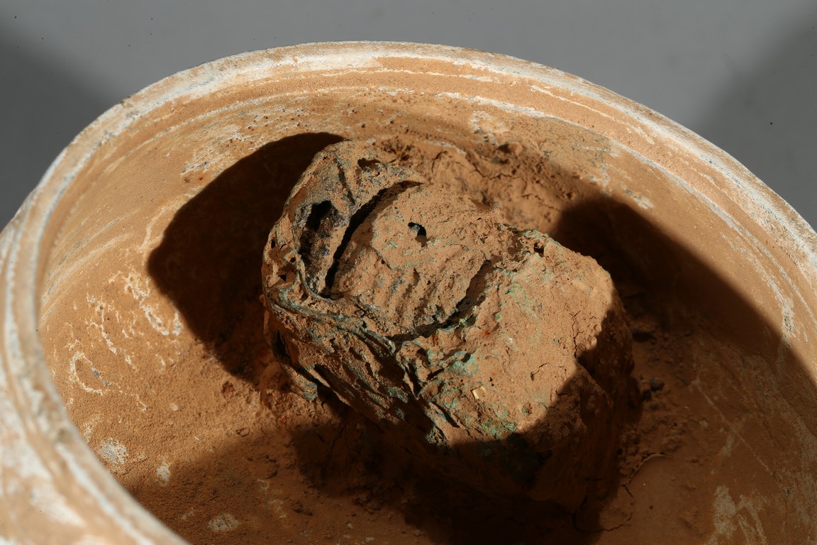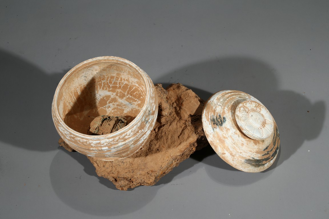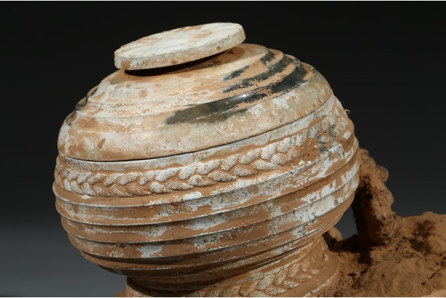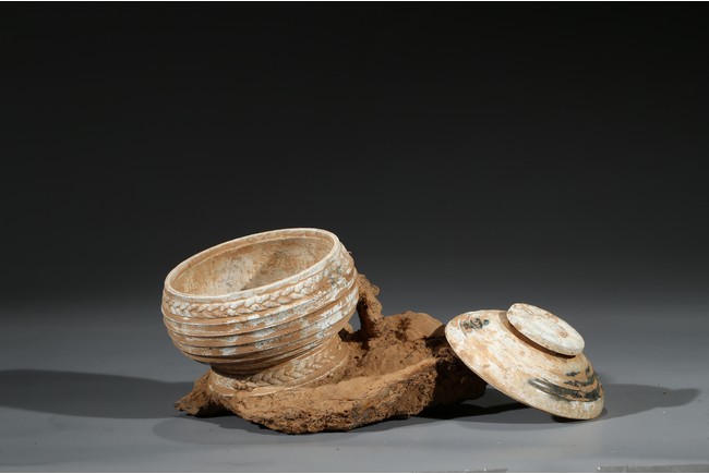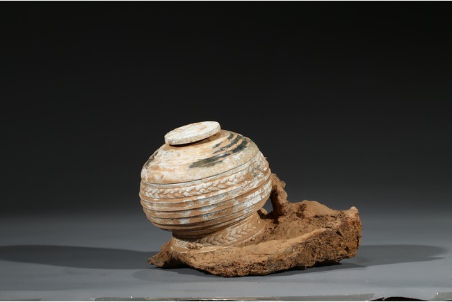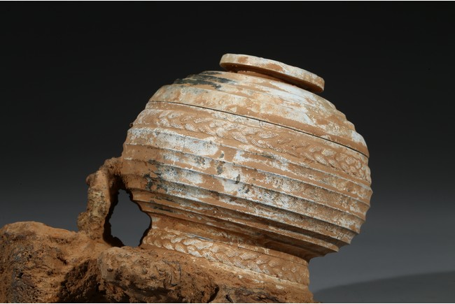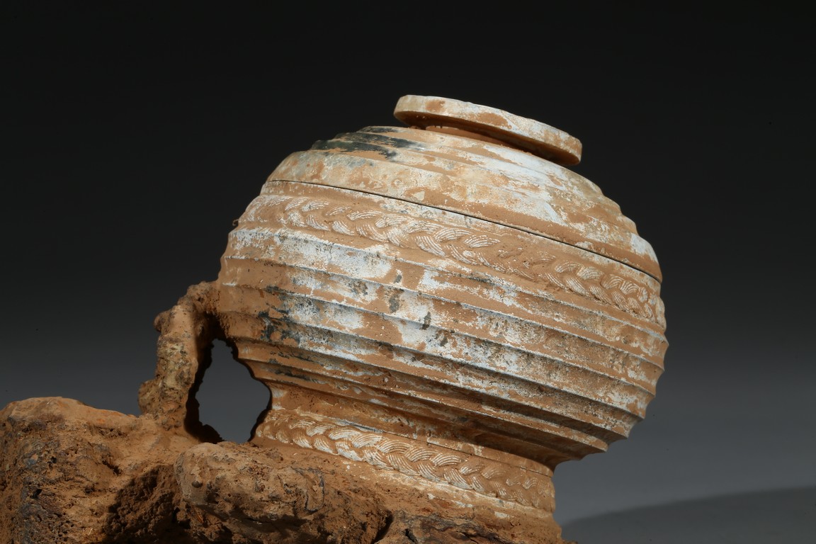 The compressed globular body rising from spreading feet, the exterior with raised bands, fitted with cover with similar design and circular finial. Possibly Han Dynasty period.