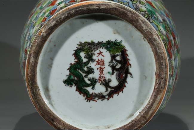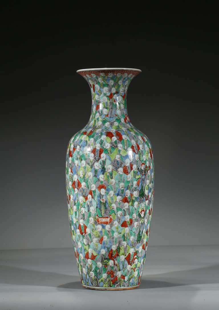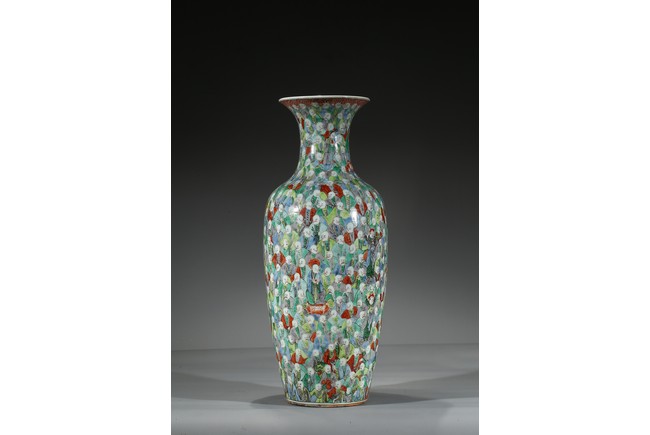 Of tall tapering form, the body exterior densely enamelled with five hundreds arhats wearing colorful robes, all below a band of ruyi pattern around the mouth rim, the base inscribed with a four character 'Da Xiong Bao Dian' mark flanked by two opposing dragons. Qing Dynasty Period.
