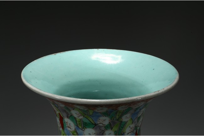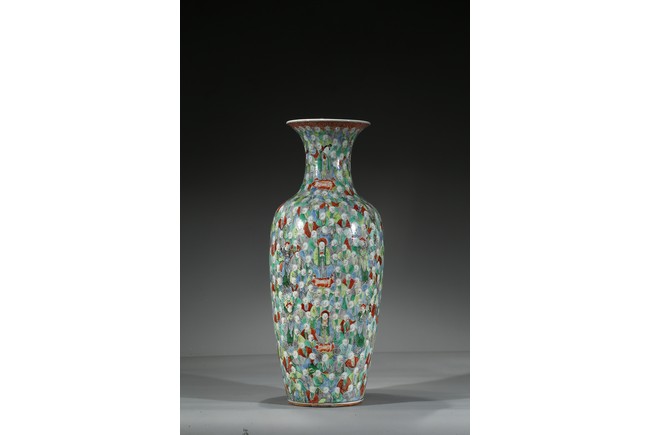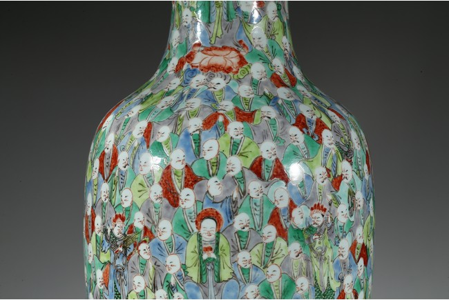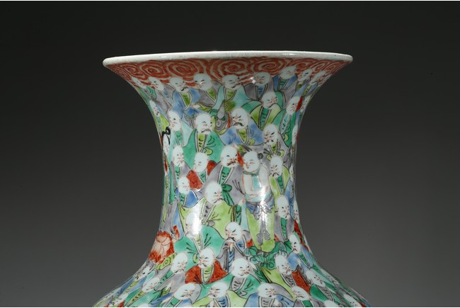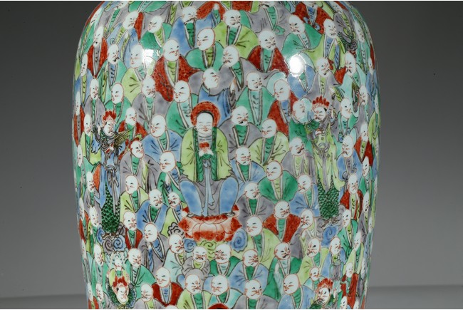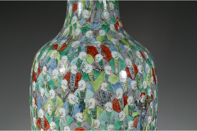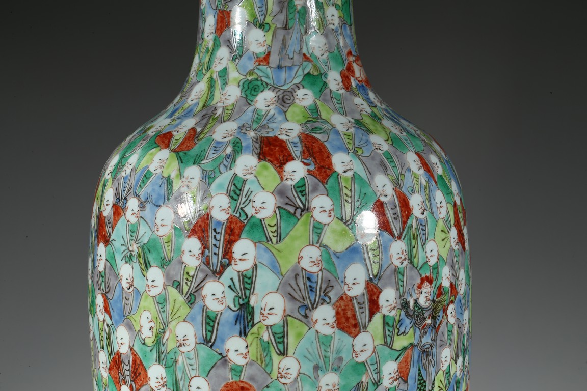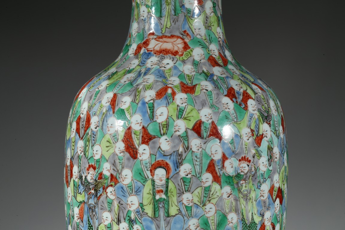 此五彩觀音瓶,束頸、豐肩、修腹、斂足。觀音瓶創燒、流行於康、雍間,器形雋雅高貴,釉面素潔溫潤,線條舒展柔美,工藝精湛細緻而無造作之痕,為康熙時期內府花器的上品。瓶身以五彩裝飾為基礎,採用通景式構圖方法勾勒出五百羅漢紋飾,紋樣富麗,著色豐富,歎為觀止。整器紋飾著色豐富,以敷彩濃艷的紅、黃 藍、綠為主色,間以赭、紫、黑等色,衣紋、雲彩更施以金彩,使畫面呈現出富麗吉祥之感。題材中人物描寫精到,眉毛、眼珠和頭髮鬍鬚用黑色勾勒,面部膚色也因人而異,不同神情,清晰可見。底部“大雄寶殿”款識,在佛教寺院中,大雄寶殿是供奉佛像的正殿。大雄寶殿是整座寺院的核心建築,也是僧眾朝暮集中修持的地方。