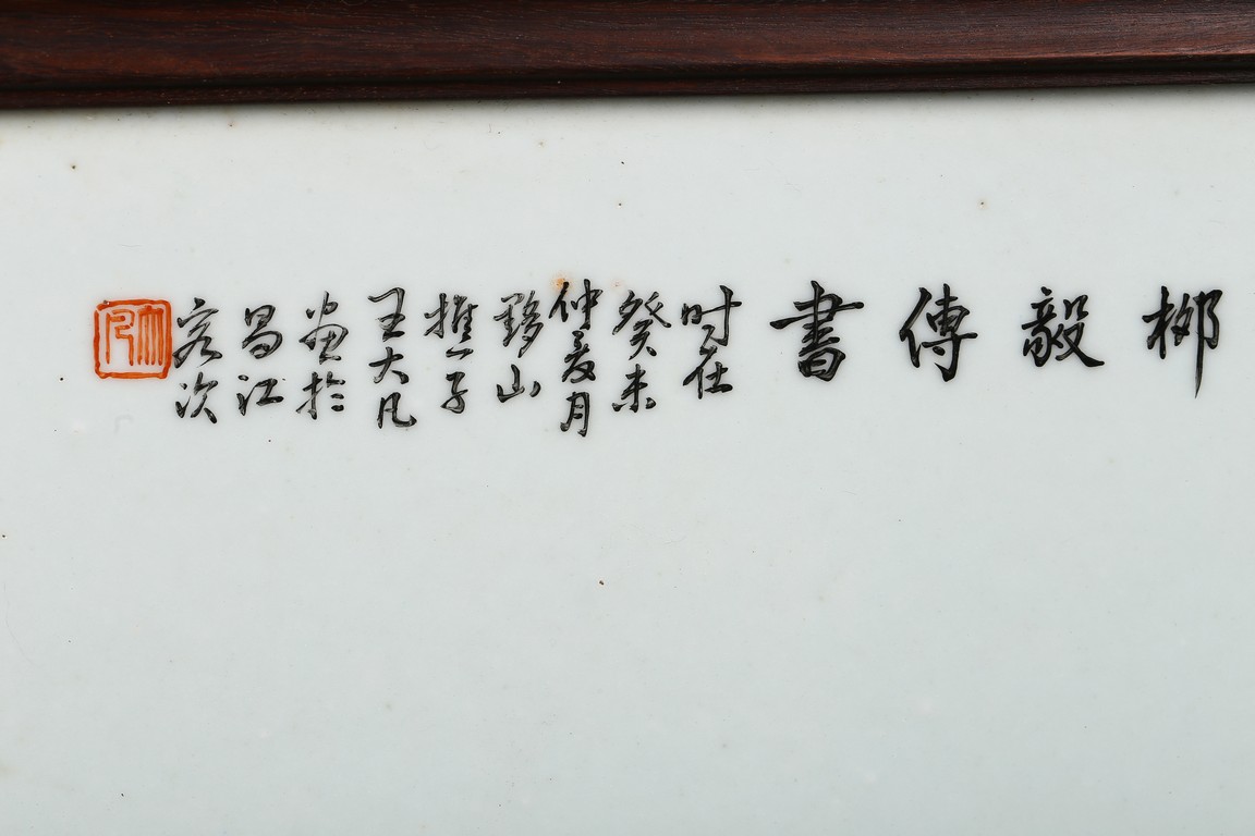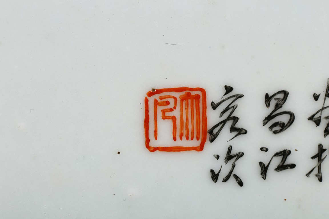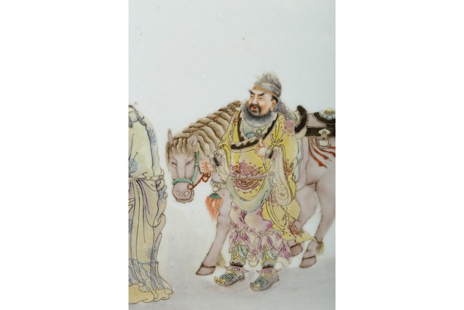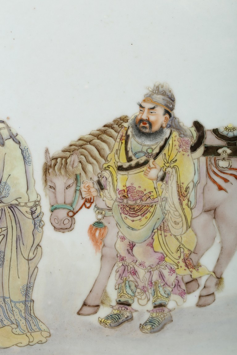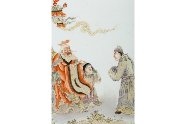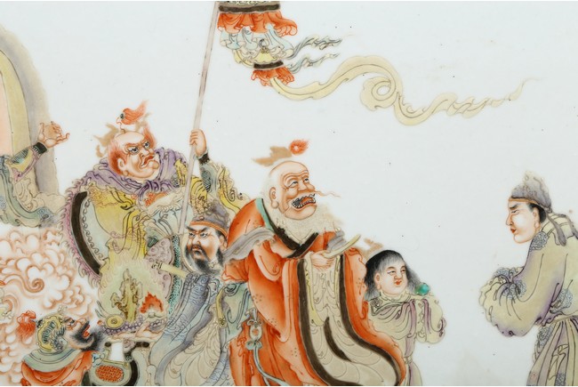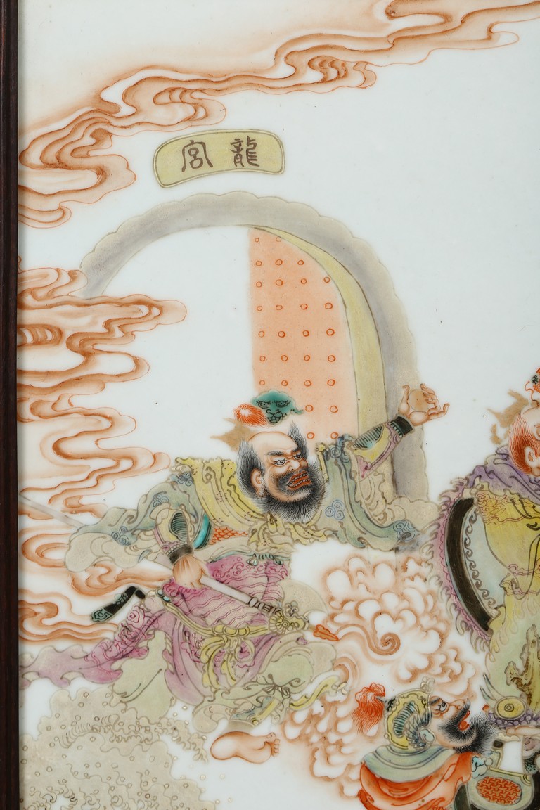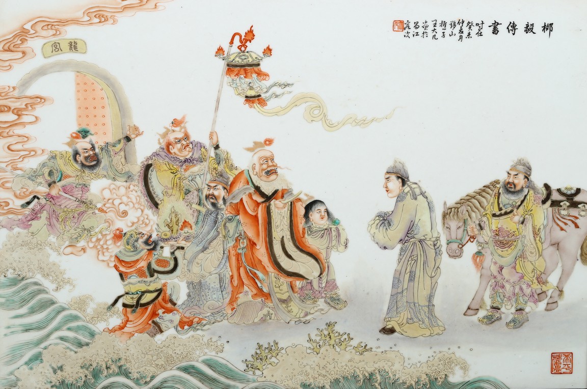 The rectangular panel finely painted to depict a story scene involving the dragon king of the sea emerging from the sea to visit a man on earth, the upper right with inscription and one seal mark. Republic period.