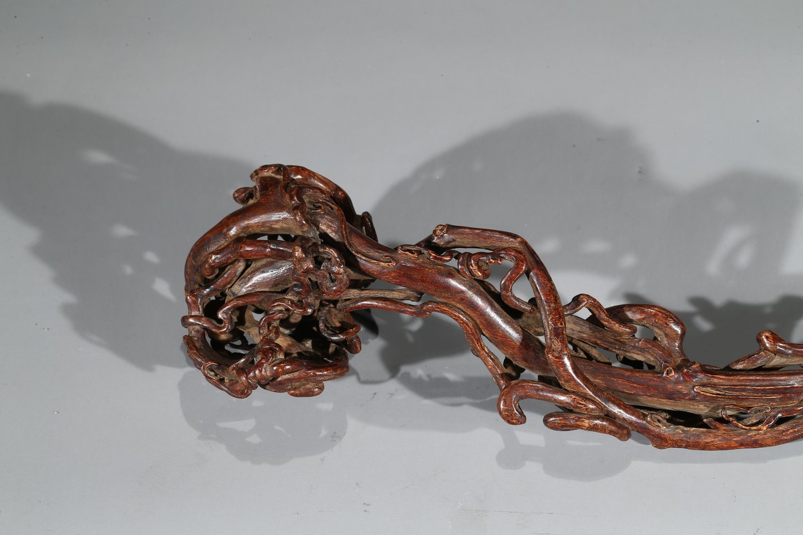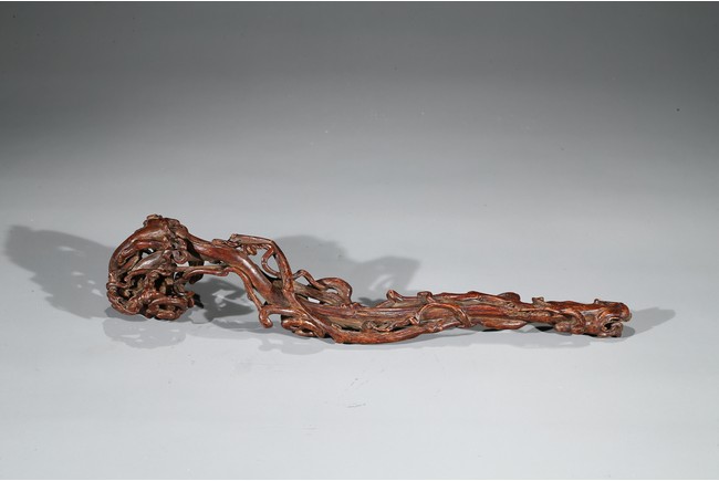 The sceptre is naturalistically carved in high relief and openwork to depict an intricate network of gnarled trailing branches, the underside of the shaft with deep crevices in imitation of a tree trunk. Mid-Qing Dynasty period.