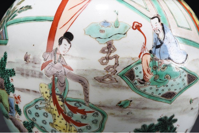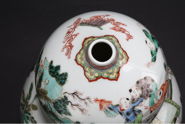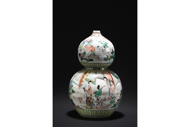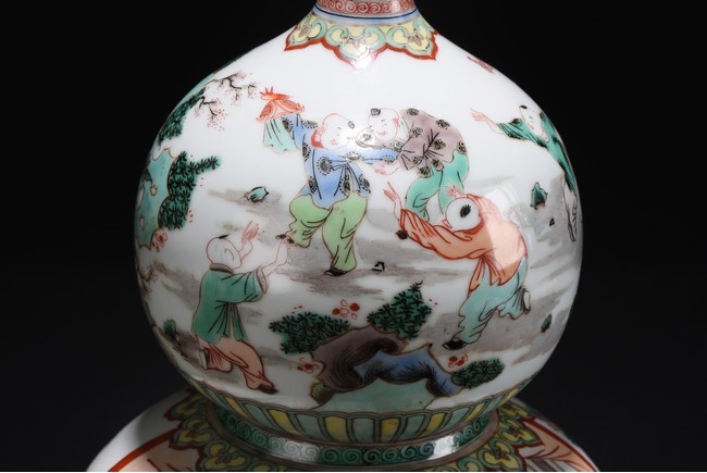 Of double gourd form, the exterior finely painted with boys playing with each other in a garden setting on the upper bulb; the lower bulb decorated with beauties dancing and playing musical instruments to entertain a seated scholar in a courtyard setting. Qing Dynasty period.
