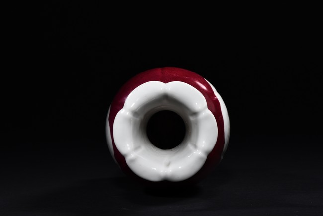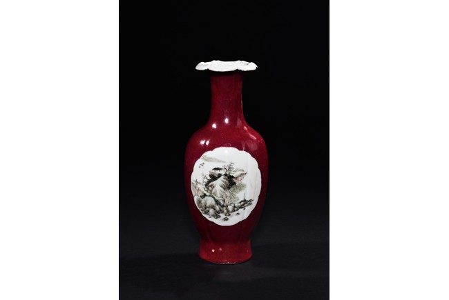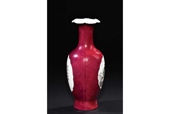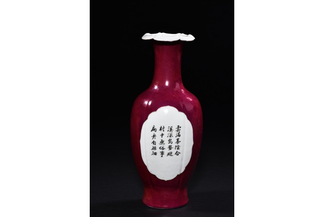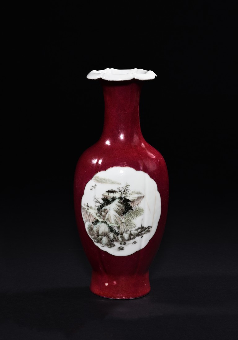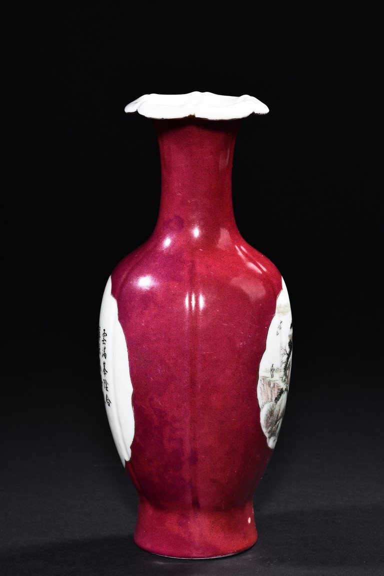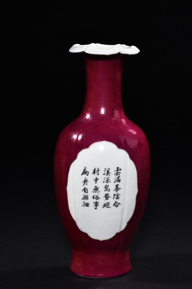 The vase rises to a widely flared rim with six lobes, the body covered in red glaze with two medallions on both sides enclosing a landscape scene and semi-cursive poem. The bottom bears four character mark 'hua sheng zhen pin'. Qing Dynasty Period