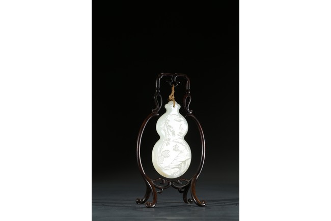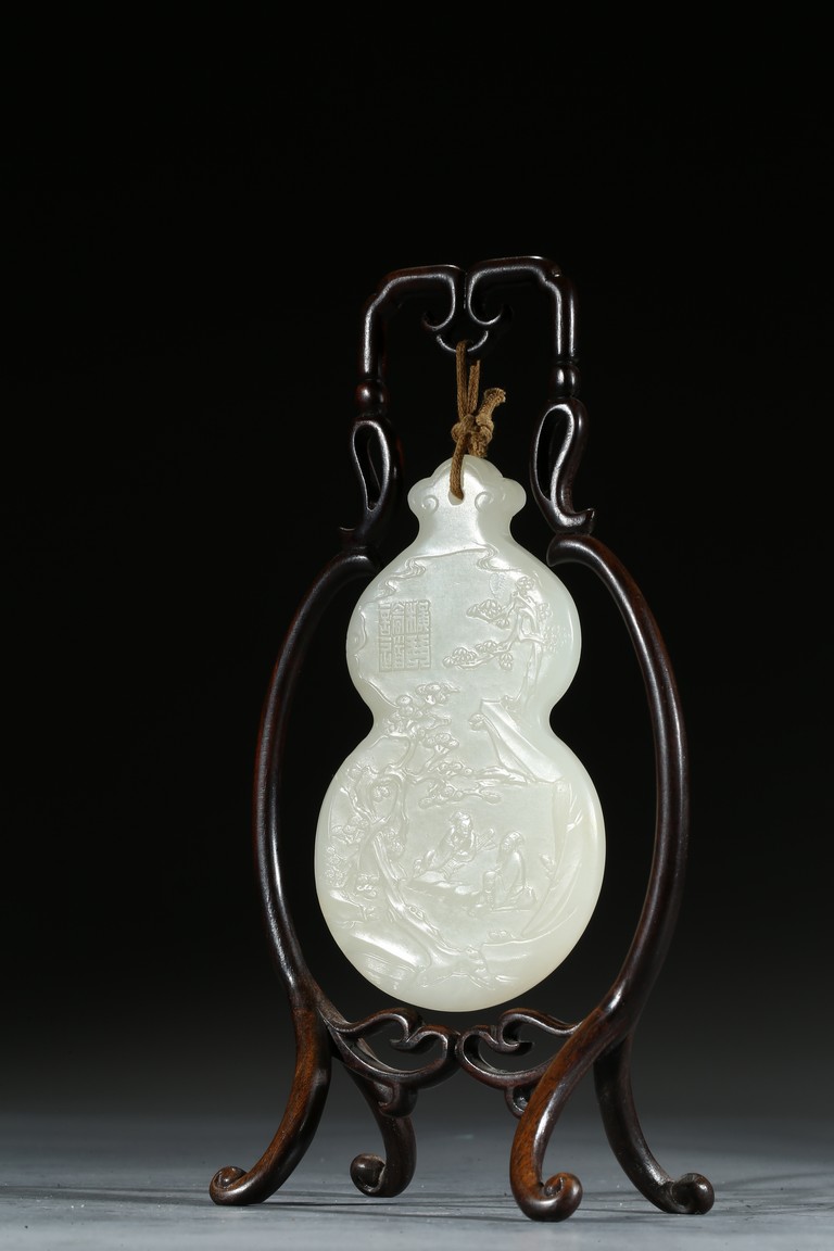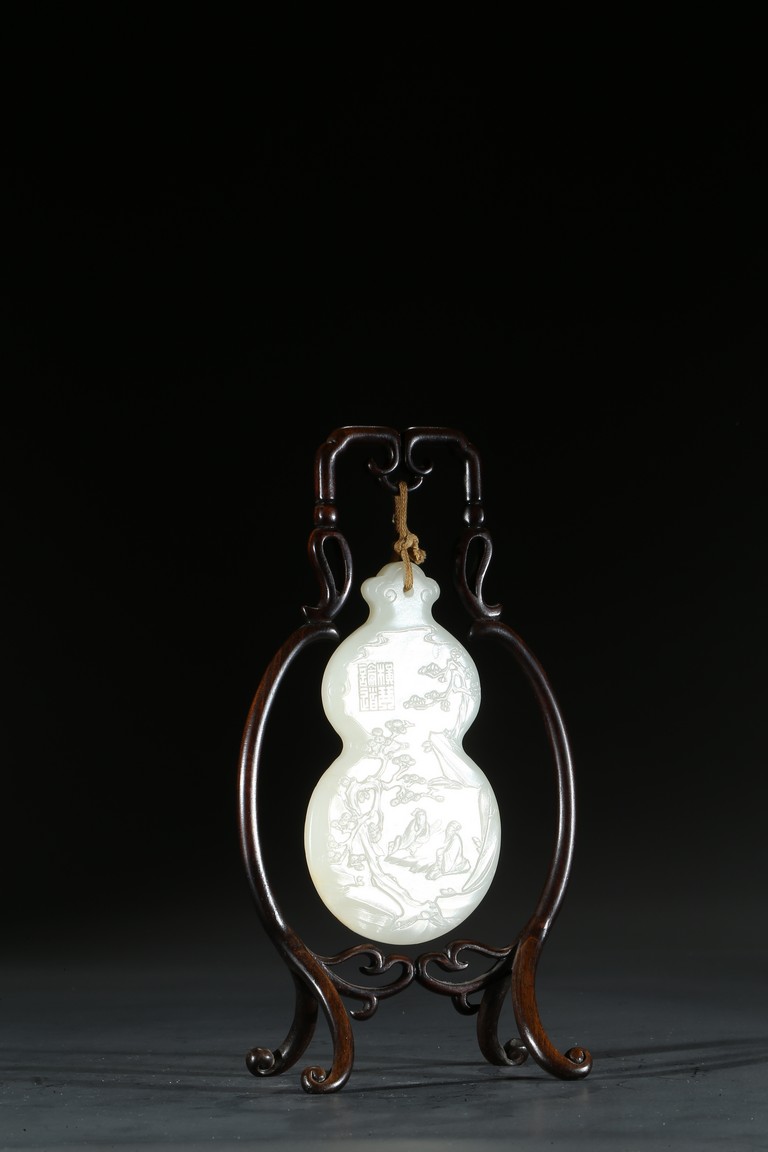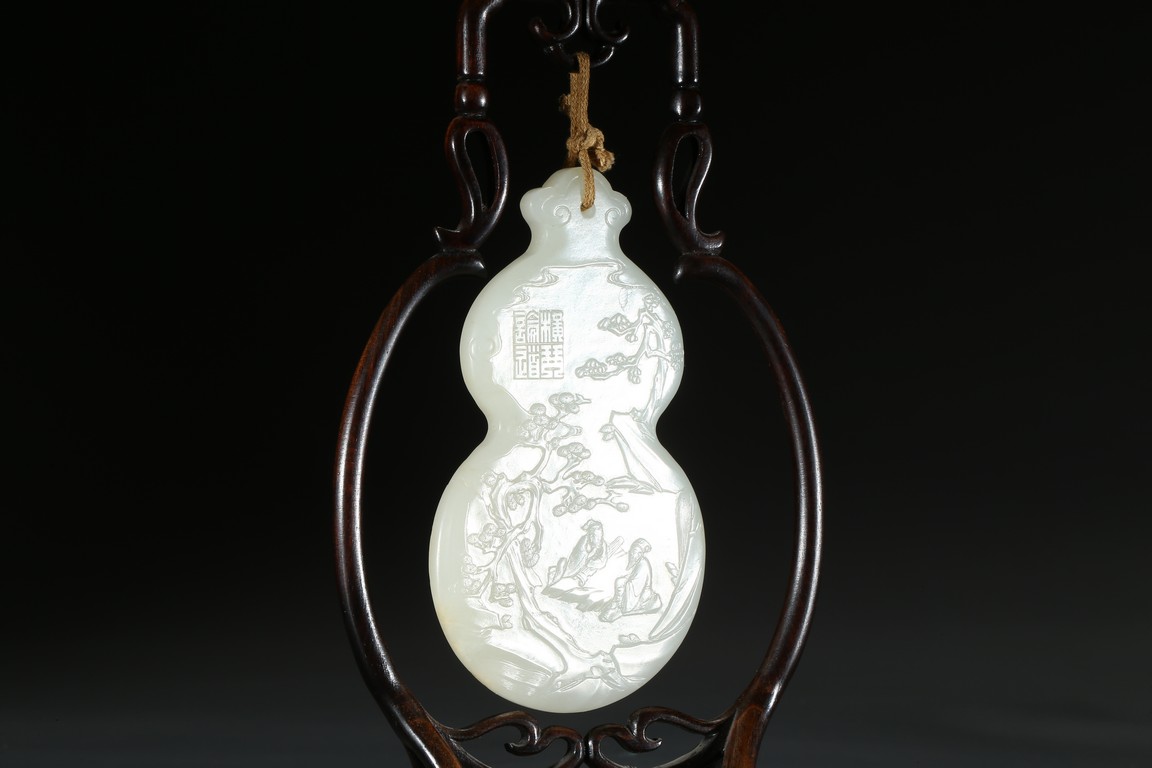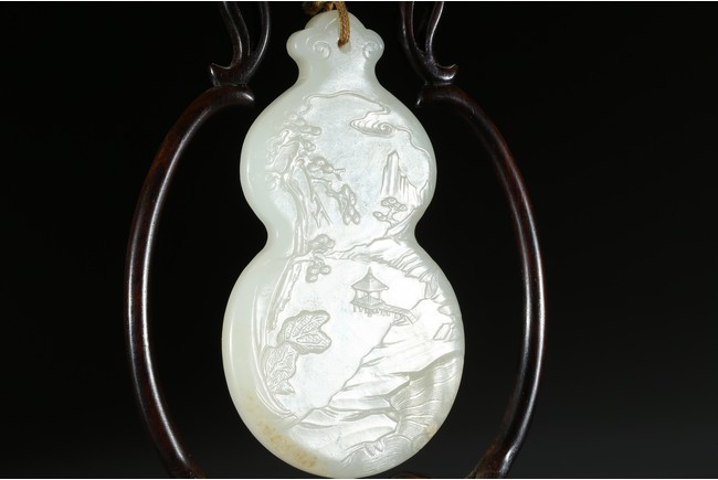 用白玉製成葫蘆形狀,玉質優良,細膩潔白。正反面細緻雕刻松樹、人物、卷雲、涼亭、山石。樹木枝繁葉茂,松針細緻精細,人物生動形象,雲朵舒展自然。“橫琴論道”款識正好與此雕刻場景相呼應。