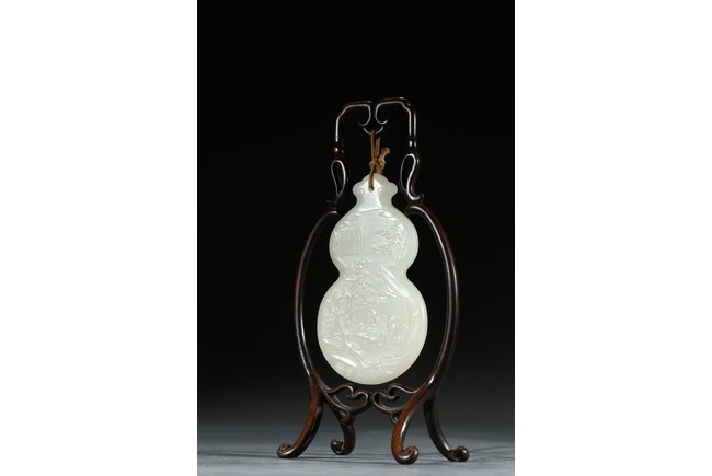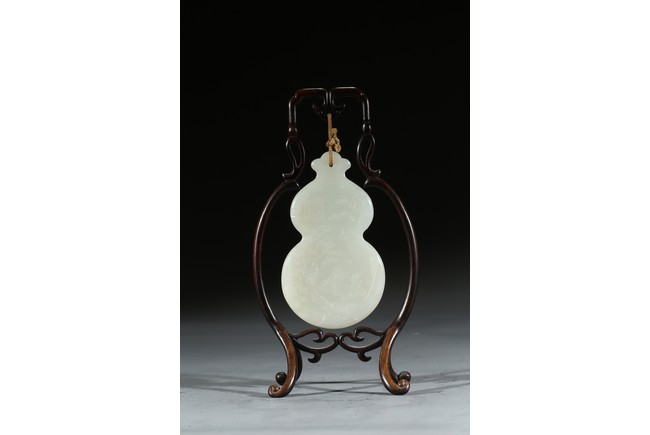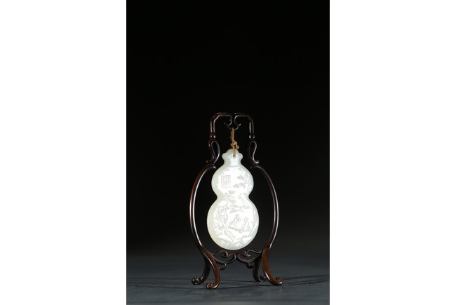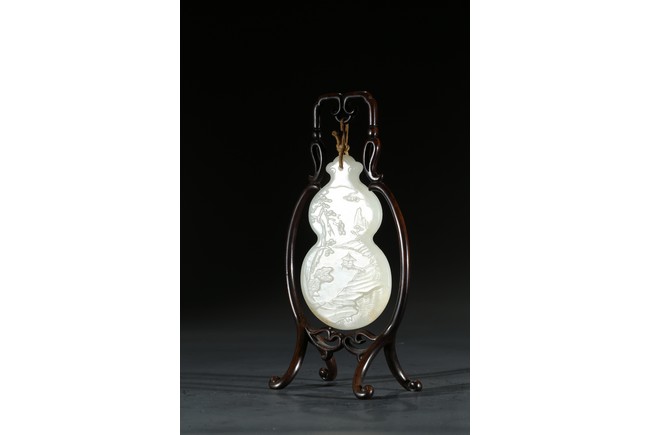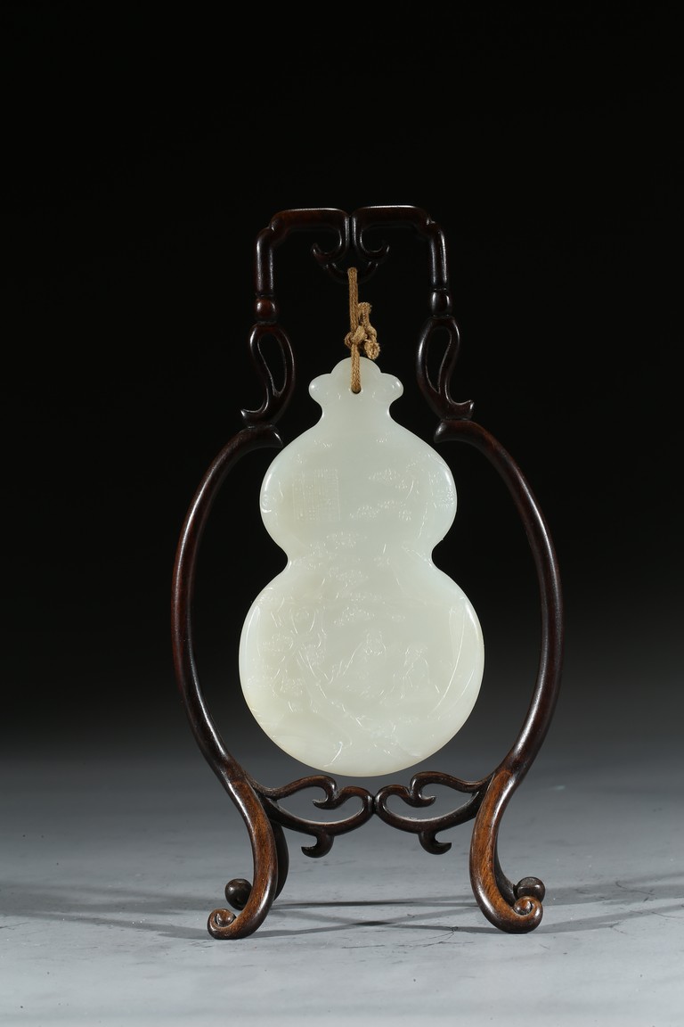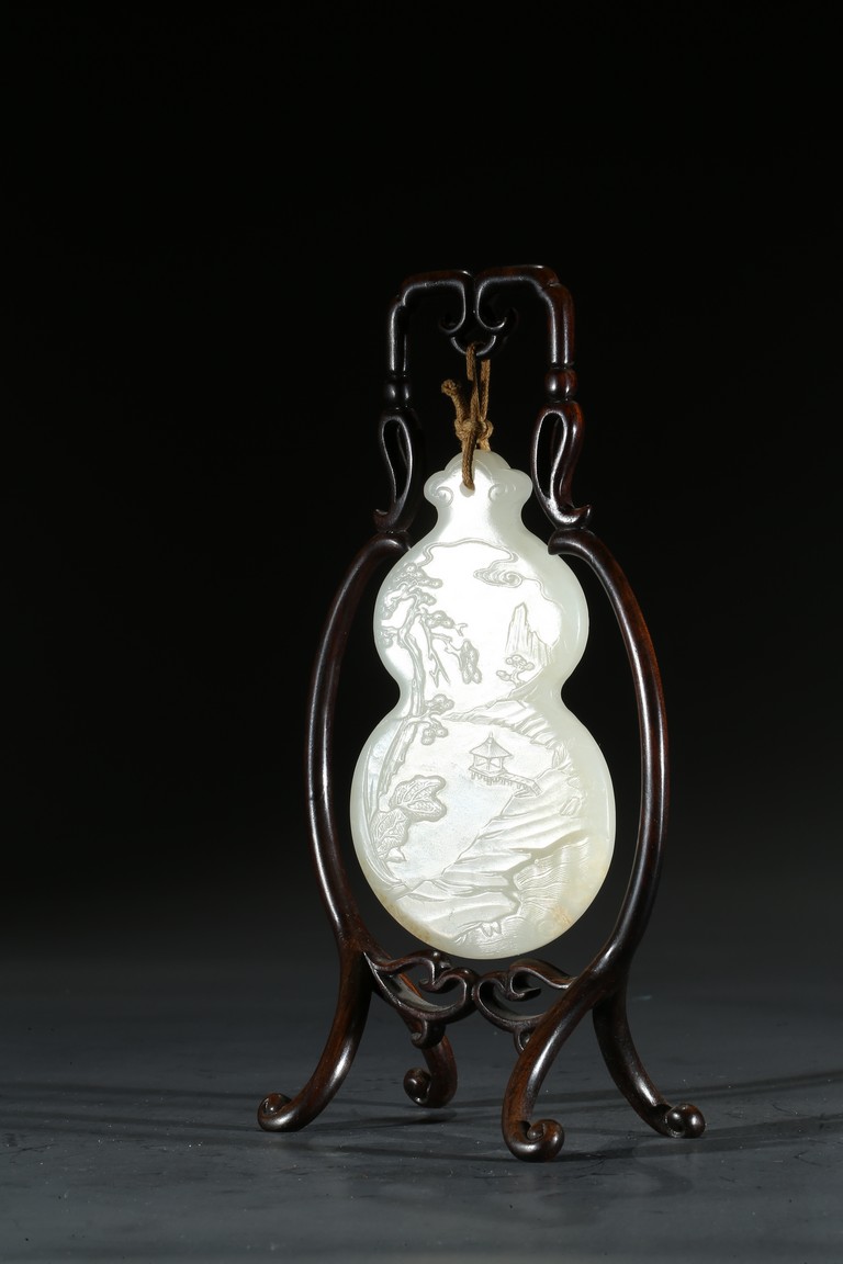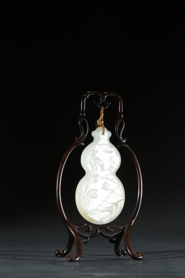 用白玉製成葫蘆形狀,玉質優良,細膩潔白。正反面細緻雕刻松樹、人物、卷雲、涼亭、山石。樹木枝繁葉茂,松針細緻精細,人物生動形象,雲朵舒展自然。“橫琴論道”款識正好與此雕刻場景相呼應。