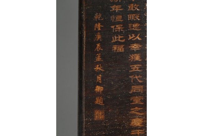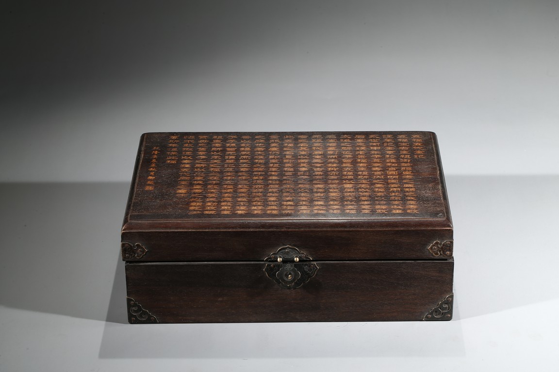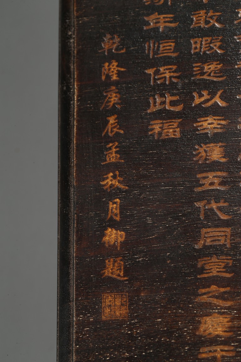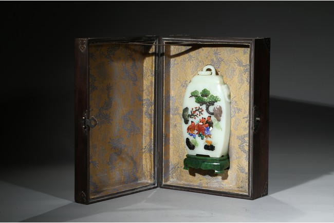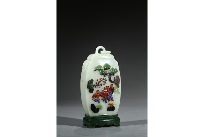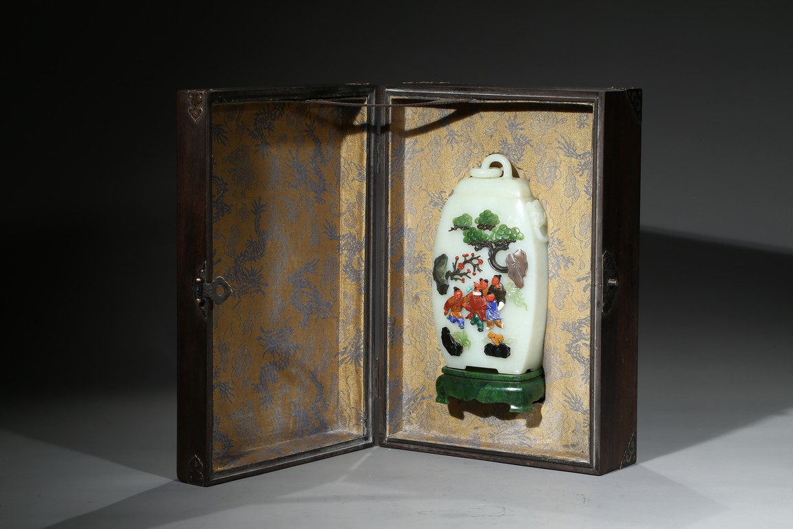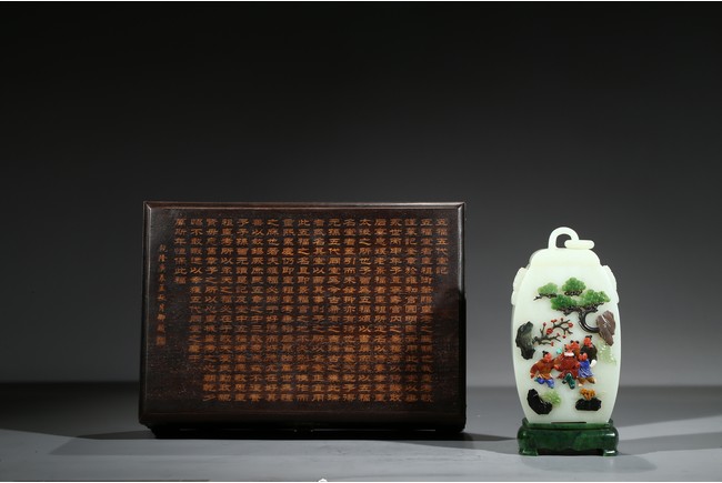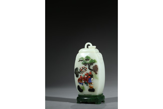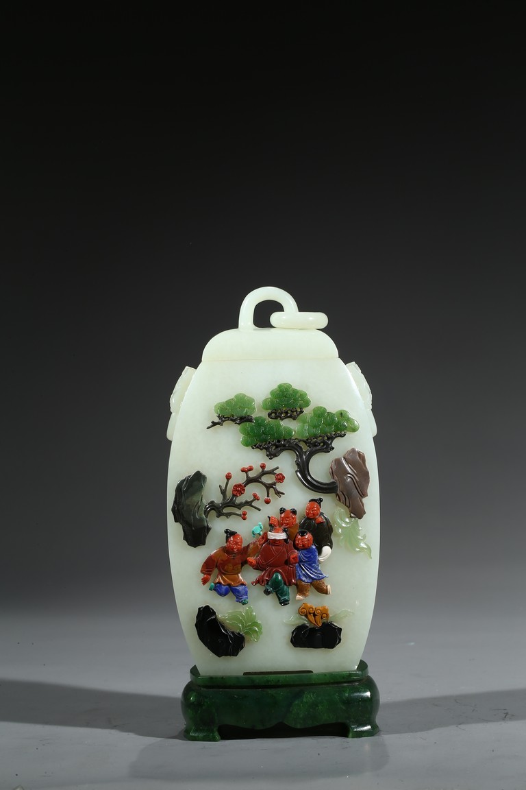 The body finely embellished to depict boys playing in a garden scene, all supported on a spinach green jade stand. Accompanied with an inscribed sandalwood box. Qing Dynasty period.
