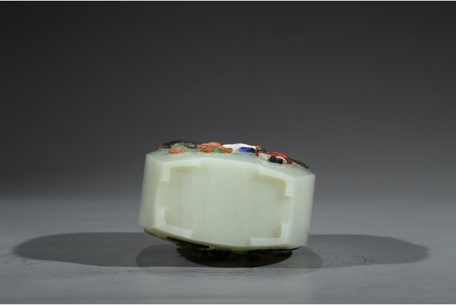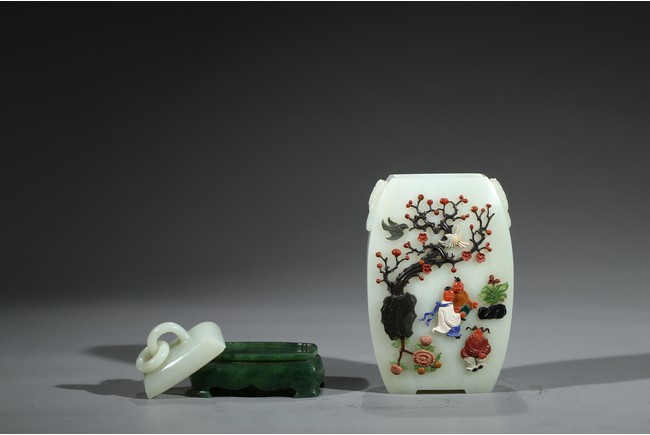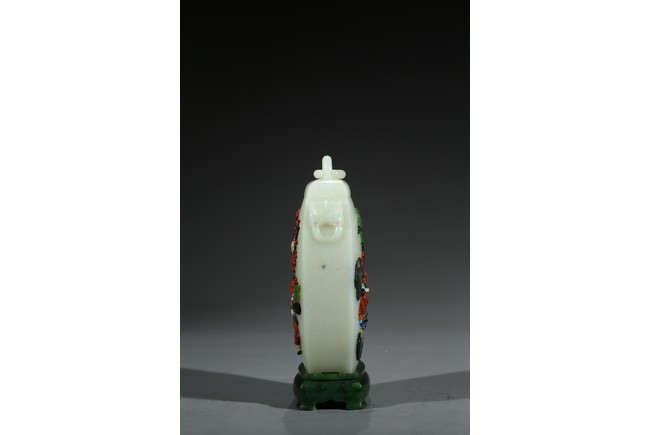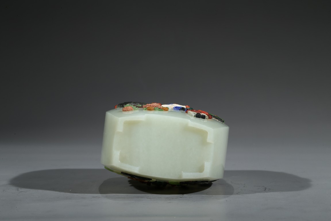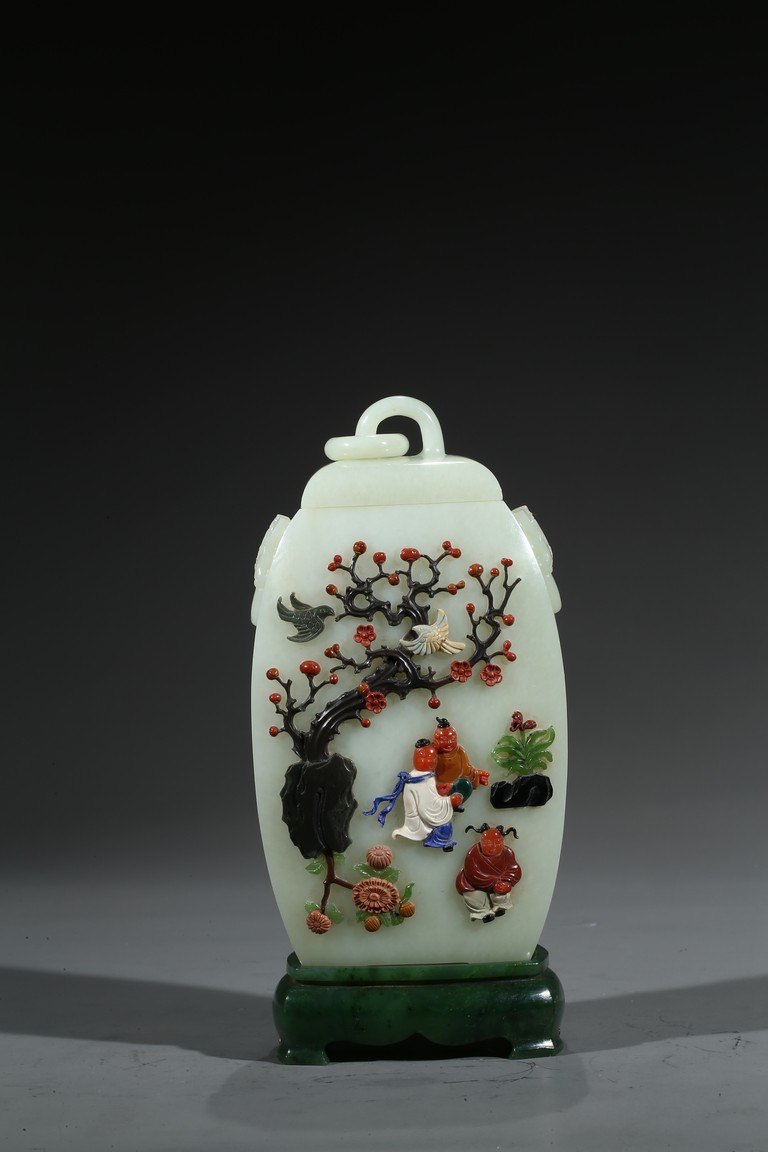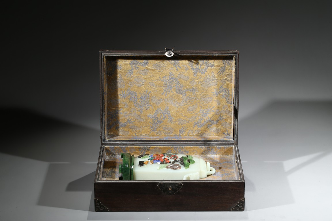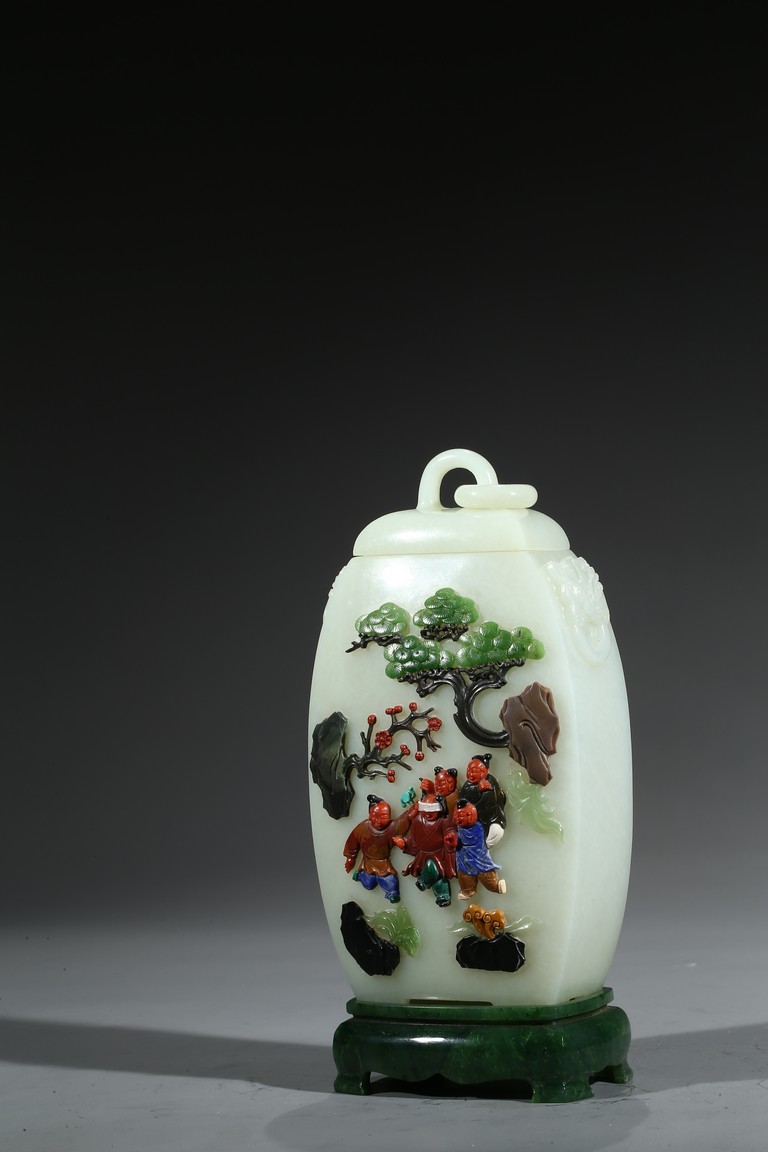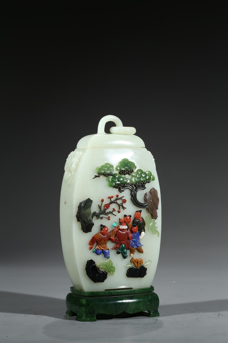 Provenance: Private San Francisco collection 本品白玉為材,玉質潔白無瑕、細膩瑩潤。器身呈扁圓形,鑲嵌百寶,用翡翠、瑪瑙、珊瑚、青金石、孔雀石、硨磲構成人物、花鳥、山石。整幅場景生動形象,頗具玩味。獅鈕,配有碧玉底座,乾隆御題詩紅木原裝盒。