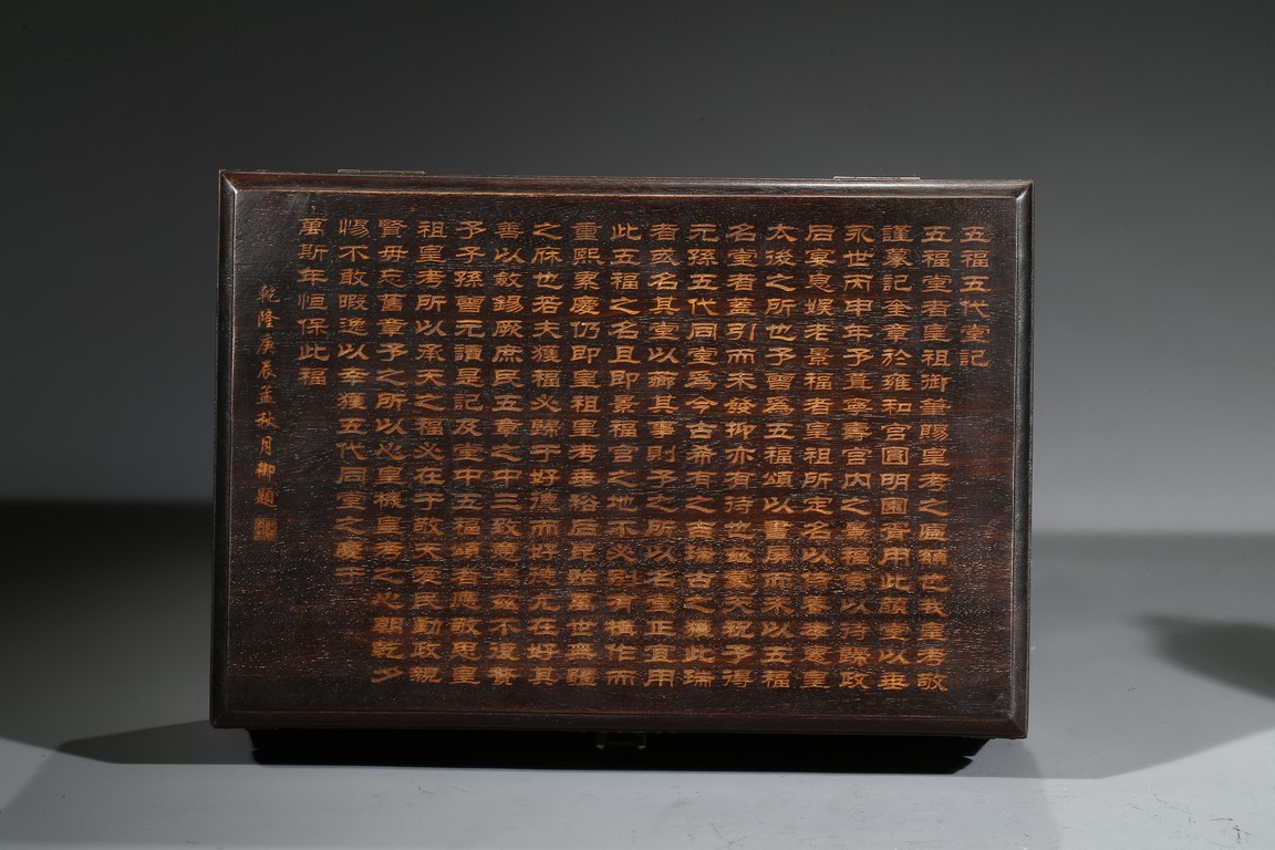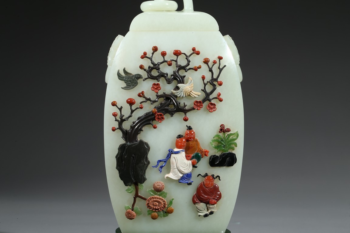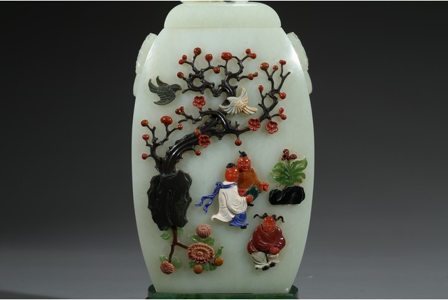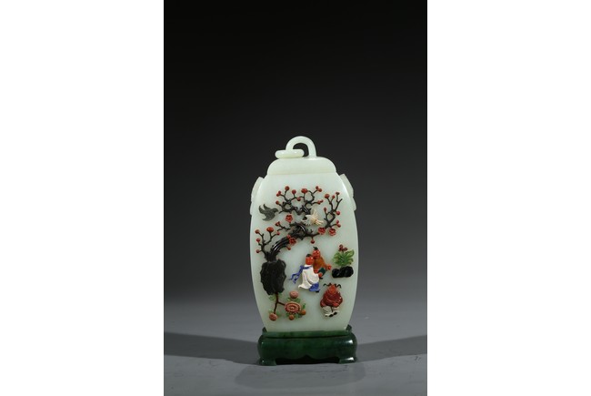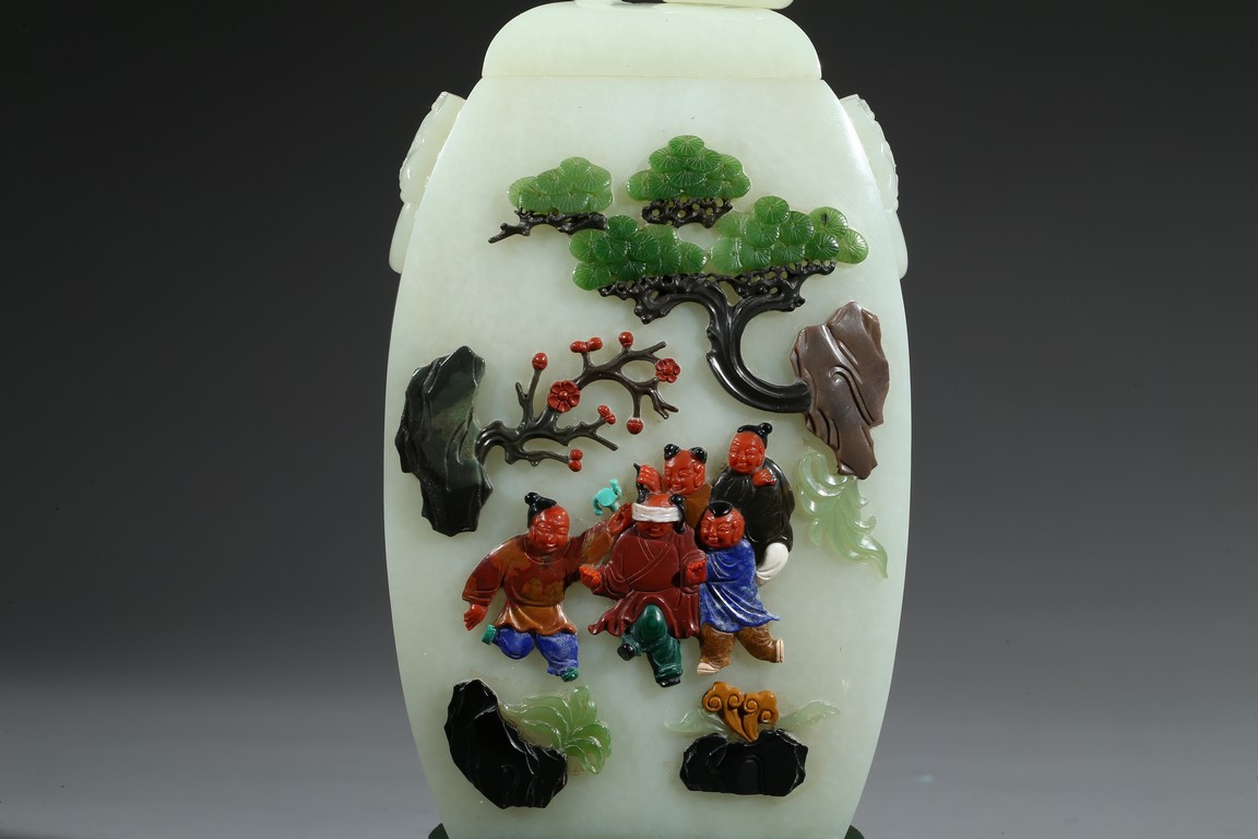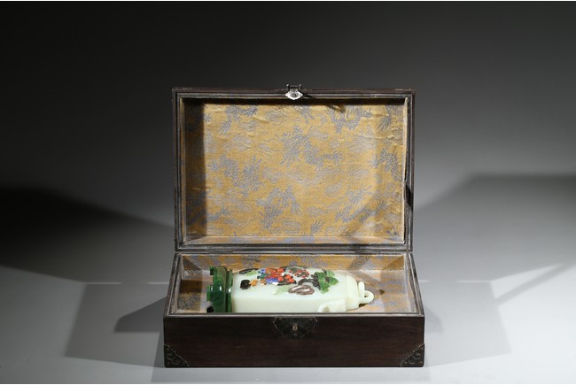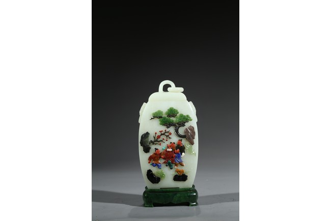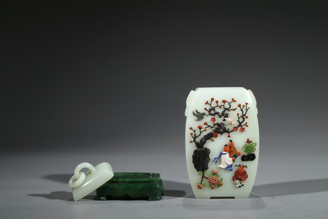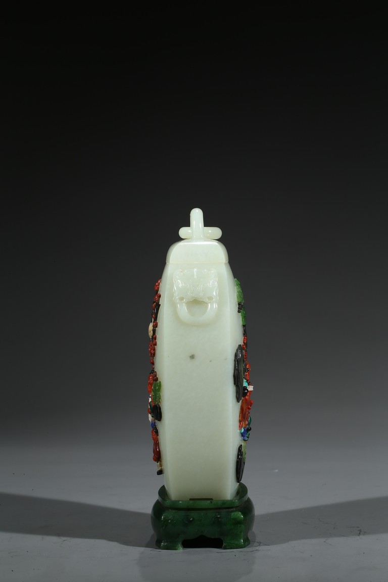 Provenance: Private San Francisco collection 本品白玉為材,玉質潔白無瑕、細膩瑩潤。器身呈扁圓形,鑲嵌百寶,用翡翠、瑪瑙、珊瑚、青金石、孔雀石、硨磲構成人物、花鳥、山石。整幅場景生動形象,頗具玩味。獅鈕,配有碧玉底座,乾隆御題詩紅木原裝盒。