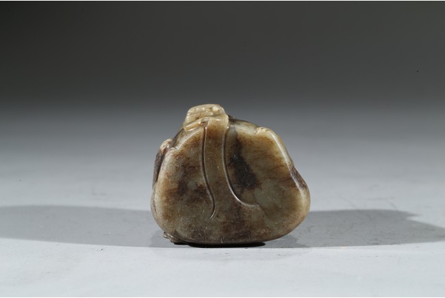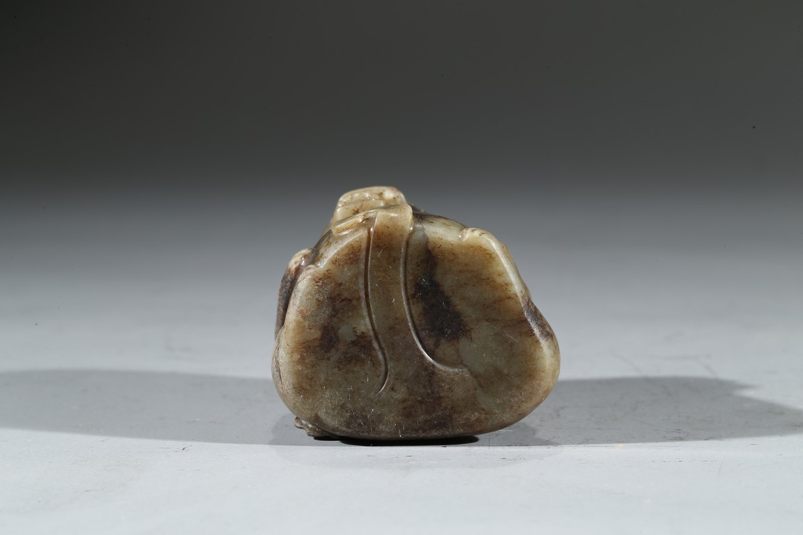 Carved in the form of a bear with mouth agape. The stone is of mottled celadon tone.