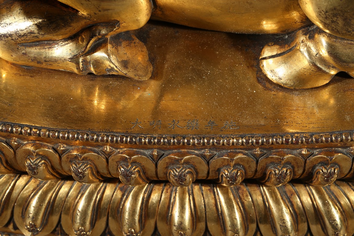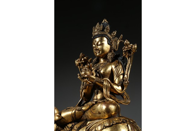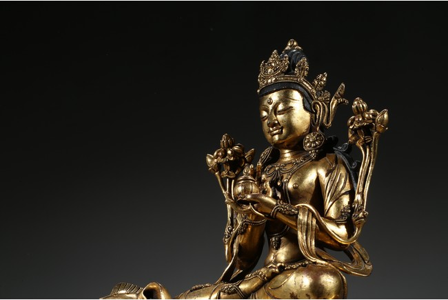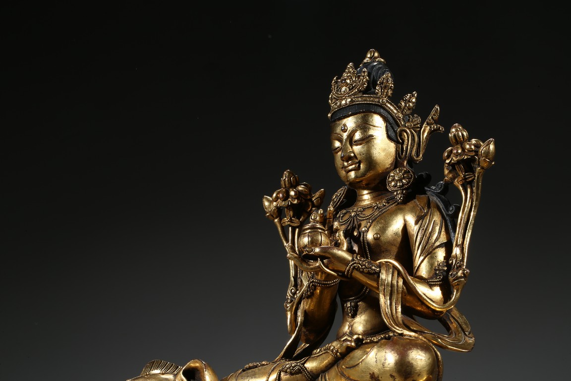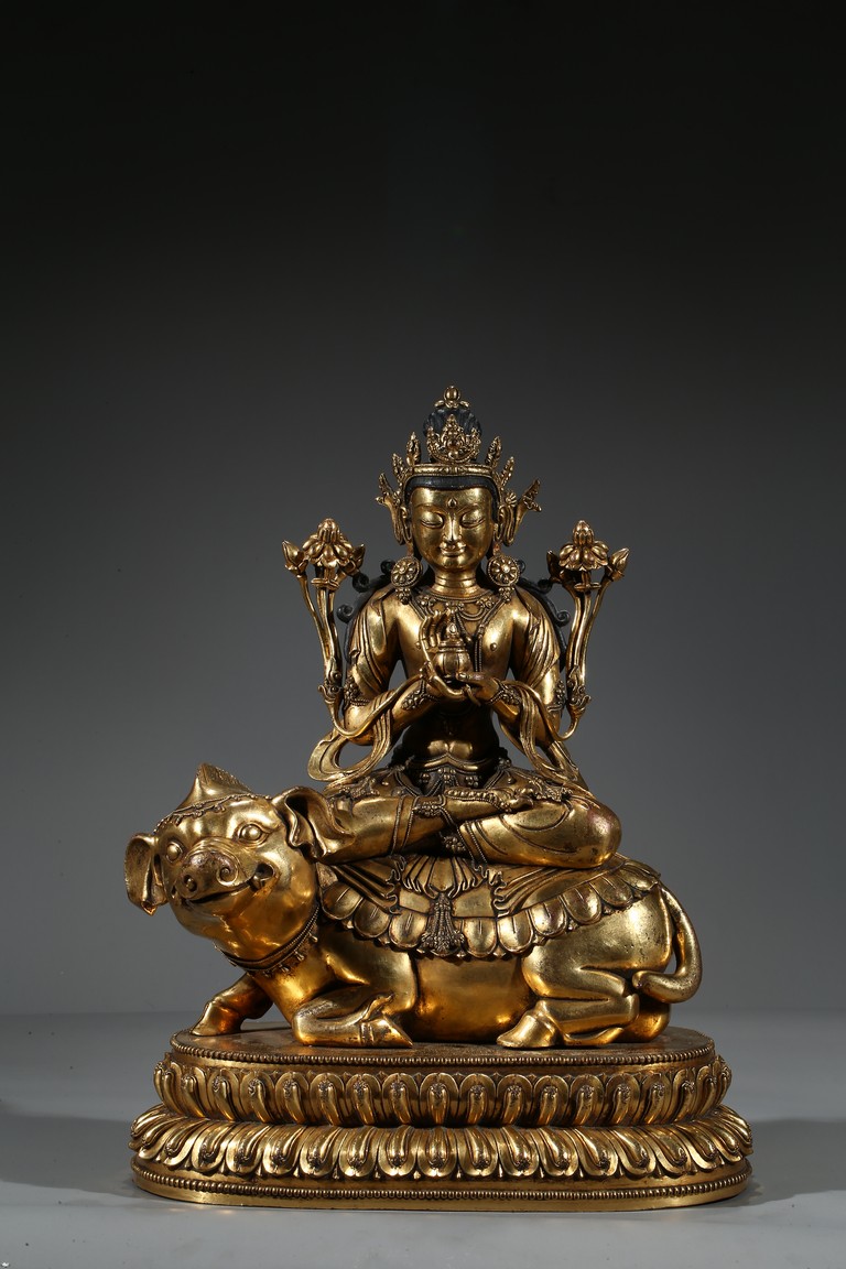 摩利支天,梵名Marici之音譯,也譯作末利天或摩裡支,意譯為威光天、陽焰天,又稱為光明天女,集光天女。此天原為古印度民間崇拜之神,相傳為帝釋天的眷屬。神通廣大,能在日天(太陽)前行走,她能看到日天,日天卻看不見她,後為佛教所吸收,列於天部,密教的事續將其做為本尊。此天具有大神通自在力,擅於隱身,無人能害,無人能縛,可以護國護民,救兵戈等難,因此她為武士所特別信奉,被奉為戰爭之神。修學此尊能消除障難,增進利益。此尊造像高髮髻,頭戴五葉冠飾。面龐豐圓,五官端正,帶有笑意,坐於豬身上,雙手抱著寶瓶,下身著寬鬆長裙,遊戲坐於野豬之上,下承雙層覆蓮蓮座。整像胎體厚重,量度準確,金水濃厚,工藝精美。