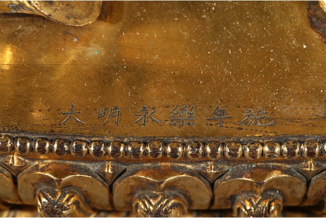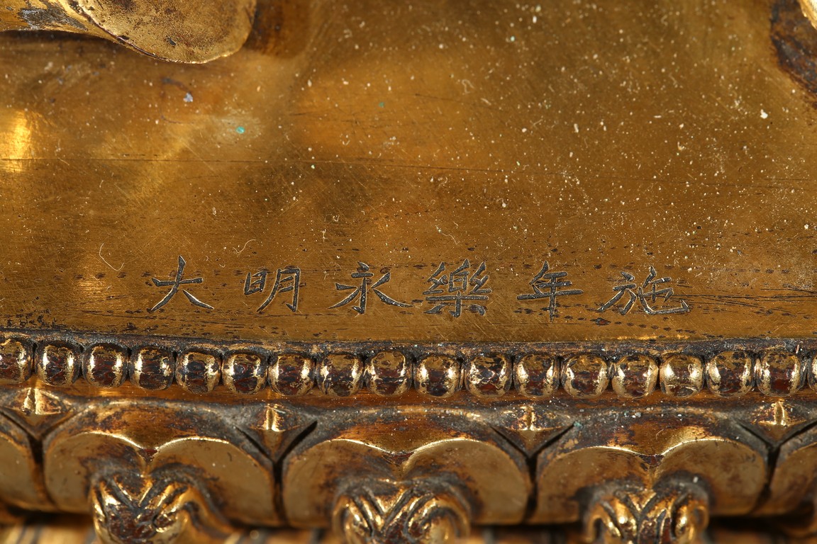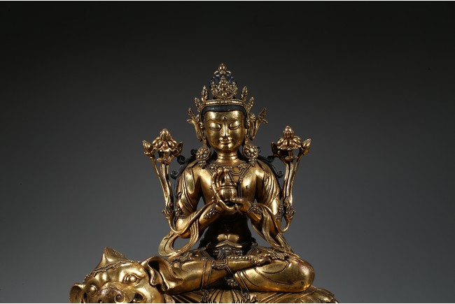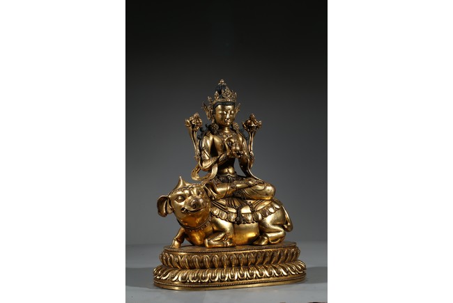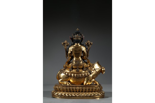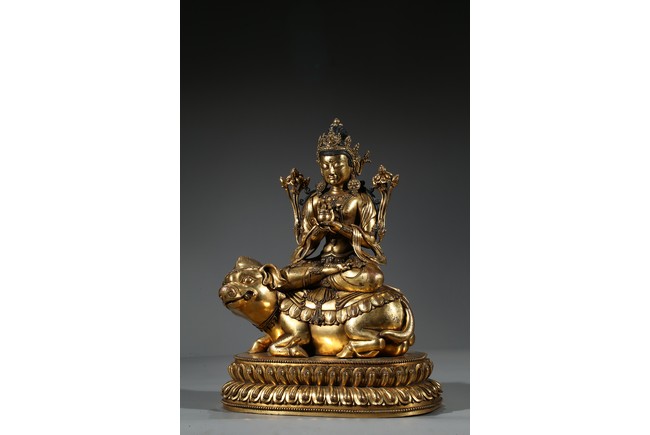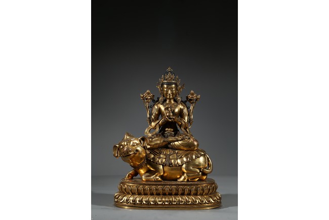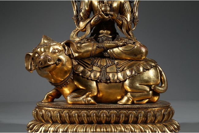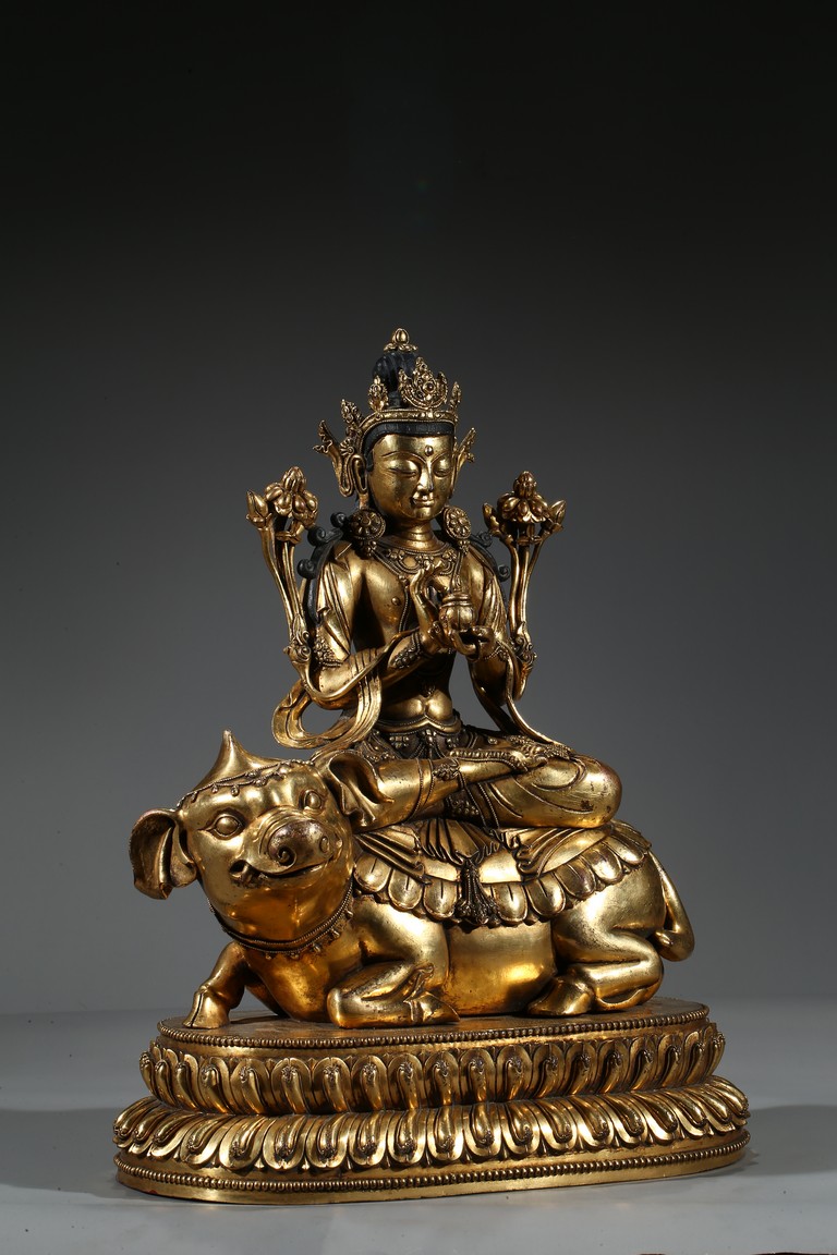 The bodhisattva is shown seated upon a recumbent mythical beast of pig head and buffalo feet, wearing loose dhoti and adorned with jewelry, hands in mutra and together holding a vessel, with serene expression, all supported on a double lotus throne. Ming Dynasty period.