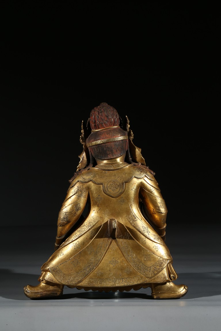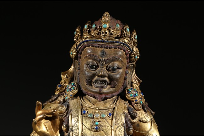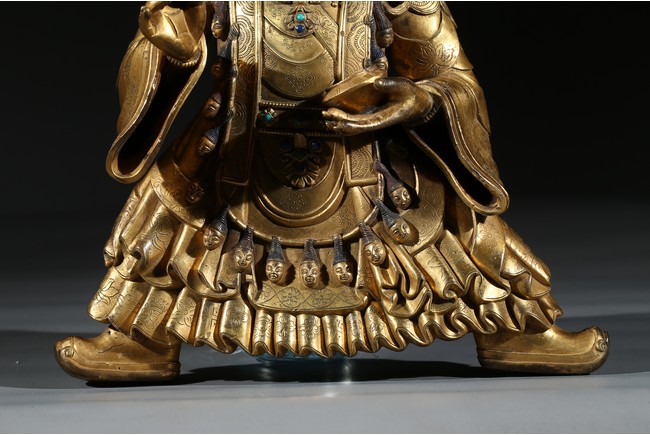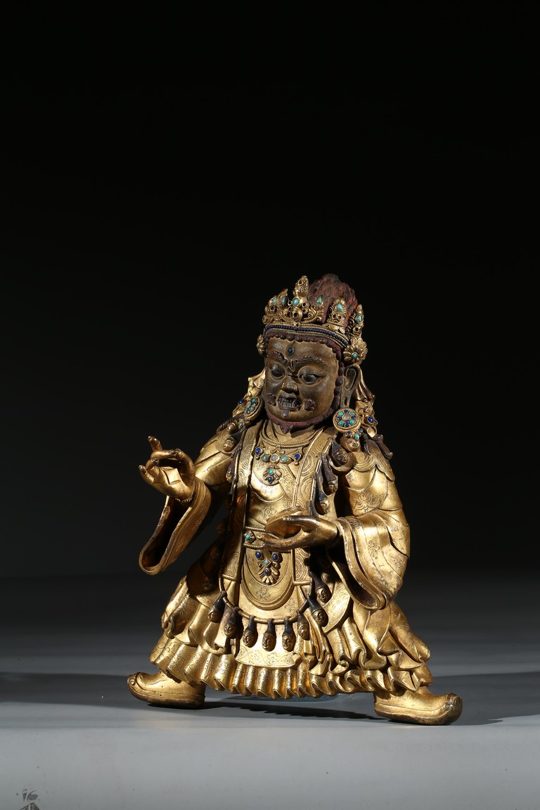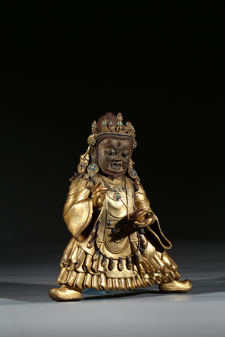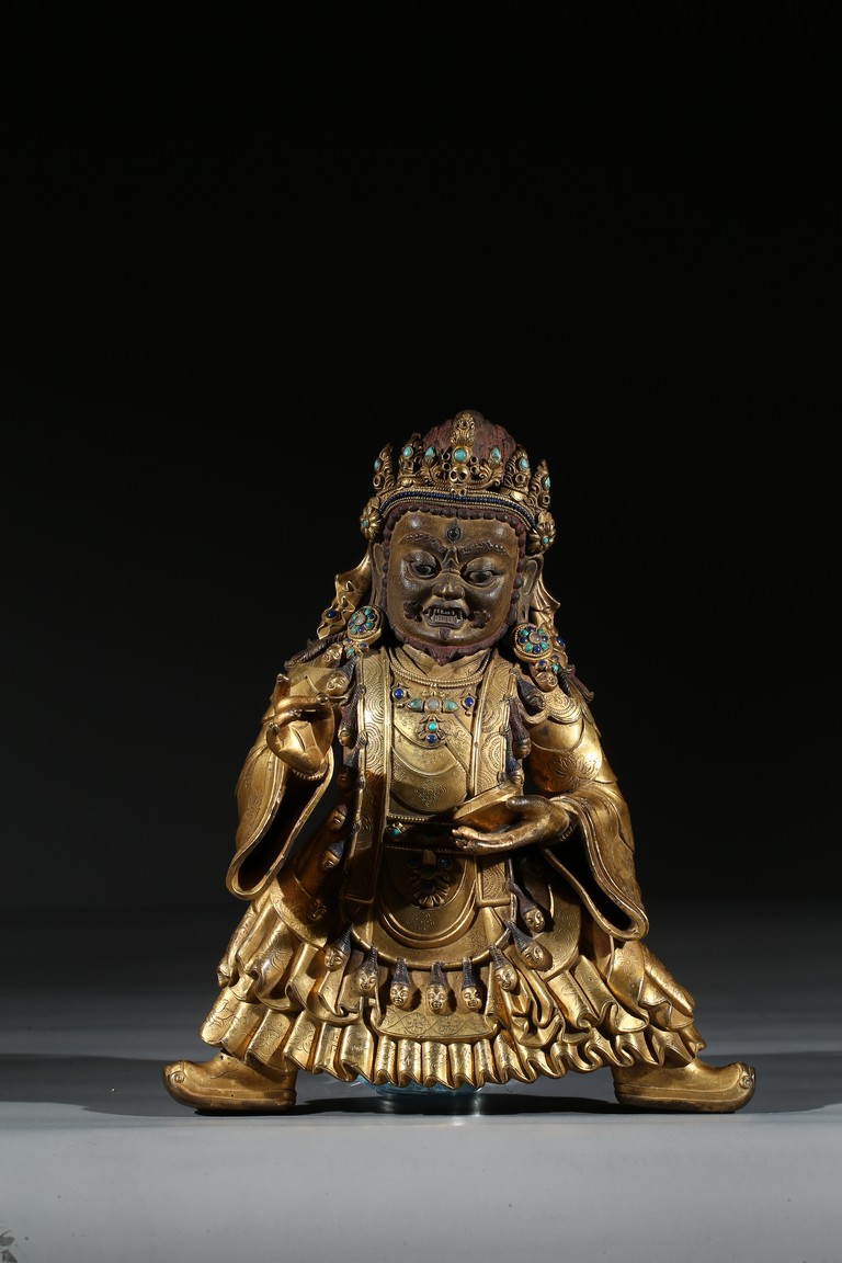 大黑天是藏傳佛教密宗中重要的護法神,是專治疾病之神及財富之神。被認為是大日如來降魔時的忿怒相。此尊大黑天一面二臂三目,立姿。頭髮豎立,眉毛呈火焰狀,三目圓瞪,口露獠牙,樣貌威猛。身披五十鮮人首幔,項鏈、臂釧、足釧俱足。此尊造像使用紅銅鑄造,銅色十分醇厚,器身通體鎏金,金水厚重,保存完好,造像比例協調,生動傳神、威猛,工藝水平極佳,是早期造像中宗教意義與工藝美感的結合。