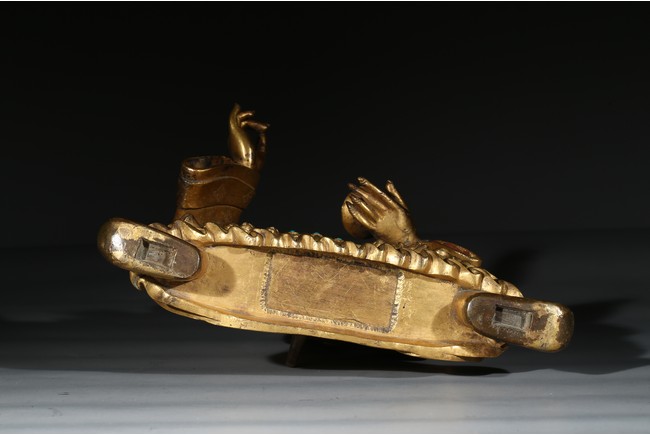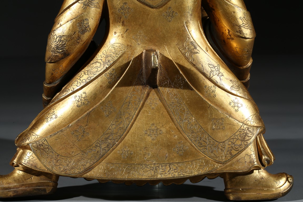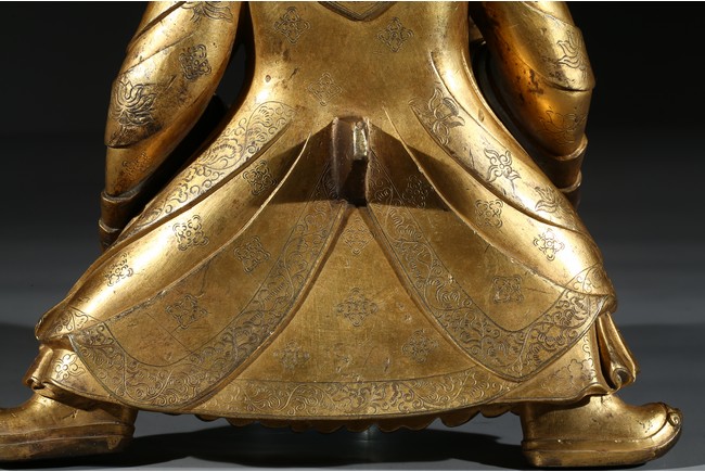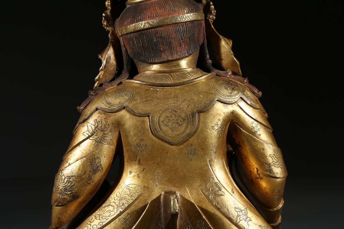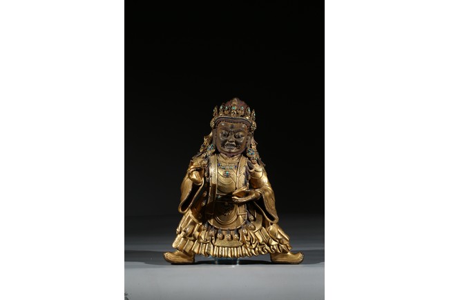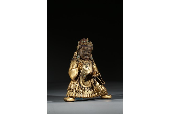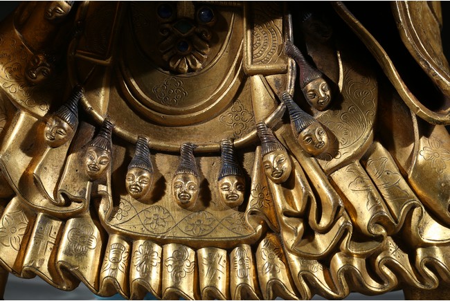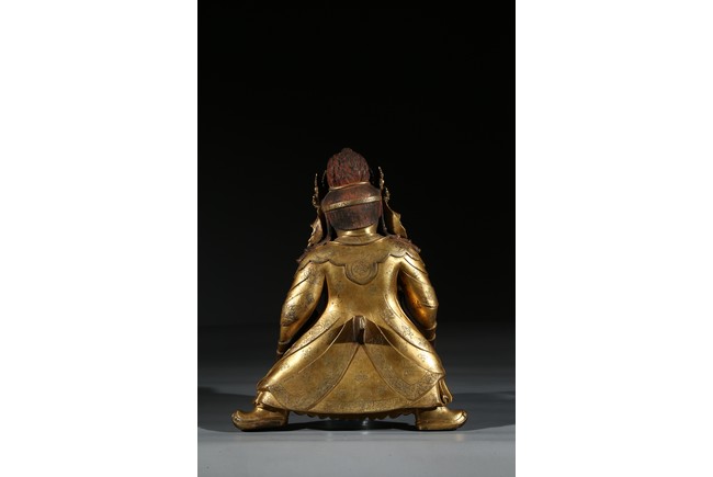 大黑天是藏傳佛教密宗中重要的護法神,是專治疾病之神及財富之神。被認為是大日如來降魔時的忿怒相。此尊大黑天一面二臂三目,立姿。頭髮豎立,眉毛呈火焰狀,三目圓瞪,口露獠牙,樣貌威猛。身披五十鮮人首幔,項鏈、臂釧、足釧俱足。此尊造像使用紅銅鑄造,銅色十分醇厚,器身通體鎏金,金水厚重,保存完好,造像比例協調,生動傳神、威猛,工藝水平極佳,是早期造像中宗教意義與工藝美感的結合。