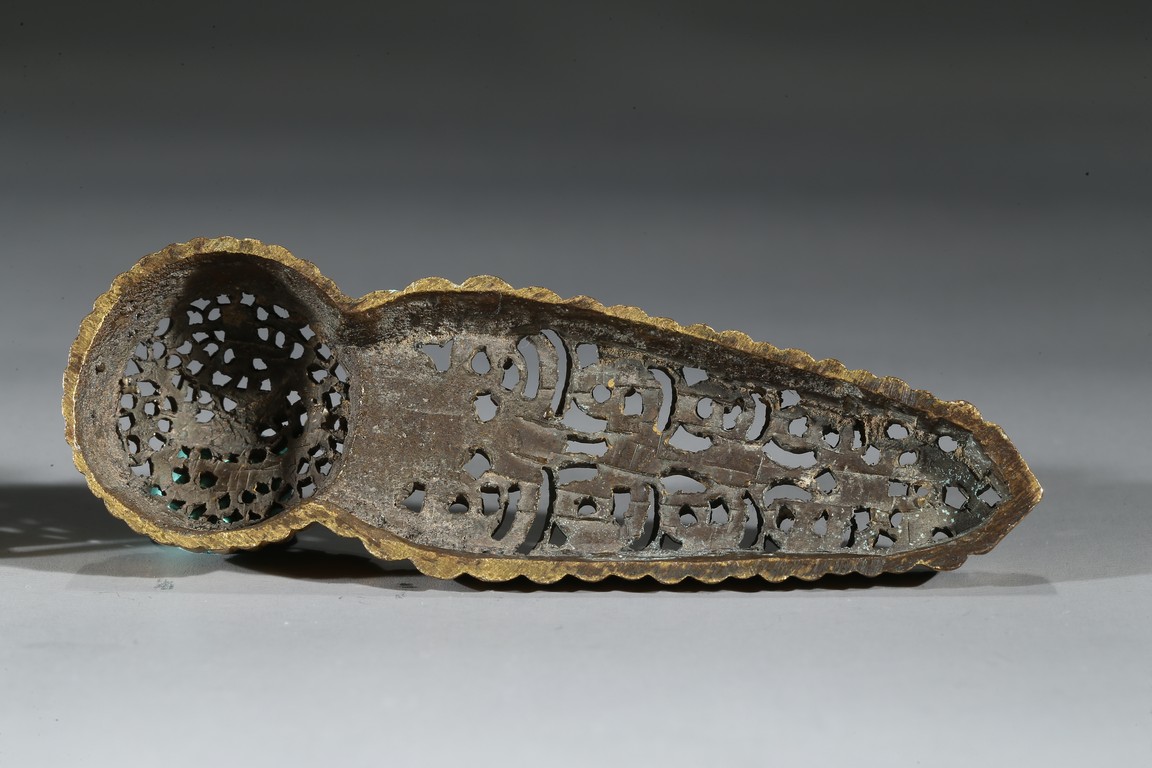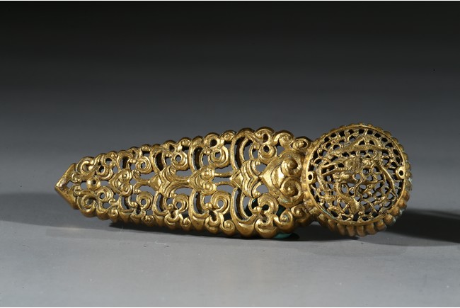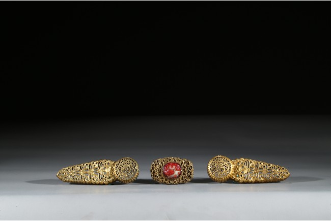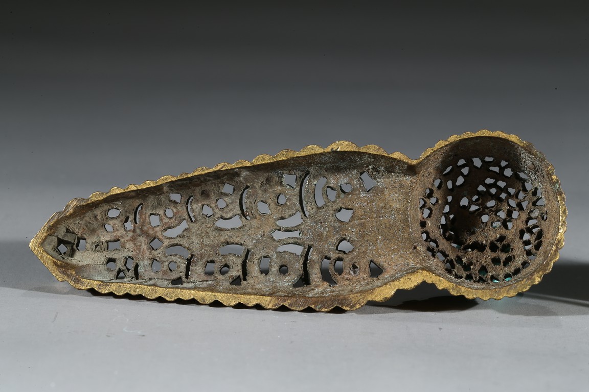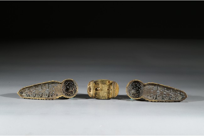 Consisting of two gilt-bronze openwork buckles and one buckle embellished with carnelian agate.