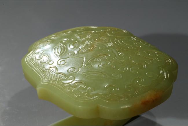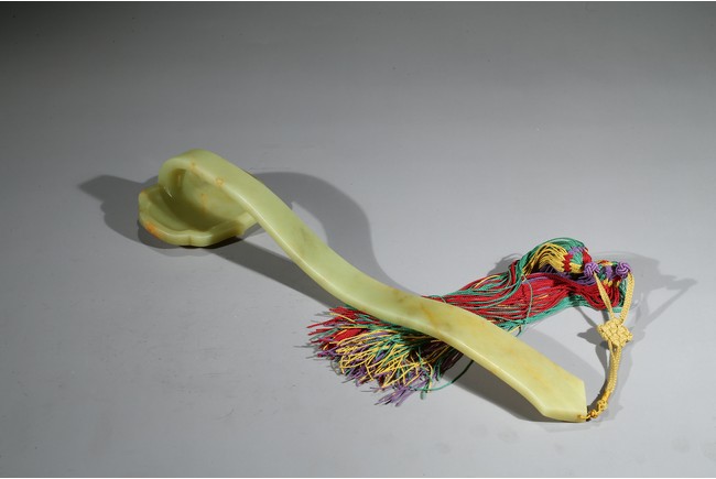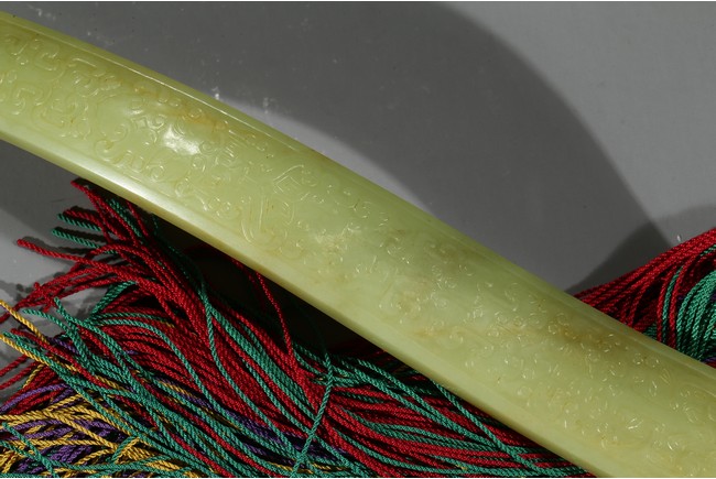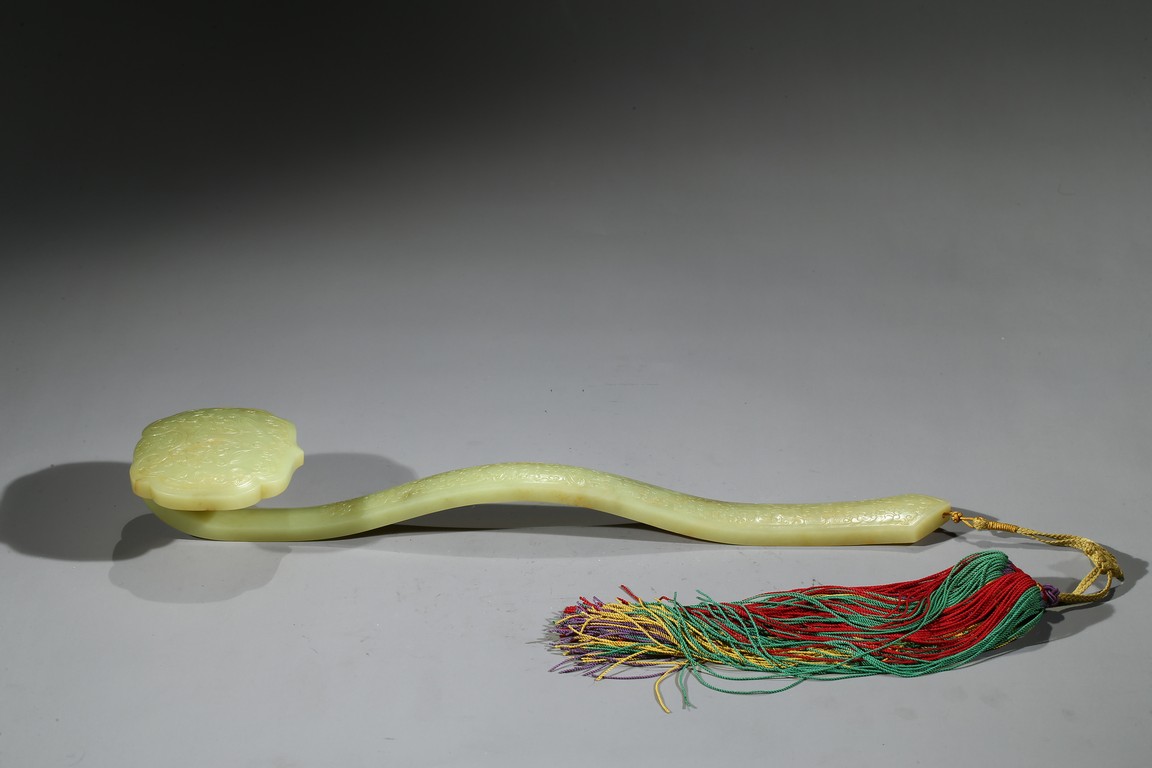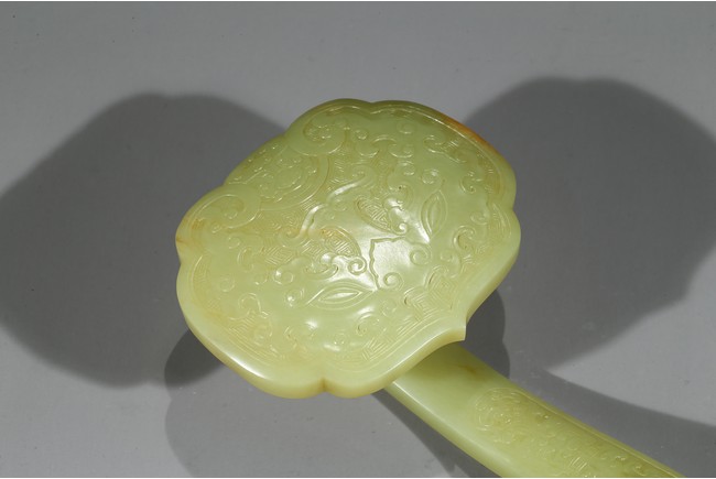 The shaped ruyi head is carved in low relief with archaistic taotie mask reserved on key-fret ground, the scepter handle finely carved with archaistic pattern, the stone is of pale yellow tone. Qing Dynasty Qianlong period.