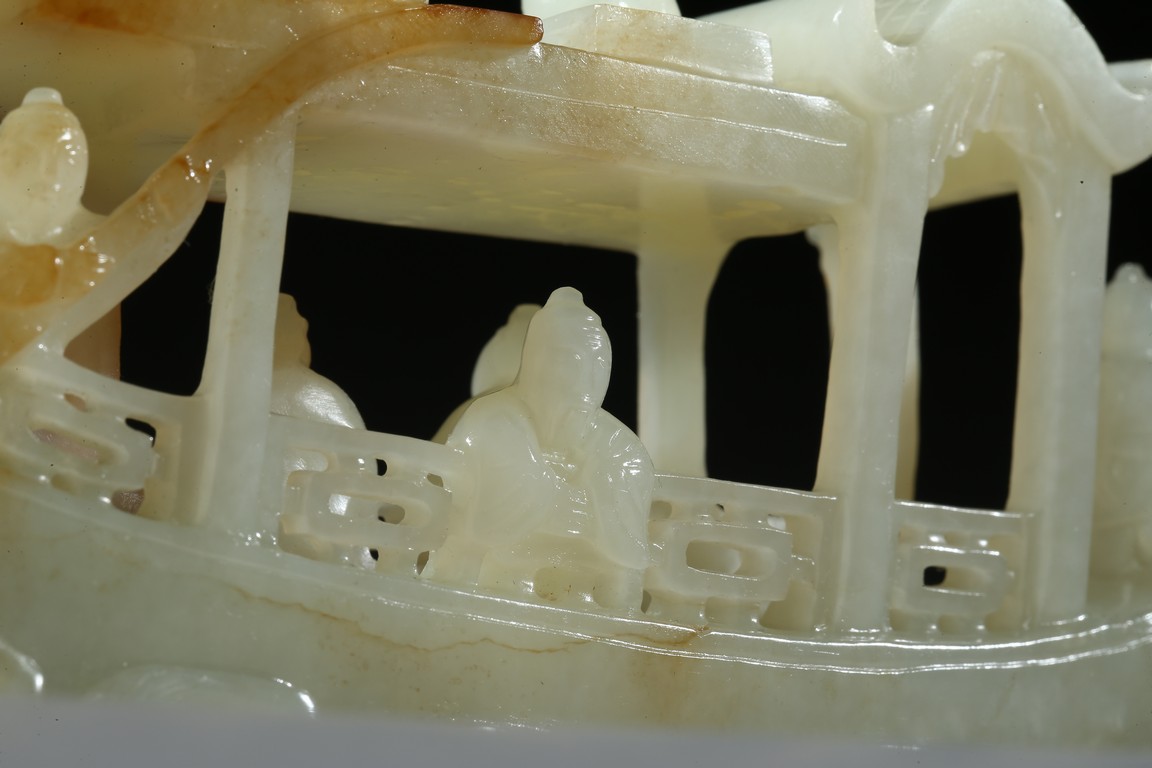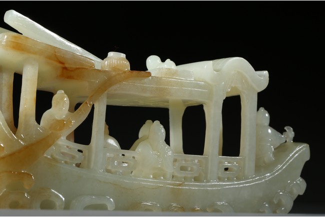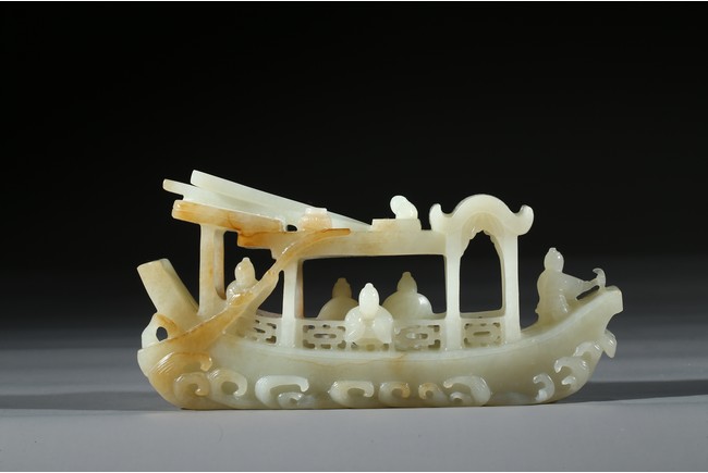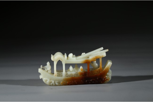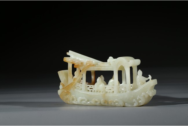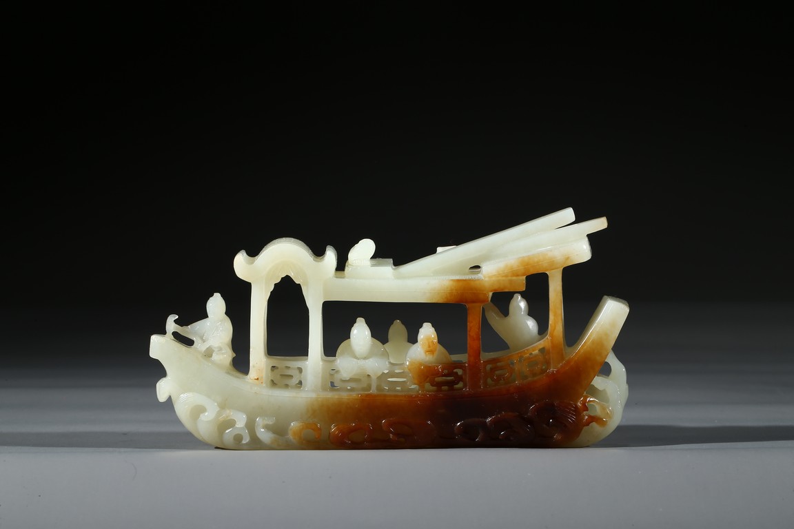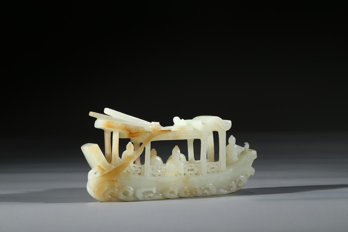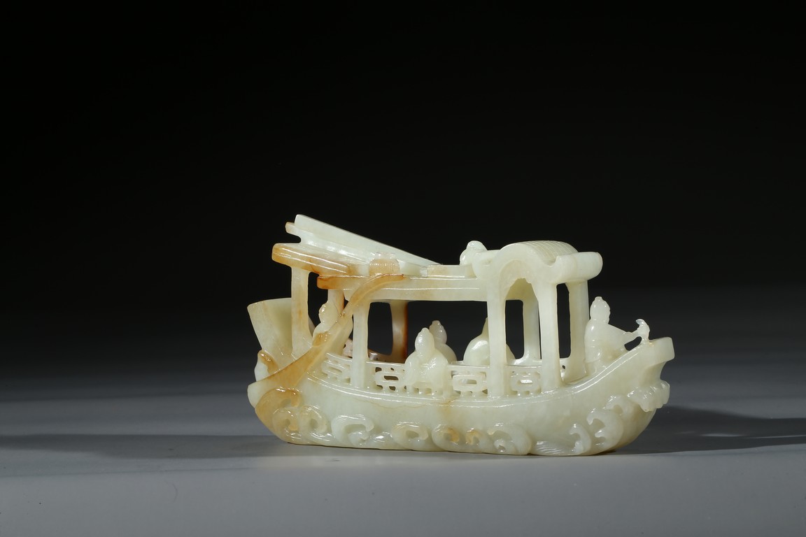 此件擺件由整塊和闐白玉雕琢而成,帶糖色,質地勻淨細膩,卓然超群。良工巧思化作精湛的工藝,完美的展現在這一件作品之上。其立體圓雕一艘畫舫,仿生造型,有艙有棚,艄公在船尾掌舵,船頭有一位船工,船板之上三人聚首,喜不自勝,暢遊於江上,引人神思。此類題材擺件於清代較為盛行,多有表現百姓充盈富足之生活面貌,亦有讚頌加官進爵、仙人乘槎之題材,取順水推舟,一帆風順之意,將藝術的表達與現實的願望完美的結合起來,為不可多得的玉雕珍品。