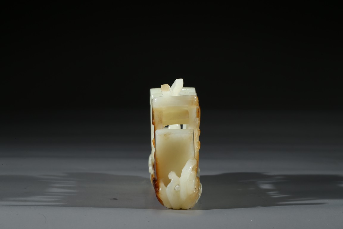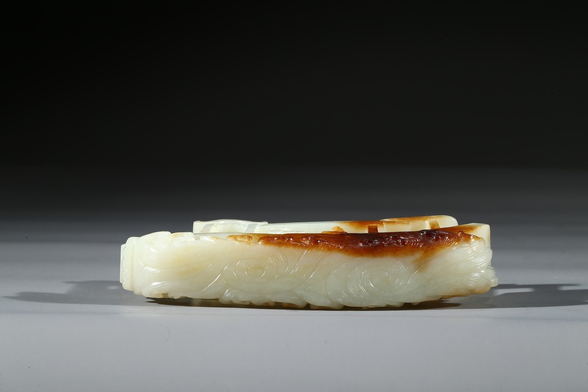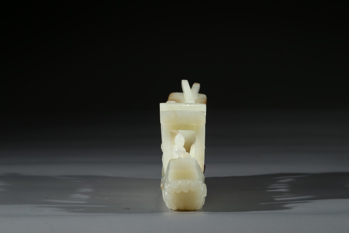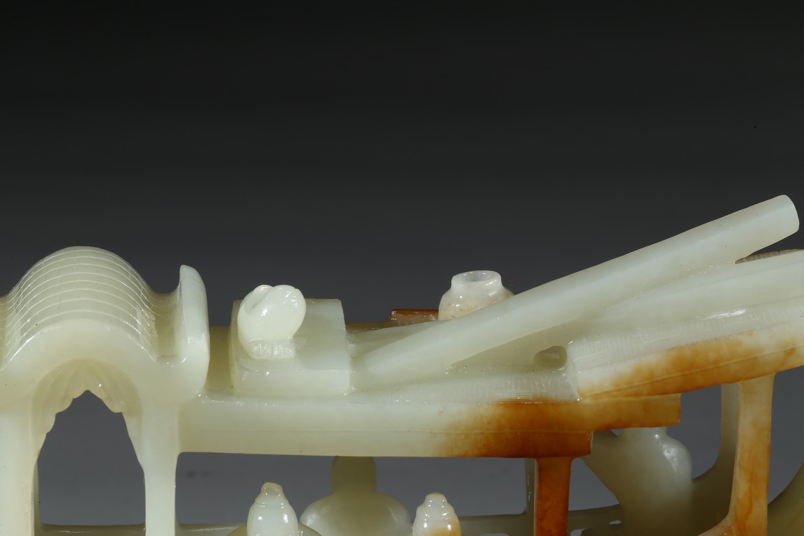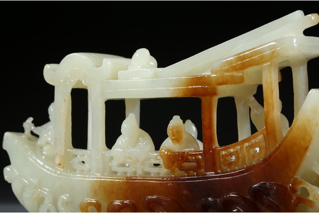此件擺件由整塊和闐白玉雕琢而成,帶糖色,質地勻淨細膩,卓然超群。良工巧思化作精湛的工藝,完美的展現在這一件作品之上。其立體圓雕一艘畫舫,仿生造型,有艙有棚,艄公在船尾掌舵,船頭有一位船工,船板之上三人聚首,喜不自勝,暢遊於江上,引人神思。此類題材擺件於清代較為盛行,多有表現百姓充盈富足之生活面貌,亦有讚頌加官進爵、仙人乘槎之題材,取順水推舟,一帆風順之意,將藝術的表達與現實的願望完美的結合起來,為不可多得的玉雕珍品。