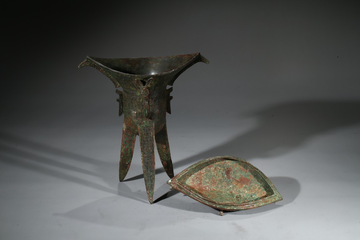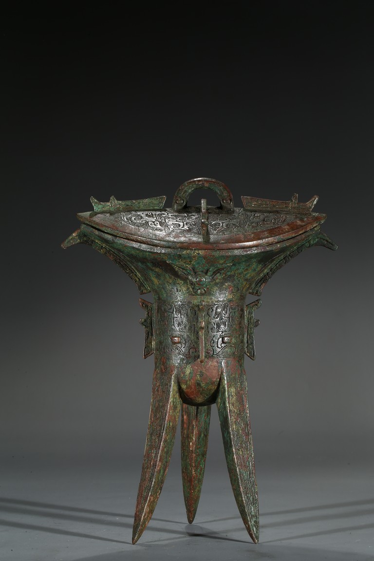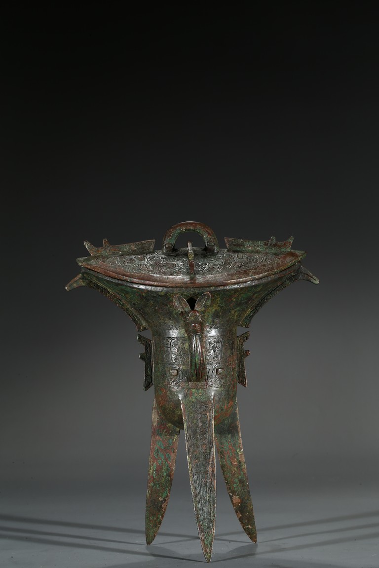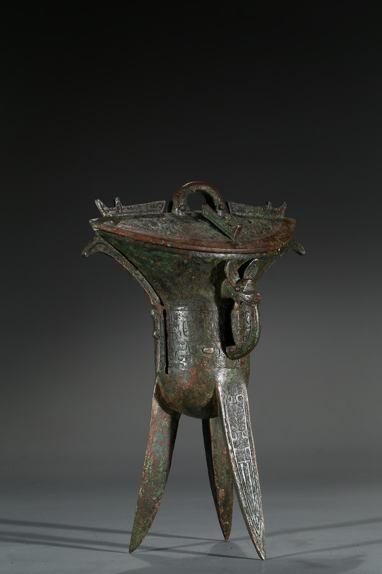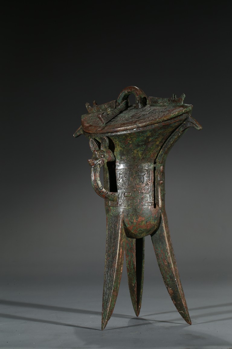 Provenance: Property from an important private Southern California collection 青銅蓋,流部寬厚上翹,杯體為圓卵形,腹部出脊,三足作等腰三角形分佈外撇,給人以穩定感。腹部裝飾以雲雷紋為地的獸面紋,獸面紋的雙目圓凸。這件青銅爵的鑄造工藝成熟完善,器型規整,紋飾的裝飾頗為精緻,為典型的中國古代器物。 來源:南加州私人收藏