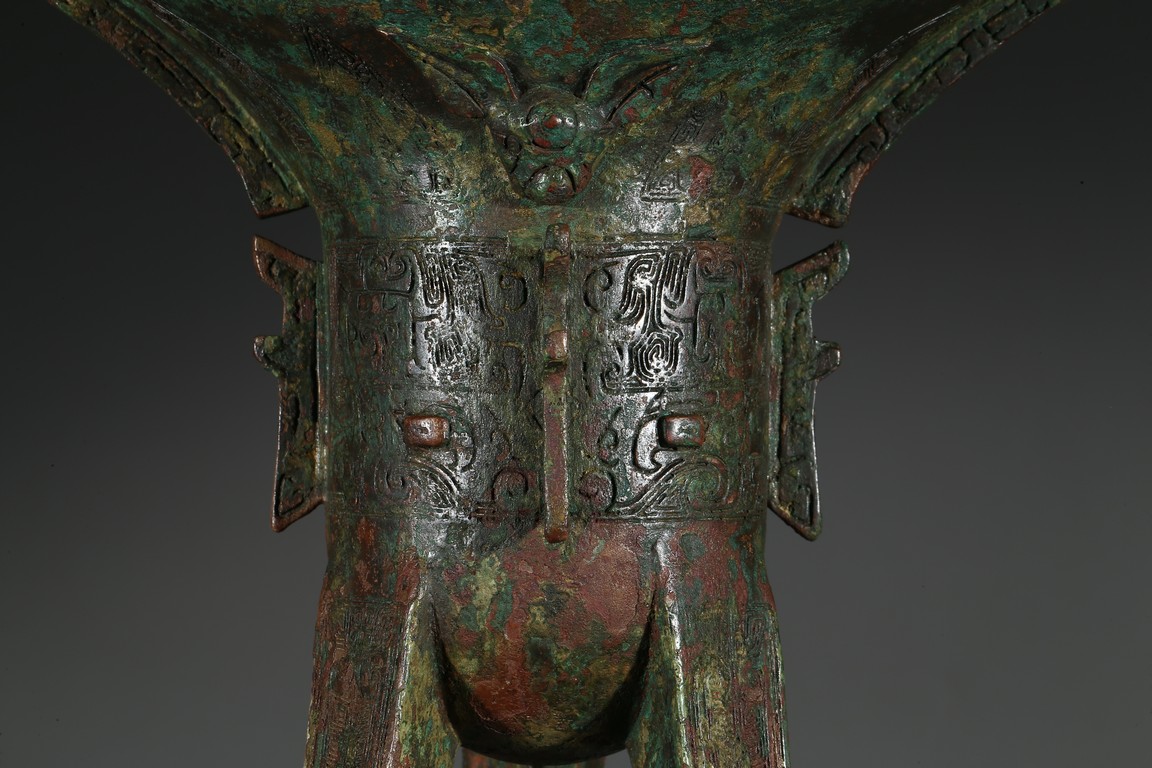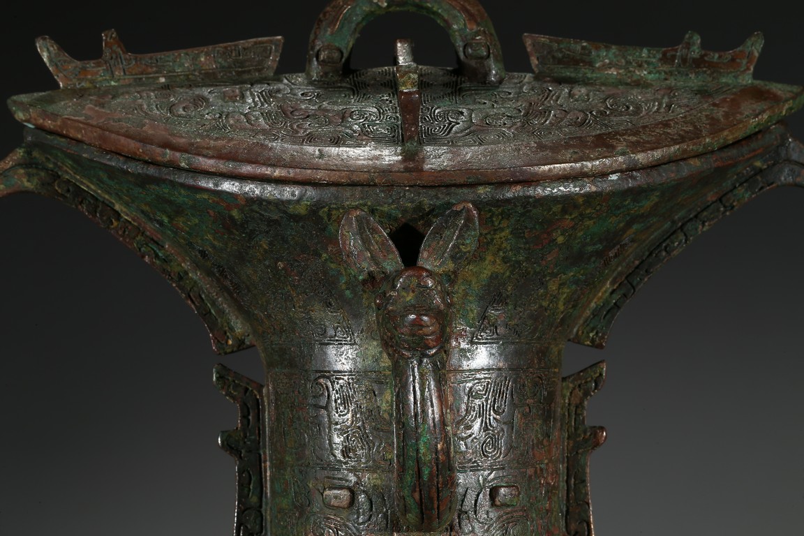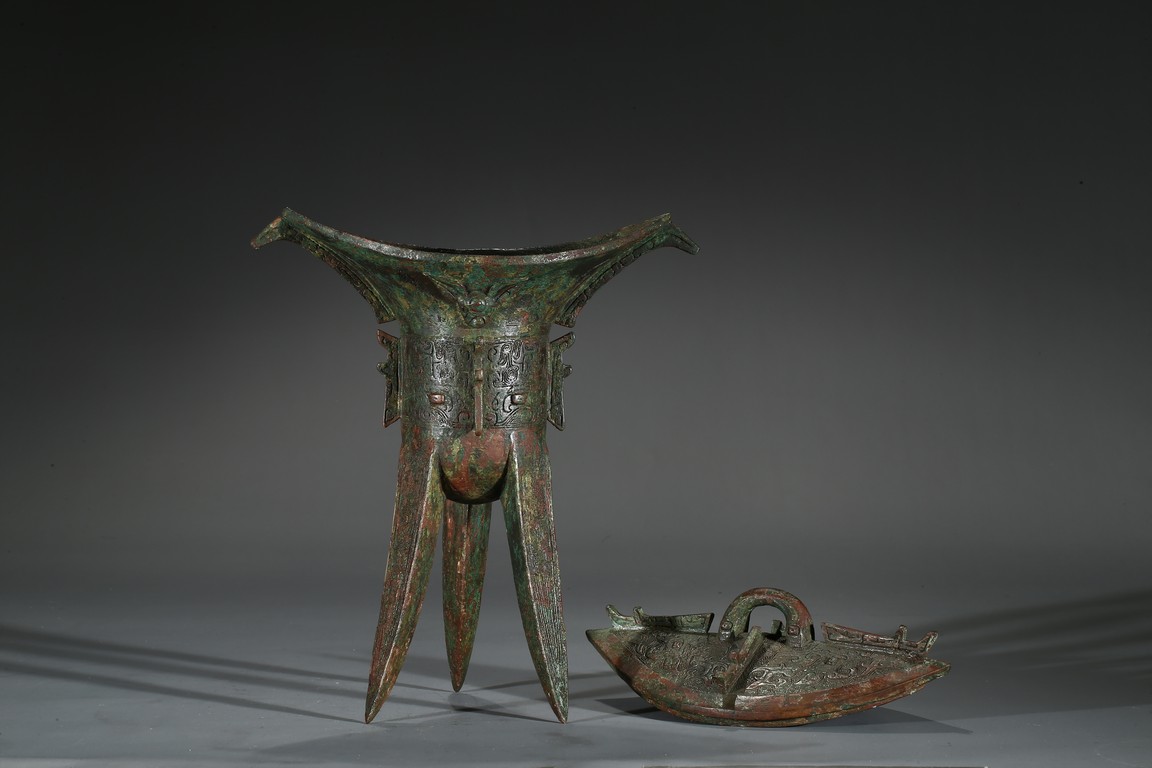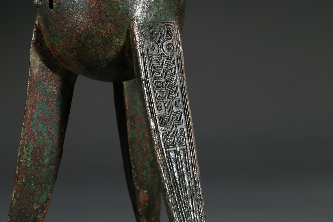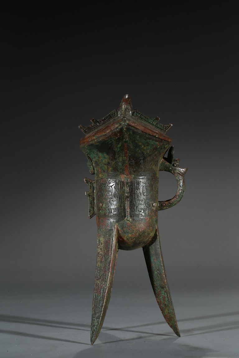 Provenance: Property from an important private Southern California collection 青銅蓋,流部寬厚上翹,杯體為圓卵形,腹部出脊,三足作等腰三角形分佈外撇,給人以穩定感。腹部裝飾以雲雷紋為地的獸面紋,獸面紋的雙目圓凸。這件青銅爵的鑄造工藝成熟完善,器型規整,紋飾的裝飾頗為精緻,為典型的中國古代器物。 來源:南加州私人收藏