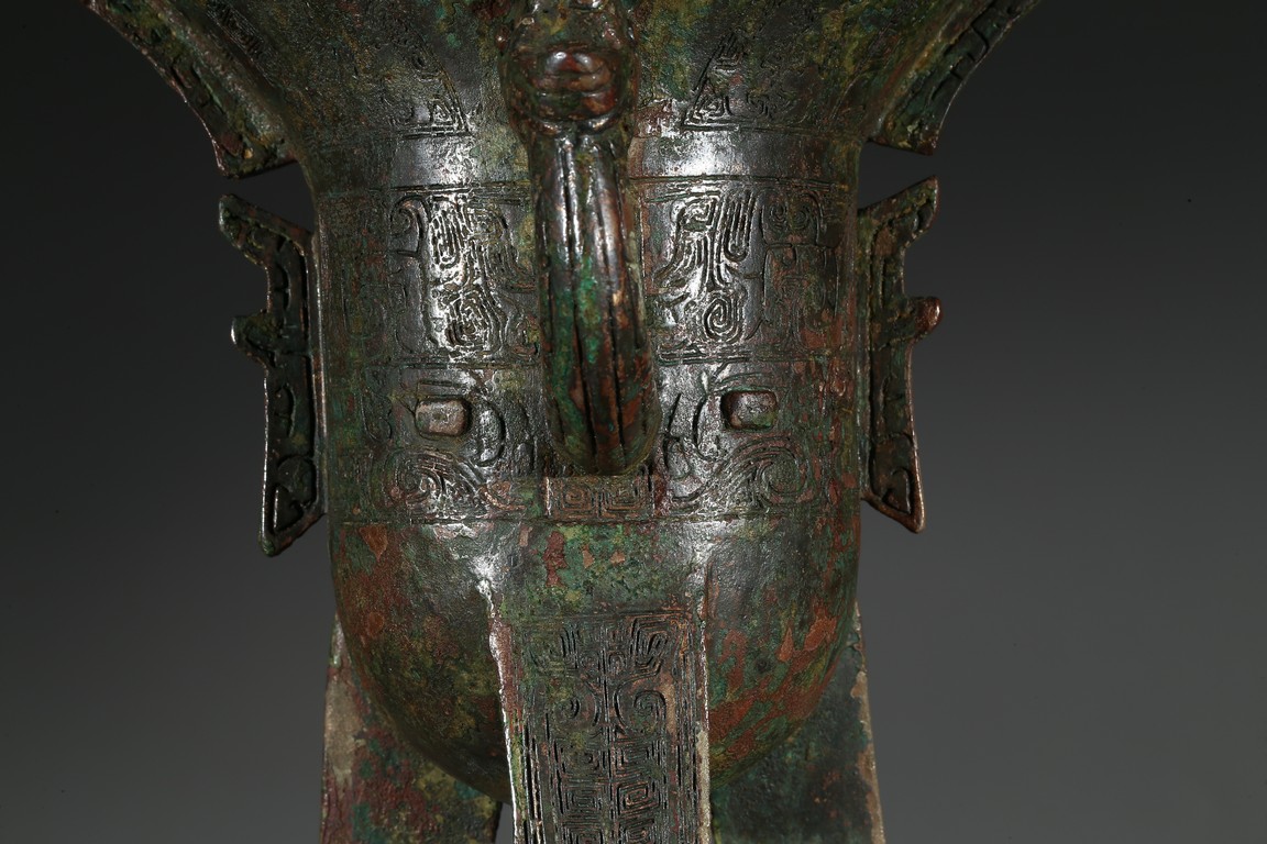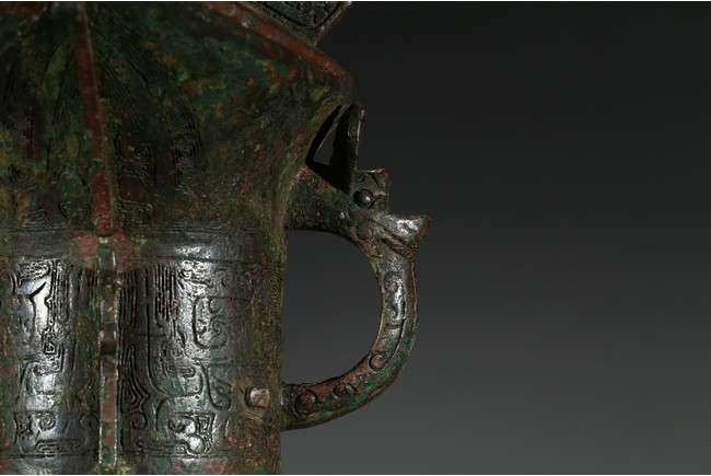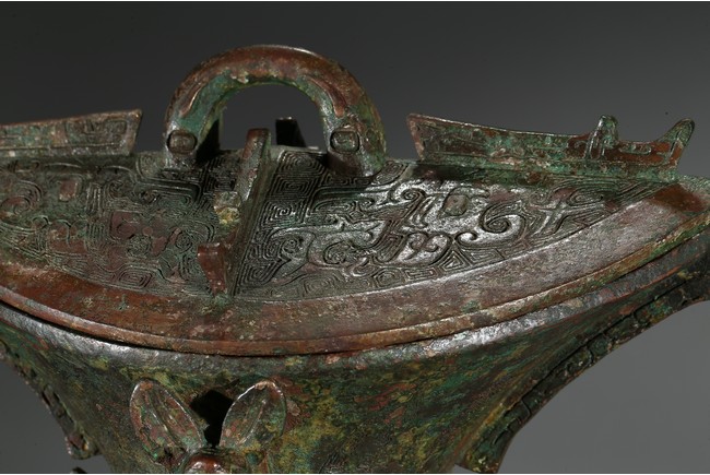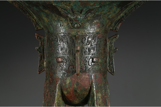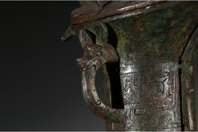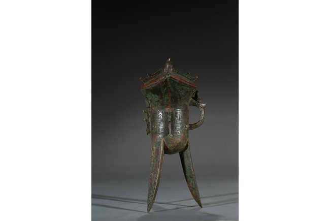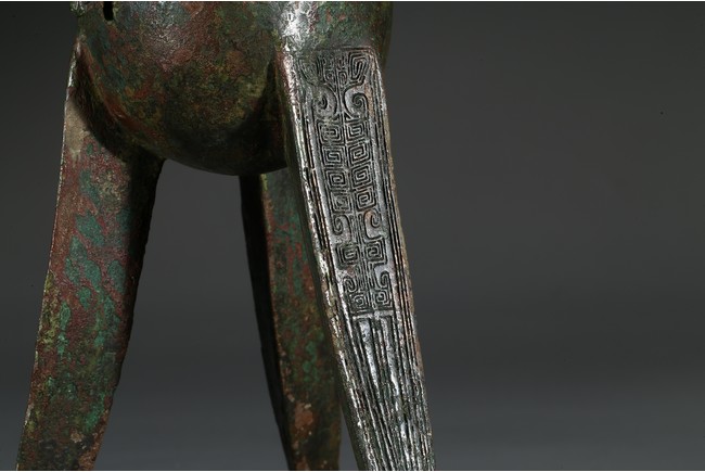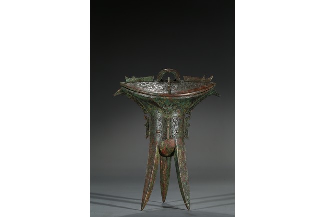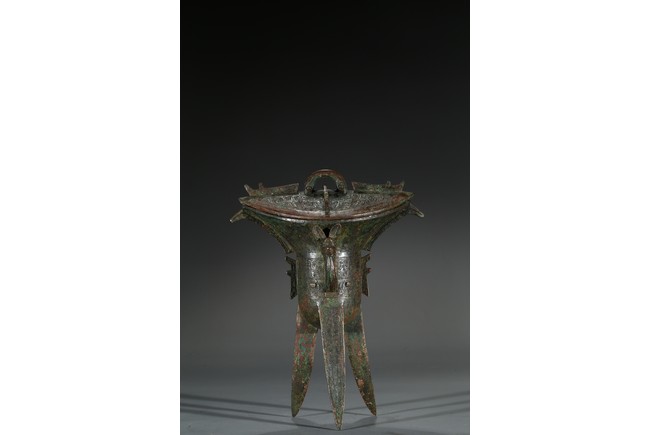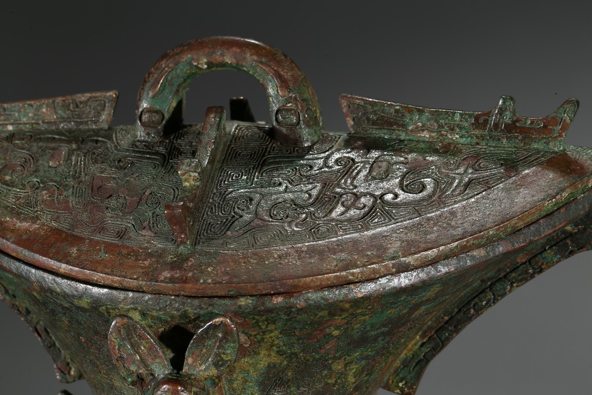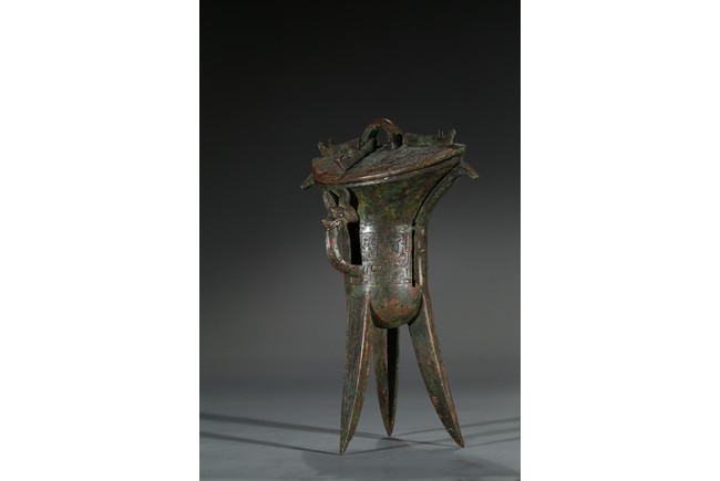 Provenance: Property from an important private Southern California collection 青銅蓋,流部寬厚上翹,杯體為圓卵形,腹部出脊,三足作等腰三角形分佈外撇,給人以穩定感。腹部裝飾以雲雷紋為地的獸面紋,獸面紋的雙目圓凸。這件青銅爵的鑄造工藝成熟完善,器型規整,紋飾的裝飾頗為精緻,為典型的中國古代器物。 來源:南加州私人收藏