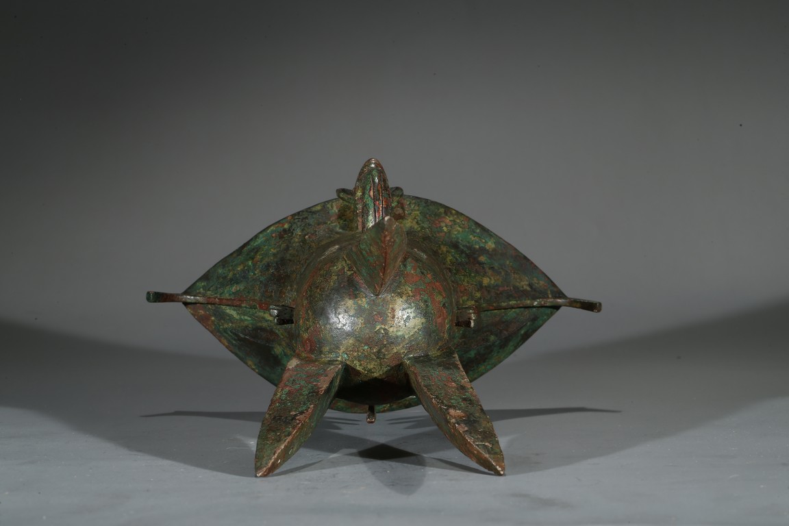 Cast with a deep U-shaped body encircled with a taotie band, interrupted by three crest-shaped flanges, with a loop handle issuing from the mouth of an animal head, the flared neck rising to form the pouring spout and exaggerated lip, fitted with a cover cast with two pairs of opposing flanges, all supported on three blade-form legs. Song Dynasty period.