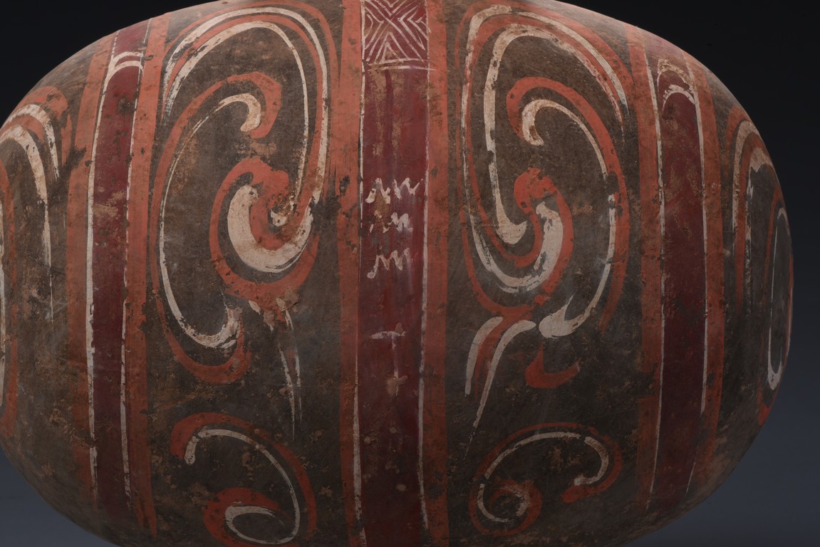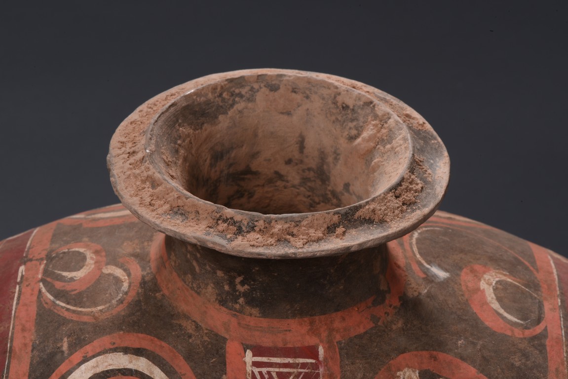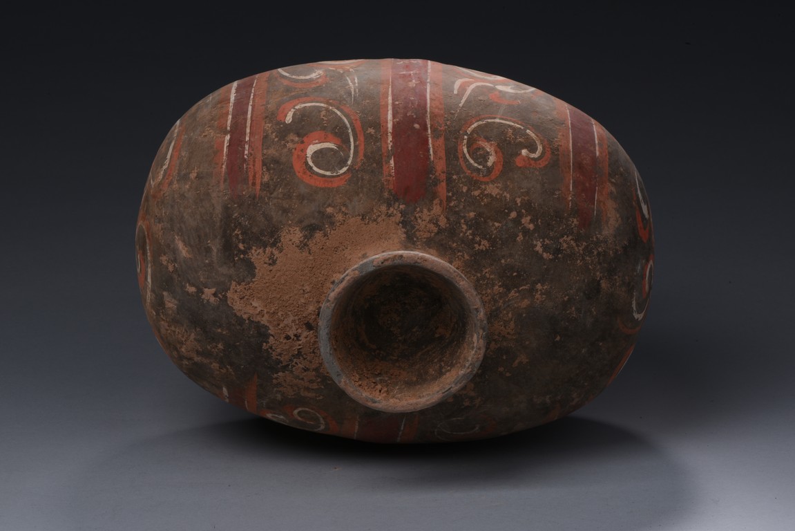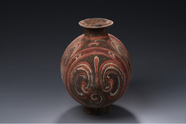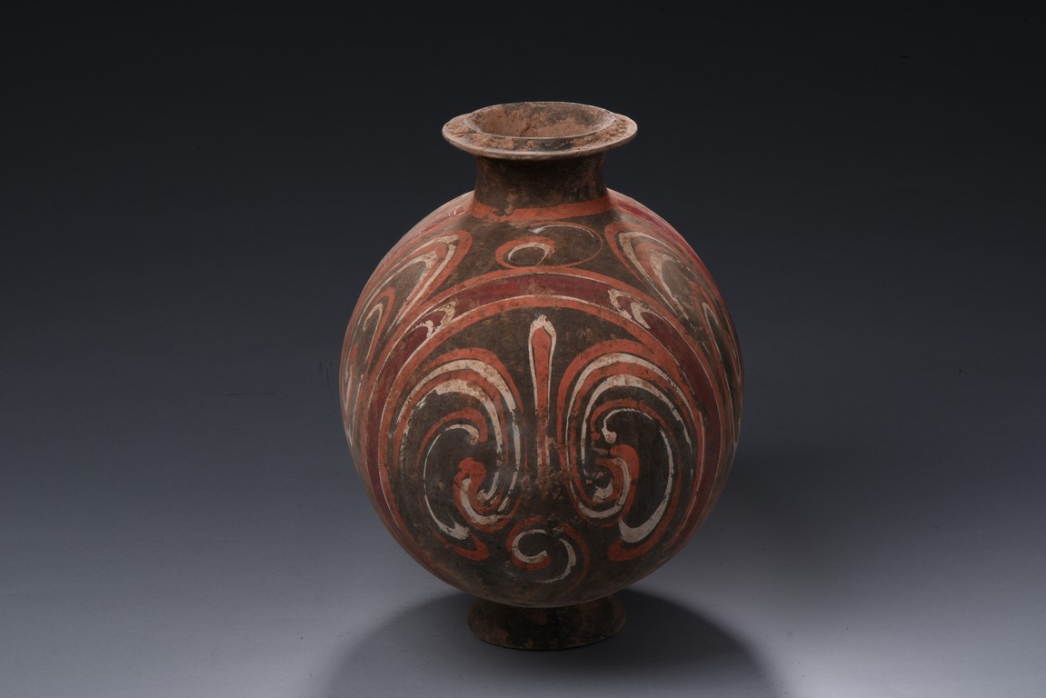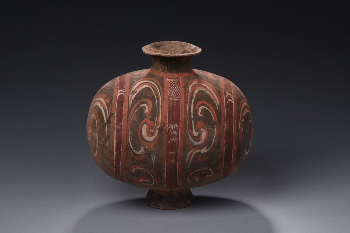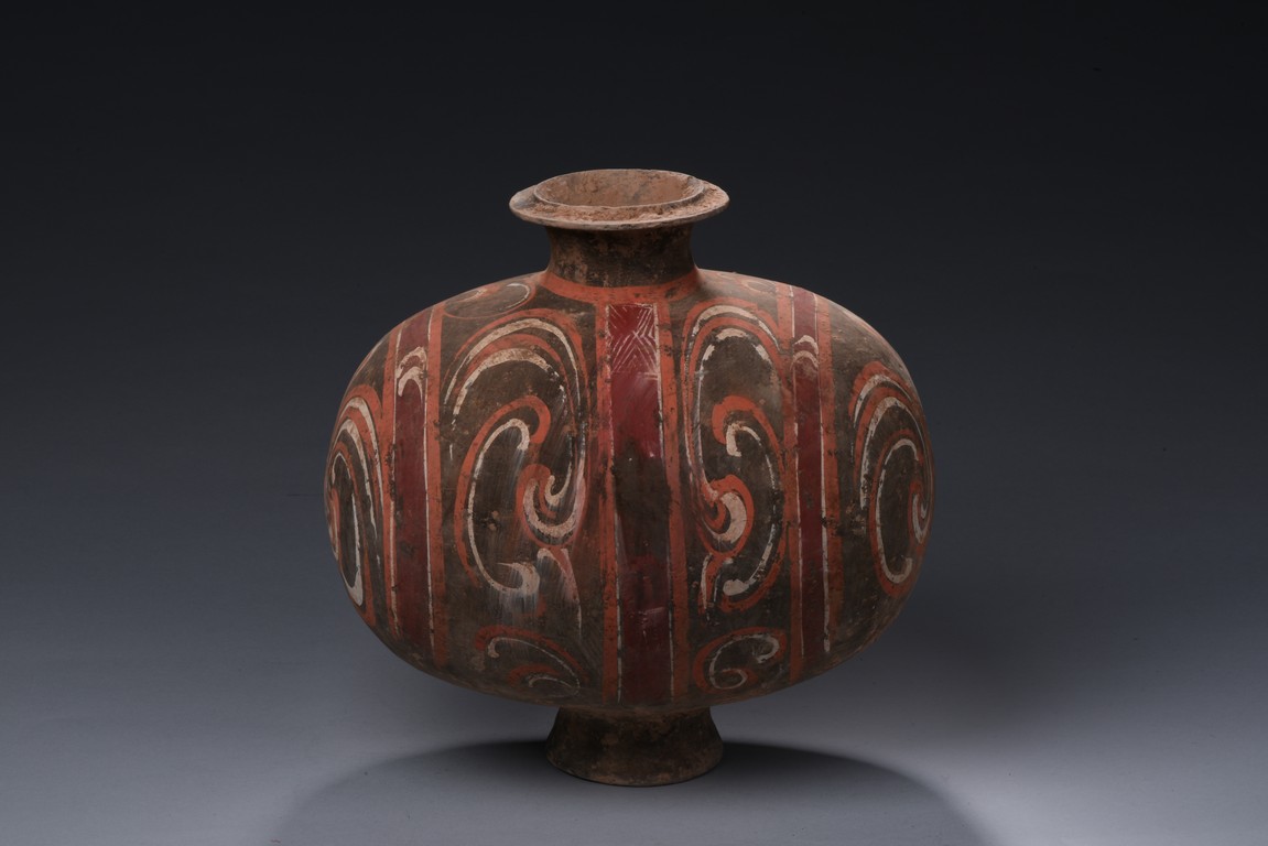 Of slightly flattened globular form,rising from a small splayed foot to a short cylindrical neck with everted rim,the exterior with large stylized bands of geometric pattern in dark red,orange,white and black tone. Possibly Han Dynasty