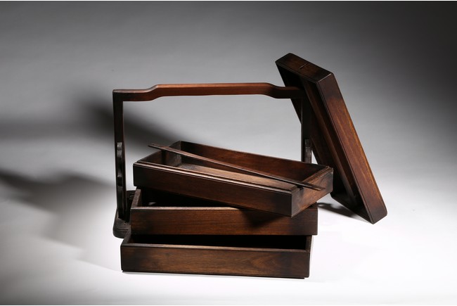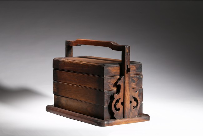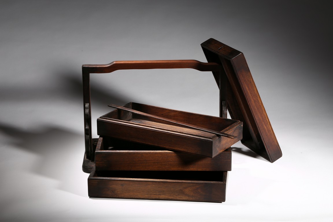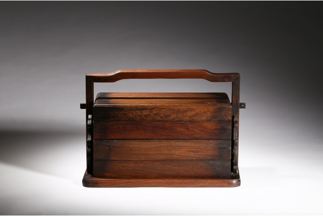 Of rectangular form,comprising a cover and three trays,each conforming to the tray above,set on a base frame of square-section posts and side posts. 18th Century