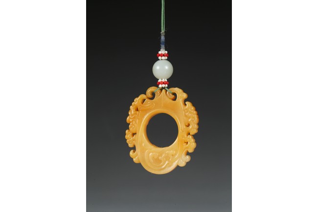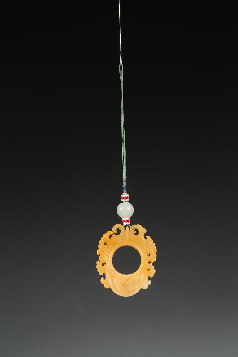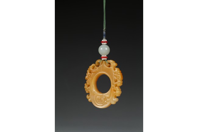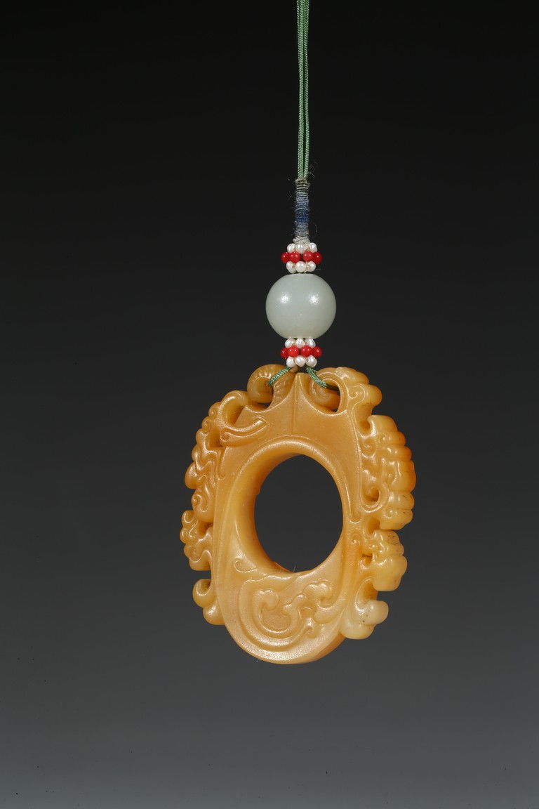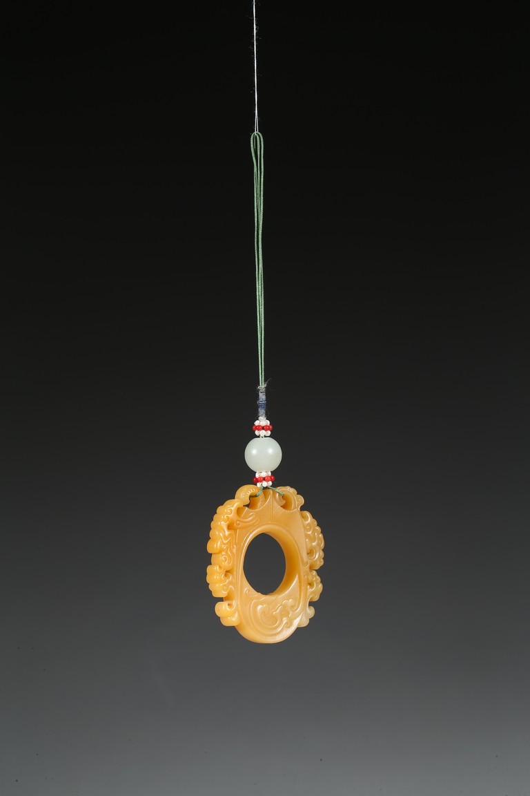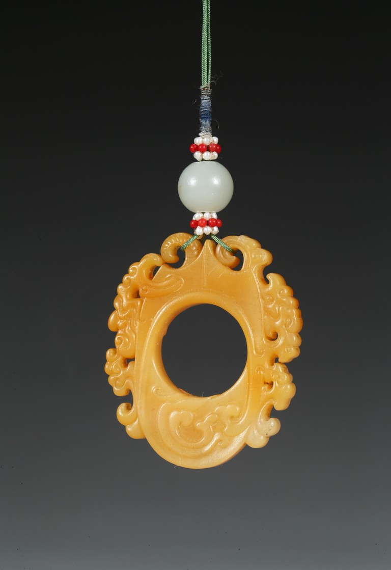 The flattened pendant of archaistic 'chicken heart' shaped, the oval shield pierced with a circular aperture and surmounted by a pointed end, wreathed around the sides by flowing cloud scroll motifs, the smoothly polished stone of a rich translucent yellowish orange tone. Qing Dynasty period.