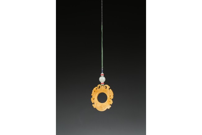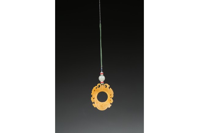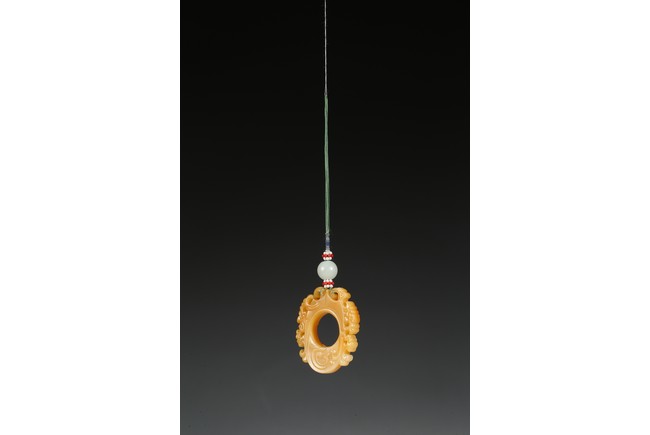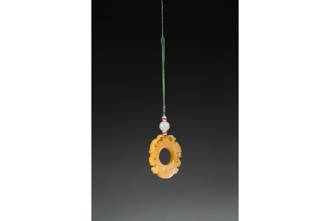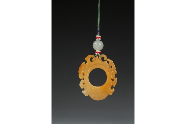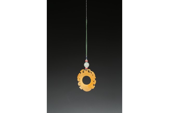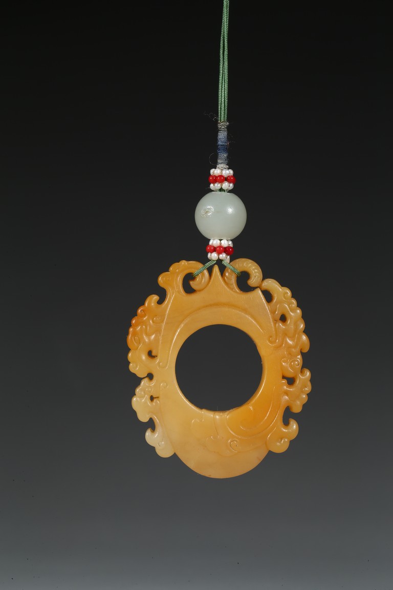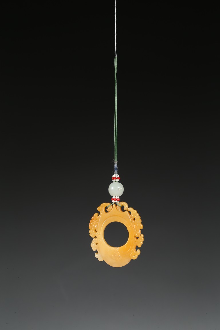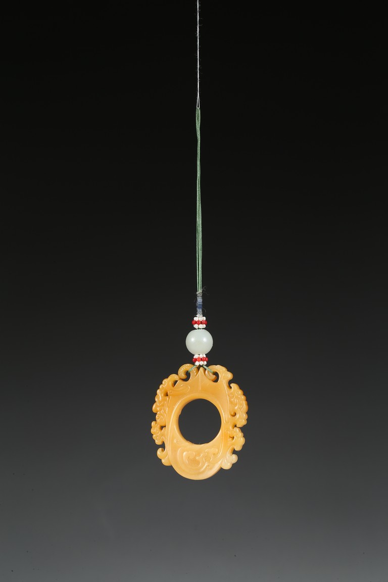 The flattened pendant of archaistic 'chicken heart' shaped, the oval shield pierced with a circular aperture and surmounted by a pointed end, wreathed around the sides by flowing cloud scroll motifs, the smoothly polished stone of a rich translucent yellowish orange tone. Qing Dynasty period.