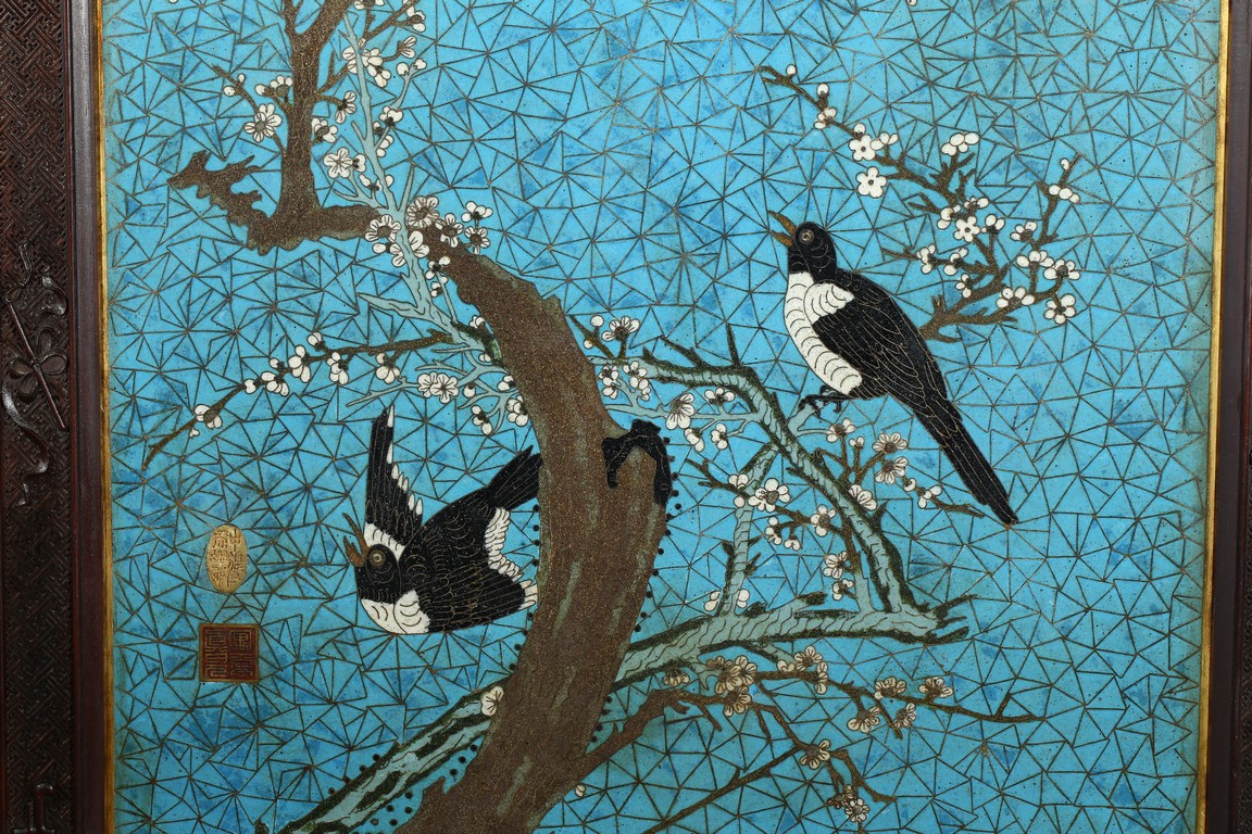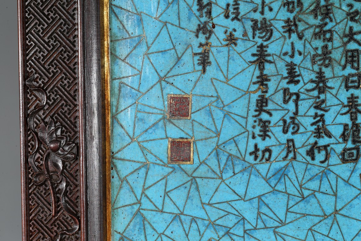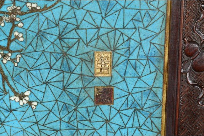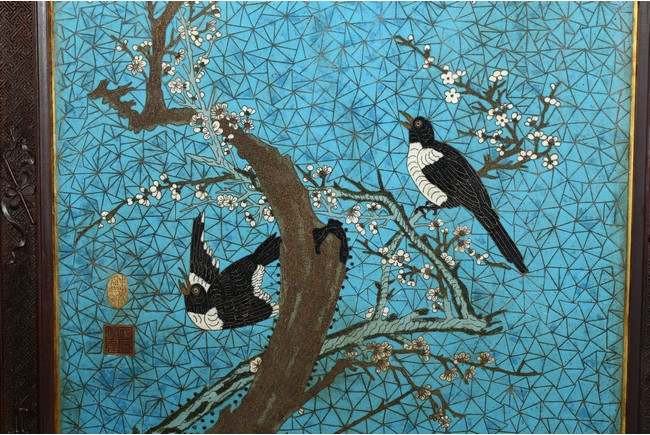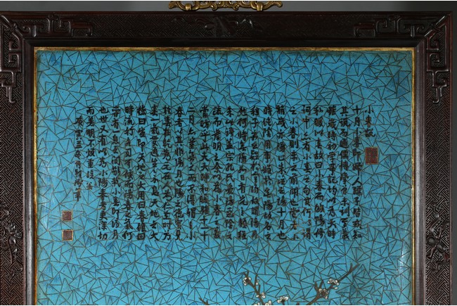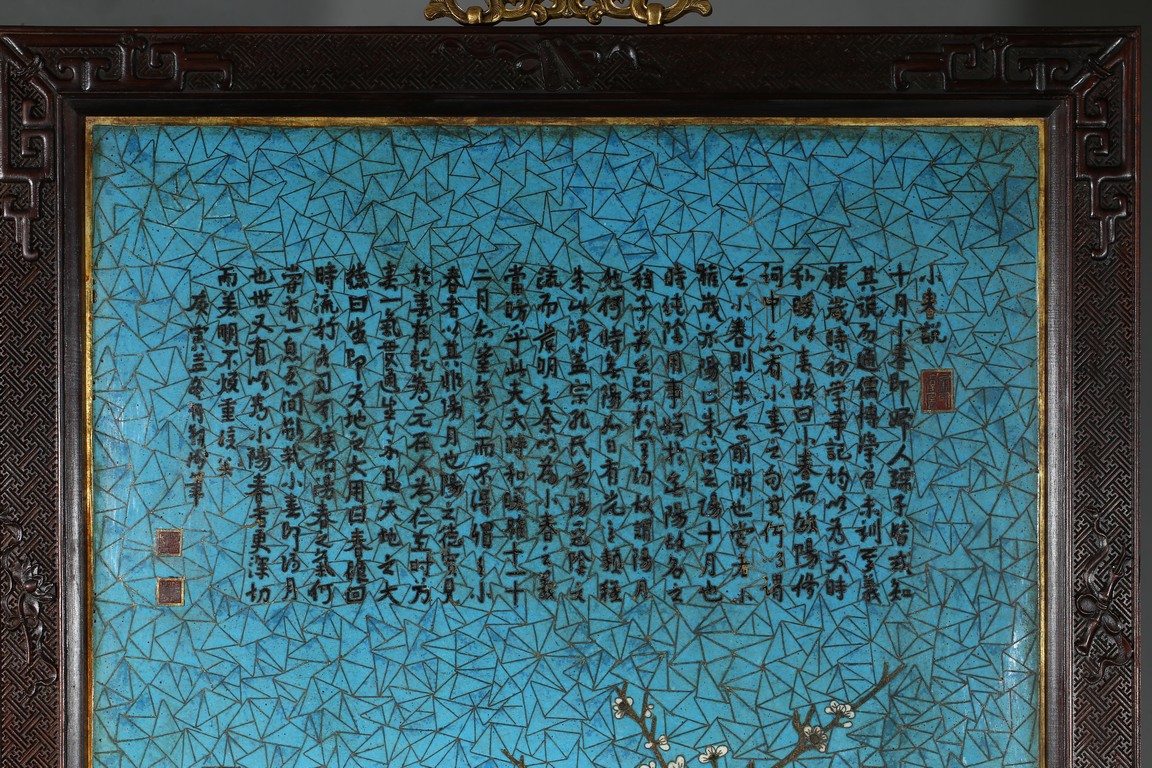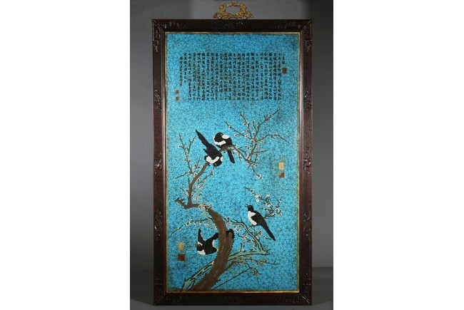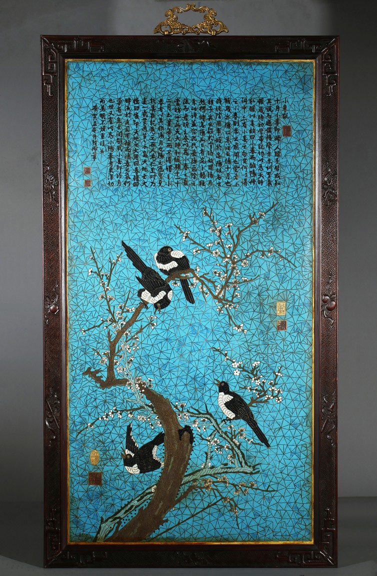 Provenance: Private Dallas, Texas collection 本件器物長方形,體型巨大,通體掐絲琺瑯裝飾,藍色琺瑯釉為地,掐絲“喜鵲登梅”場景,畫面中枝幹伸展,綴滿盛開的花朵和待放的蓓蕾,充分表達了梅花的俯、仰、側、臥、依、盼等形態和直立、曲屈、歪斜的姿勢,難怪古人認為“梅以形勢為第一”。喜鵲獨立枝頭,翹首回盼,又於空中飛舞。梅花盛開,清雅之景躍於眼簾。梅花開於冬春相交之際,喜鵲立於梅花枝上,寓意冬去春來,又寓意“喜上梅(楣)梢”,即有喜事臨門之意。有“小春說”詩文與主題相呼應。本掛屏實屬難能可貴的文人裝飾物。