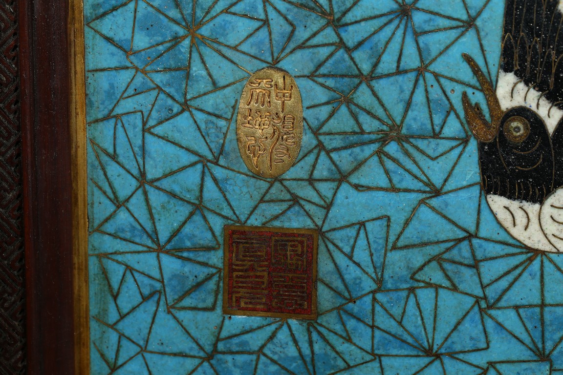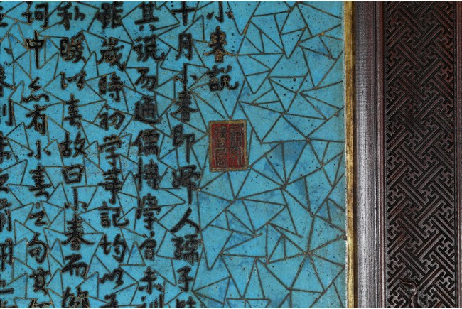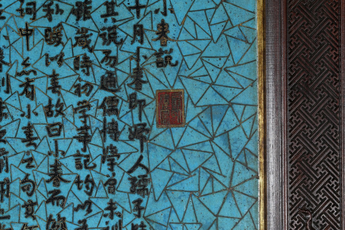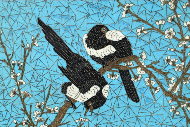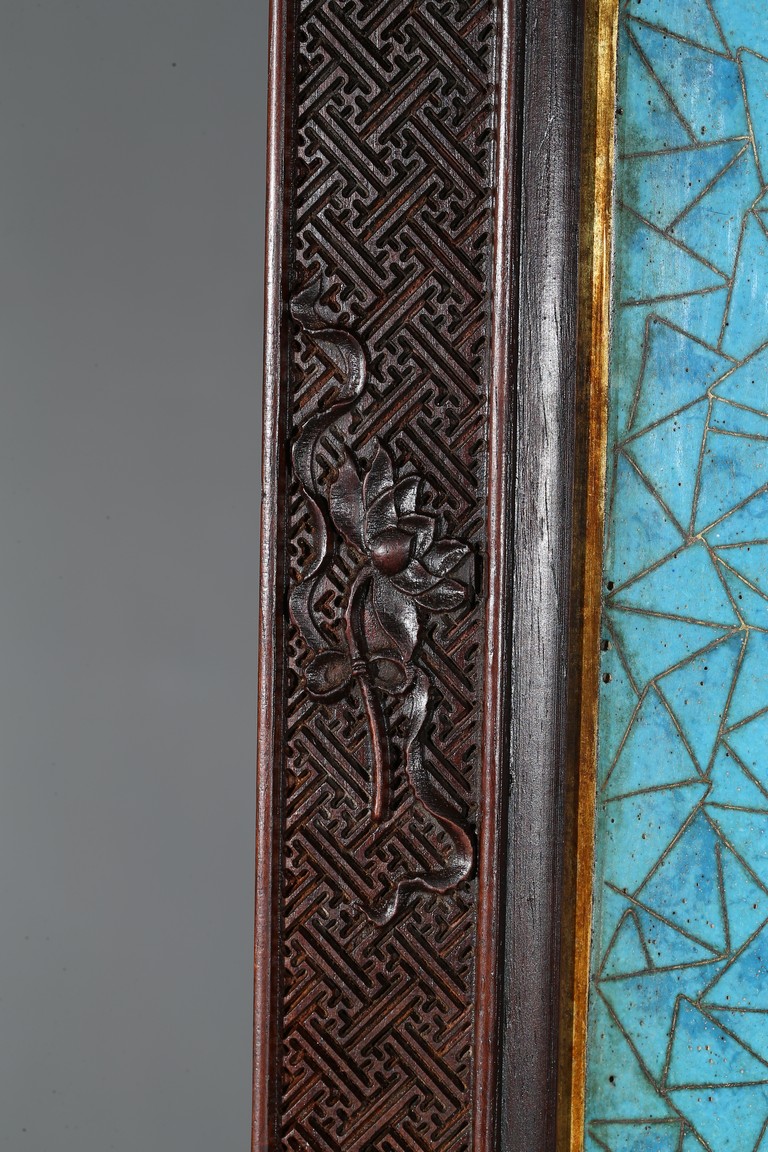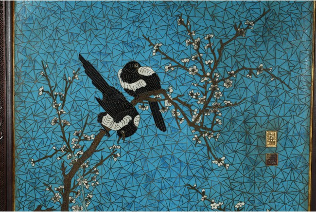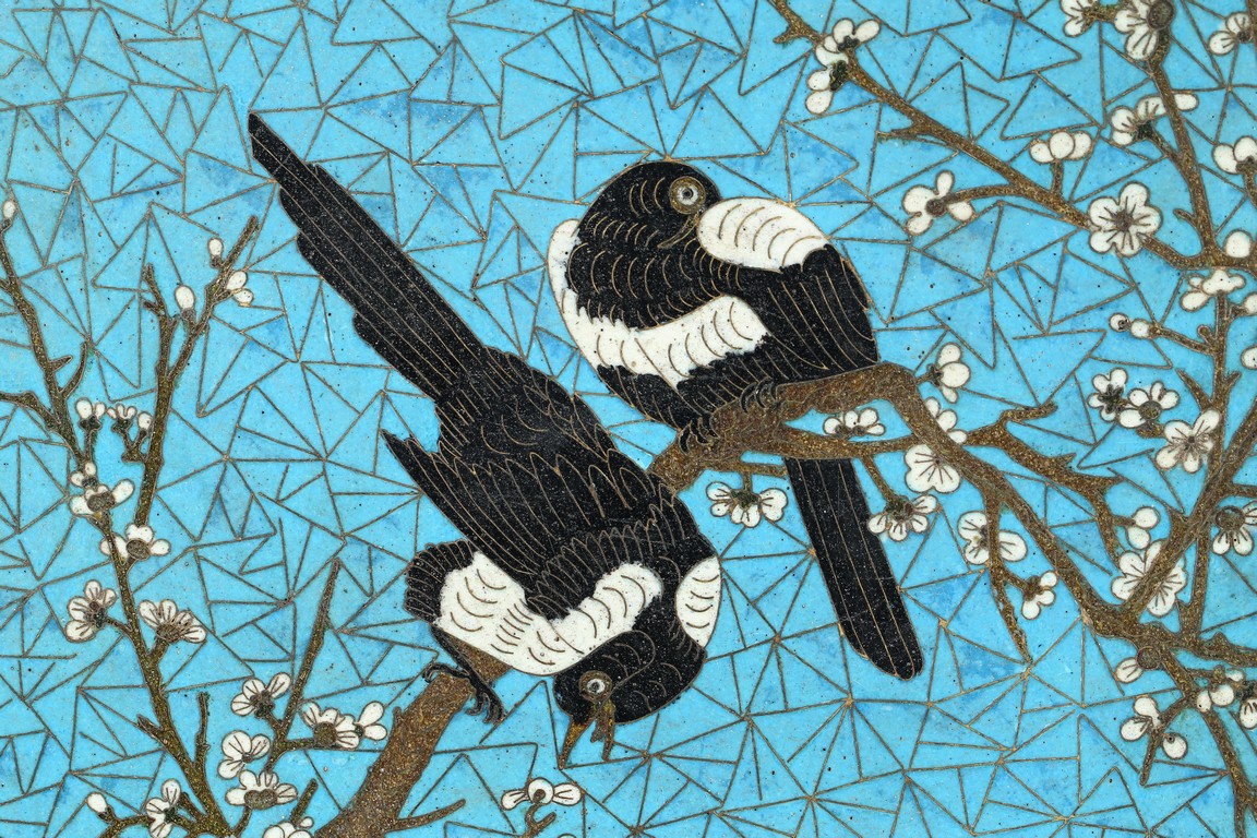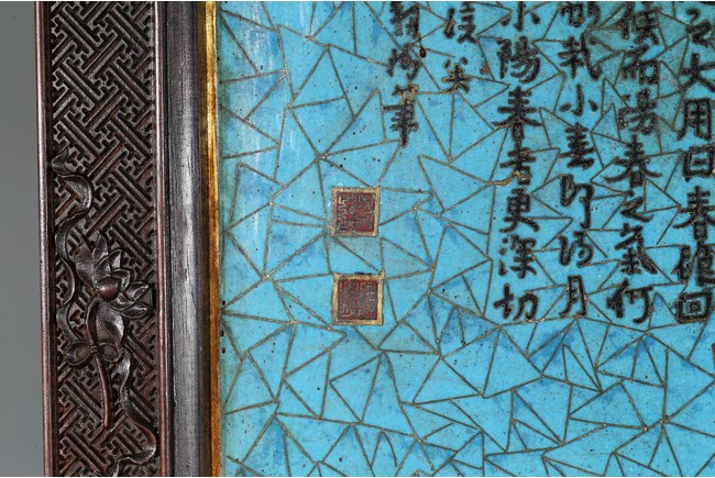 Provenance: Private Dallas, Texas collection 本件器物長方形,體型巨大,通體掐絲琺瑯裝飾,藍色琺瑯釉為地,掐絲“喜鵲登梅”場景,畫面中枝幹伸展,綴滿盛開的花朵和待放的蓓蕾,充分表達了梅花的俯、仰、側、臥、依、盼等形態和直立、曲屈、歪斜的姿勢,難怪古人認為“梅以形勢為第一”。喜鵲獨立枝頭,翹首回盼,又於空中飛舞。梅花盛開,清雅之景躍於眼簾。梅花開於冬春相交之際,喜鵲立於梅花枝上,寓意冬去春來,又寓意“喜上梅(楣)梢”,即有喜事臨門之意。有“小春說”詩文與主題相呼應。本掛屏實屬難能可貴的文人裝飾物。